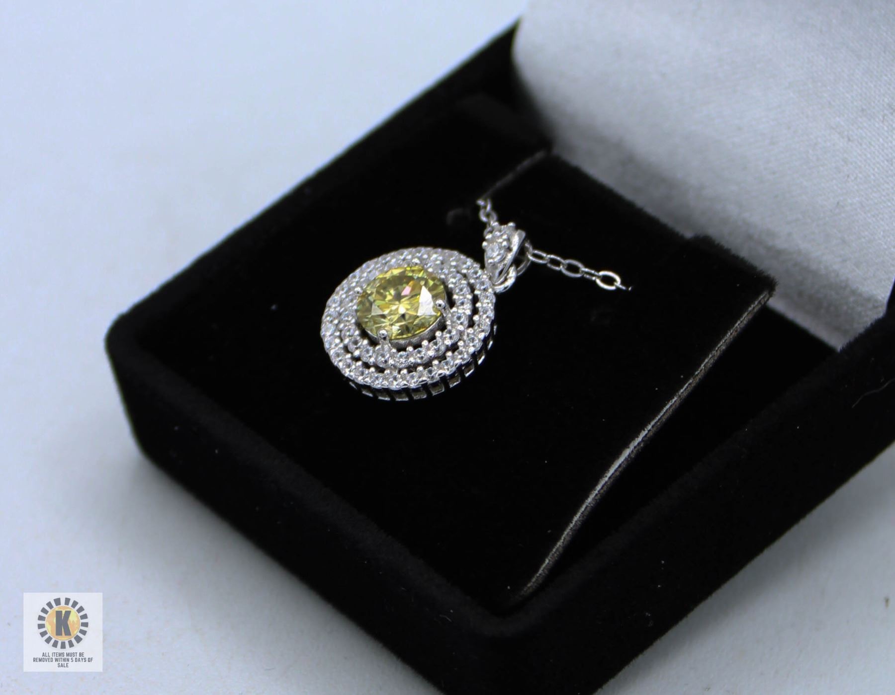 BRILLIANT CUT MOISSANITE STONE VVS FANCY YELLOW COLOR WITH 50 ROUND BRILLIANT CUT CUBIC ZIRCONIA SET DUAL HALOS AROUND CENTER WITH SOME IN BALE SET IN 925 SILVER PENDANT RETAIL VALUE $875.00