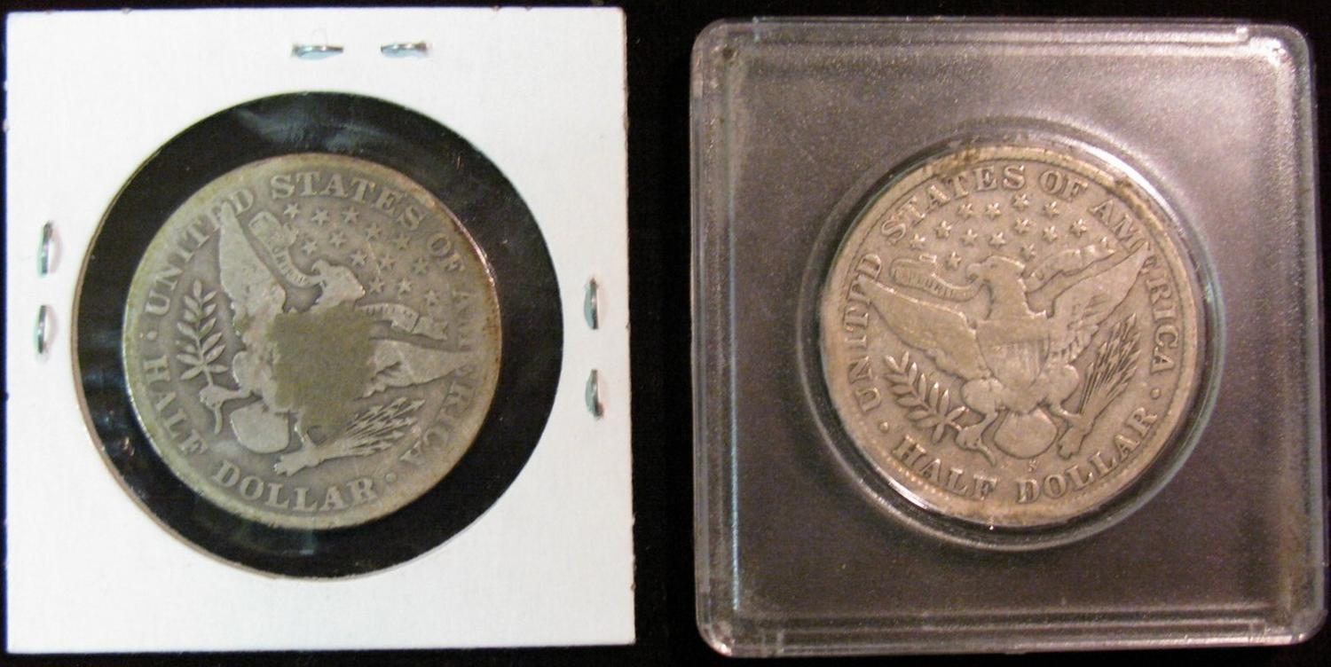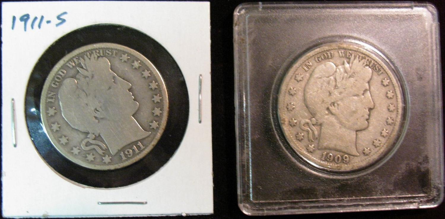 1238. 1909S F, 1911S G+ Gunk Stuck to the Back Barber Half Dollars.