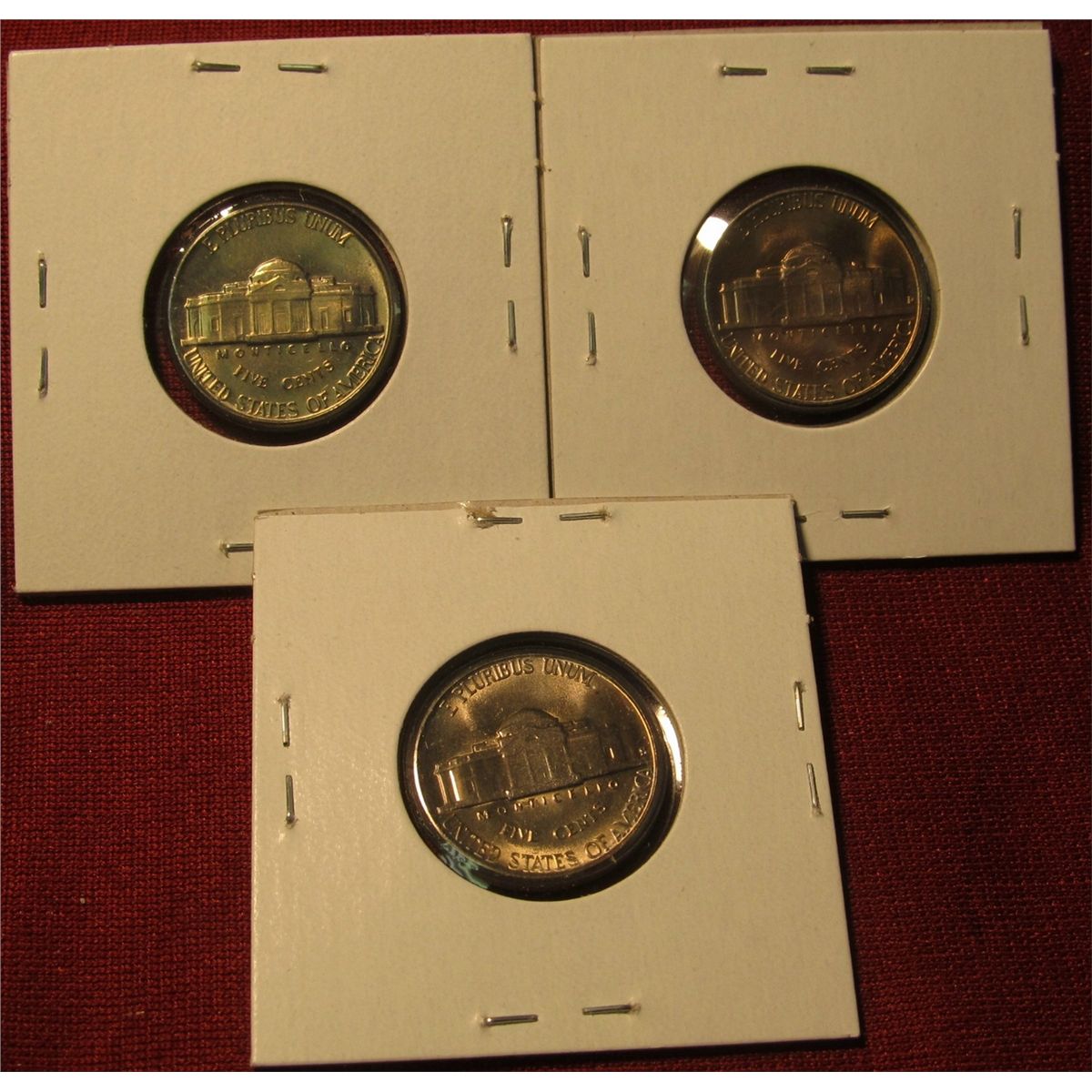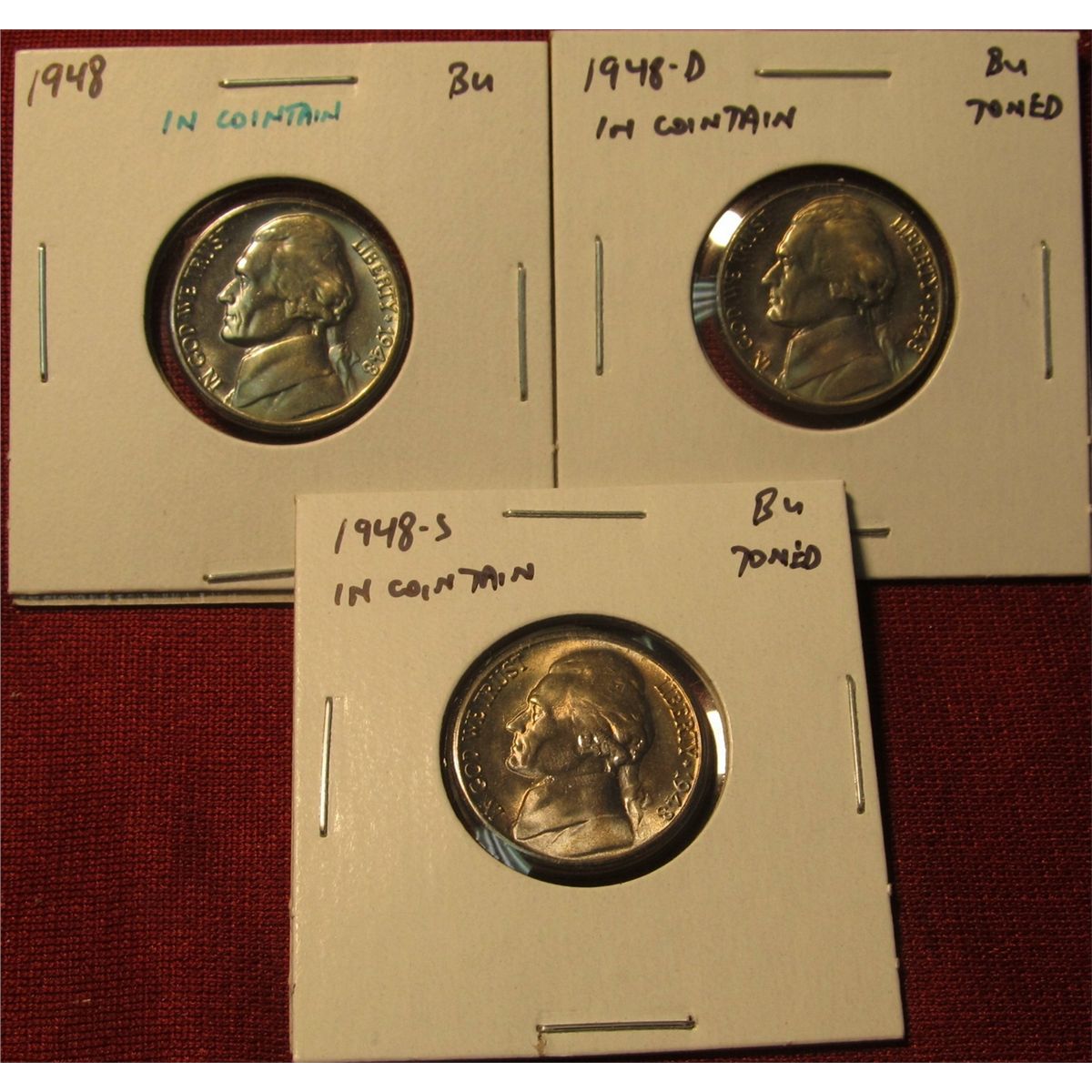 1238. 3 Jefferson Nickels – 1948 BU , 1948 DS, both BU toned, part of set break, all in Cointains
