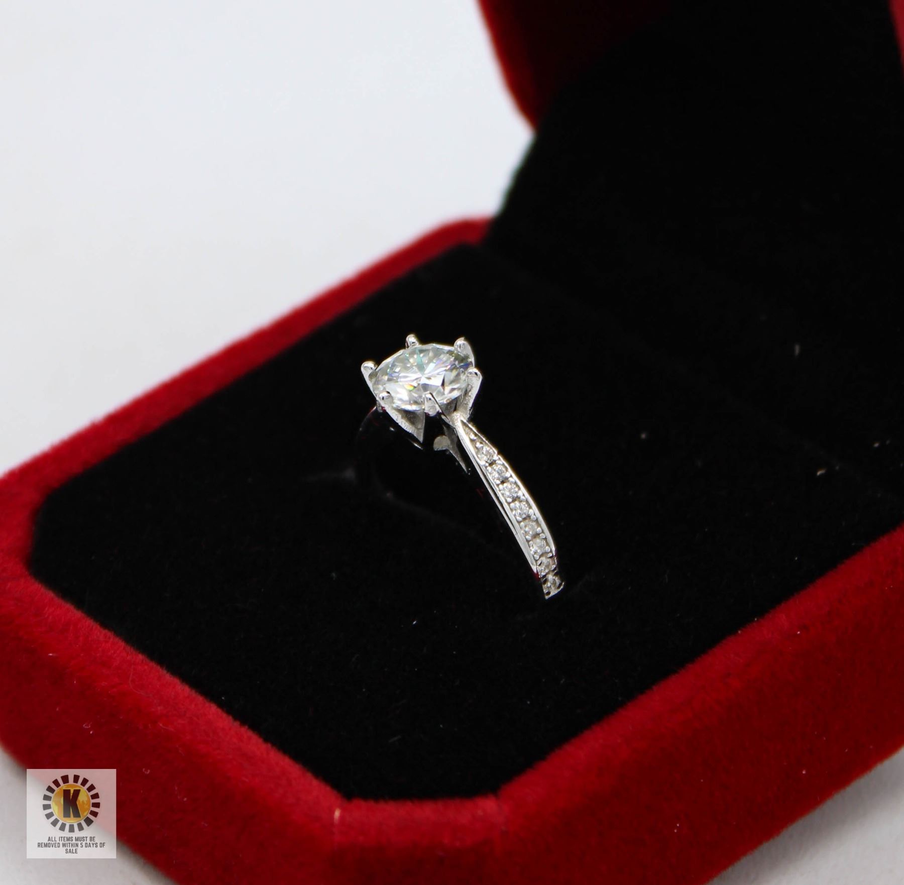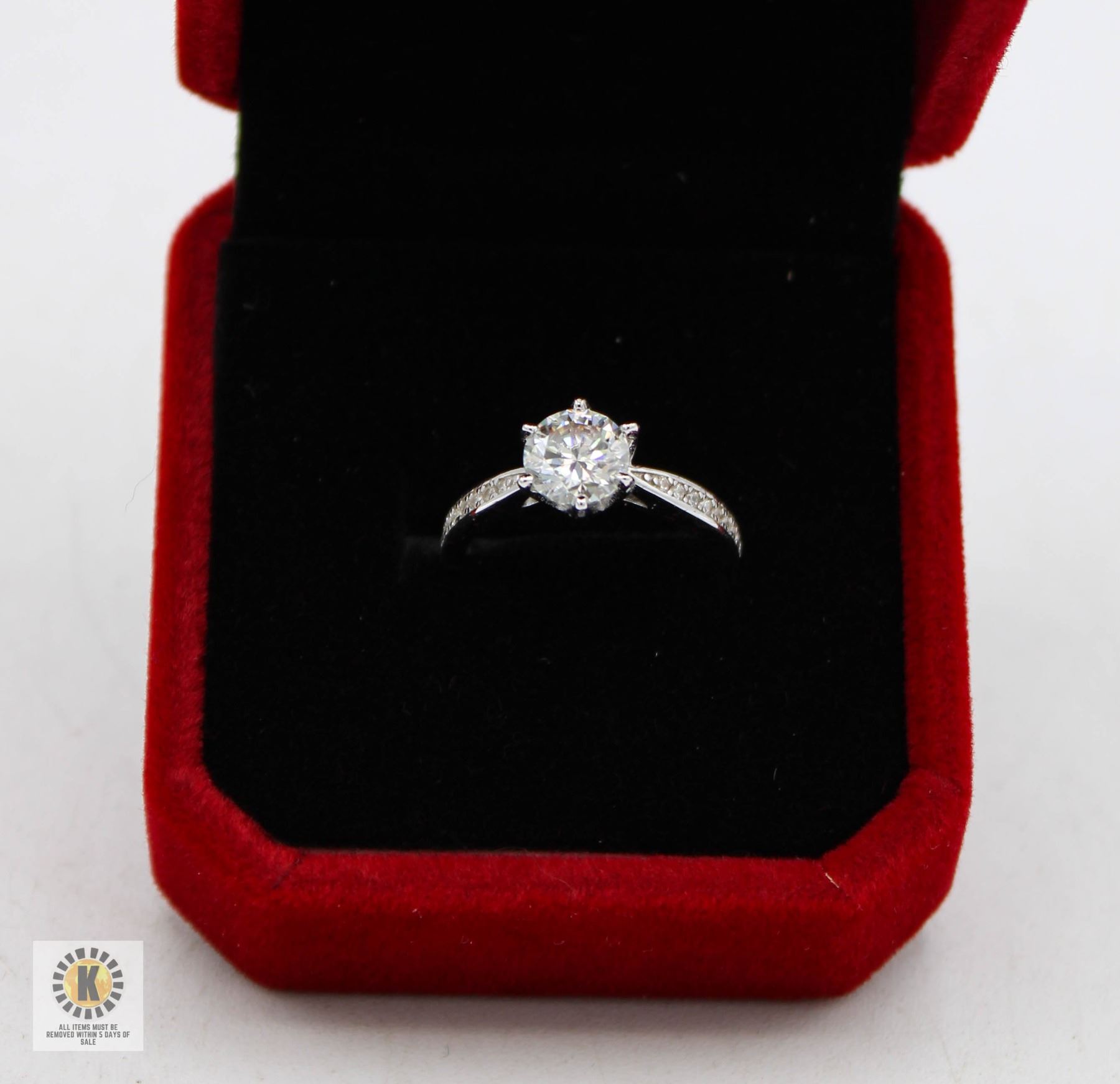 CUT MOISSANITE STONE VVS D COLOR SET IN CENTER WITH 16 ROUND BRILLIANT CUT CUBIC ZIRCONIA?S SET IN SHANKS SET IN 925 SILVER RING SIZE 5