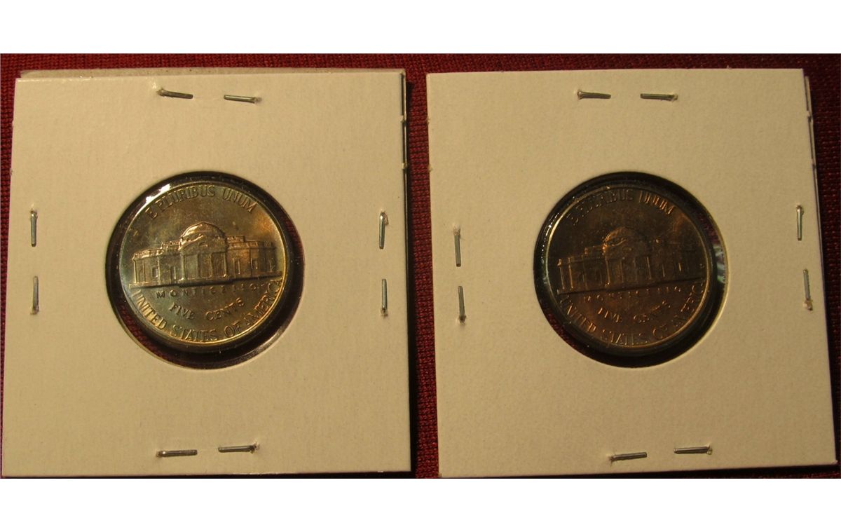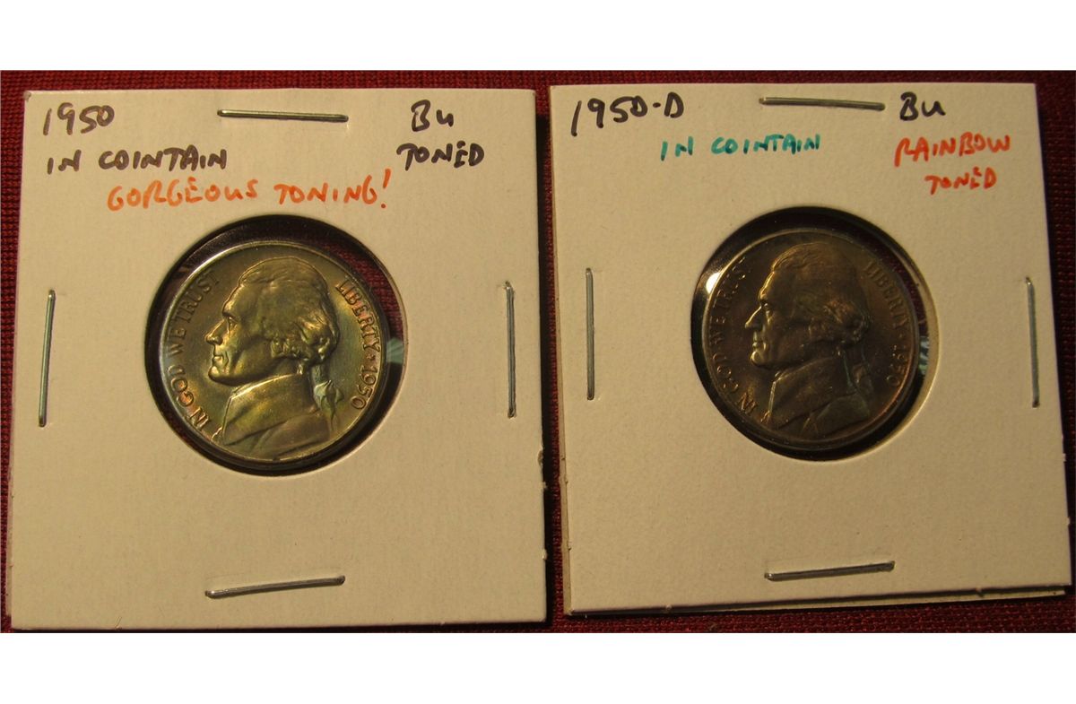 1240. 2 Jefferson Nickels – 1950 PD, both BU with gorgeous rainbow toning, part of set break, all in Cointains