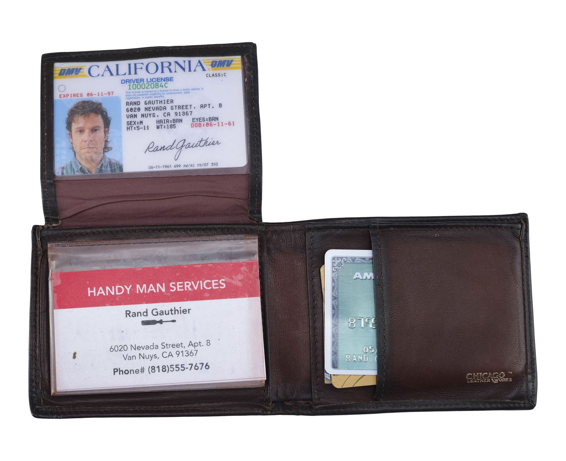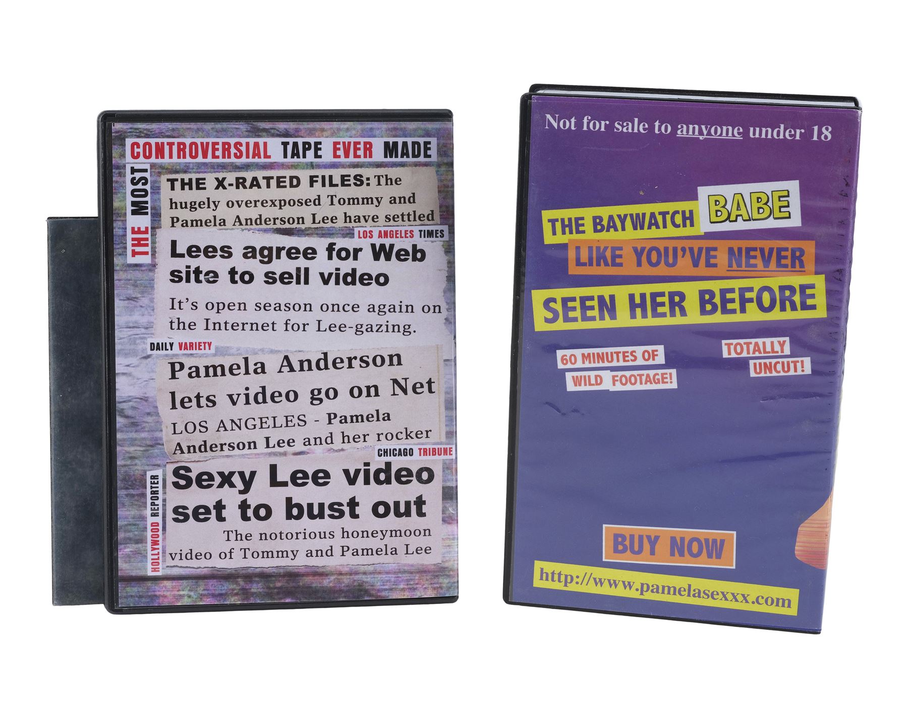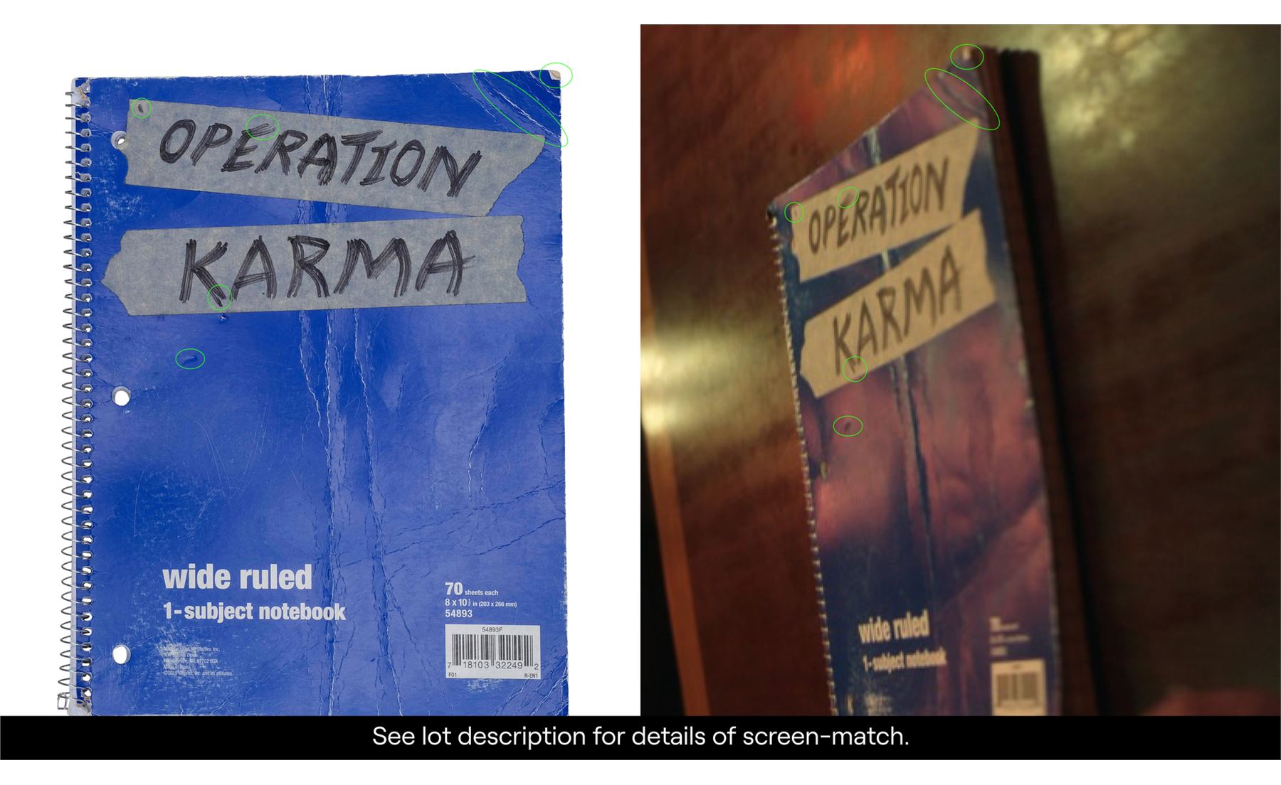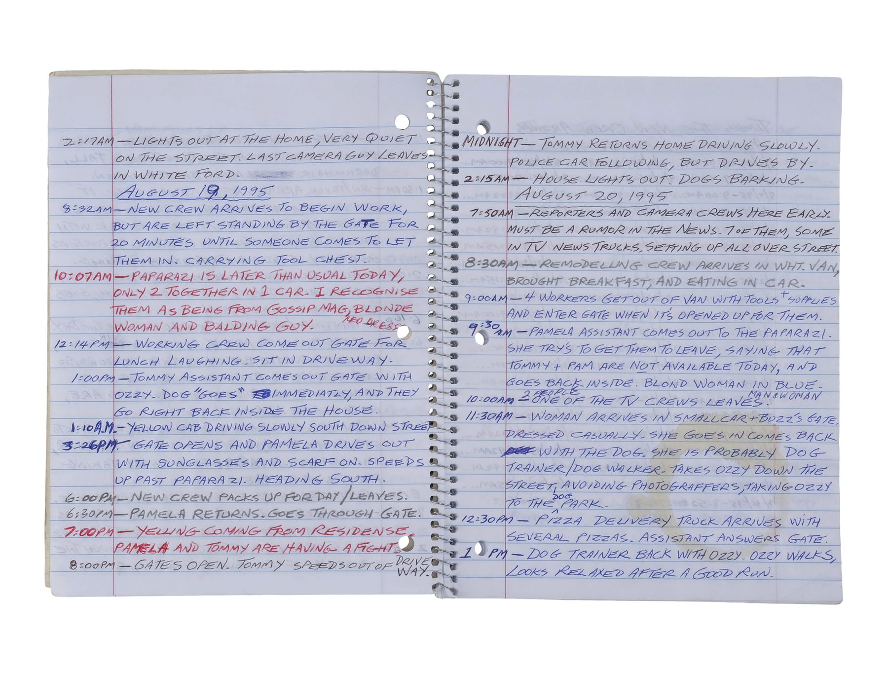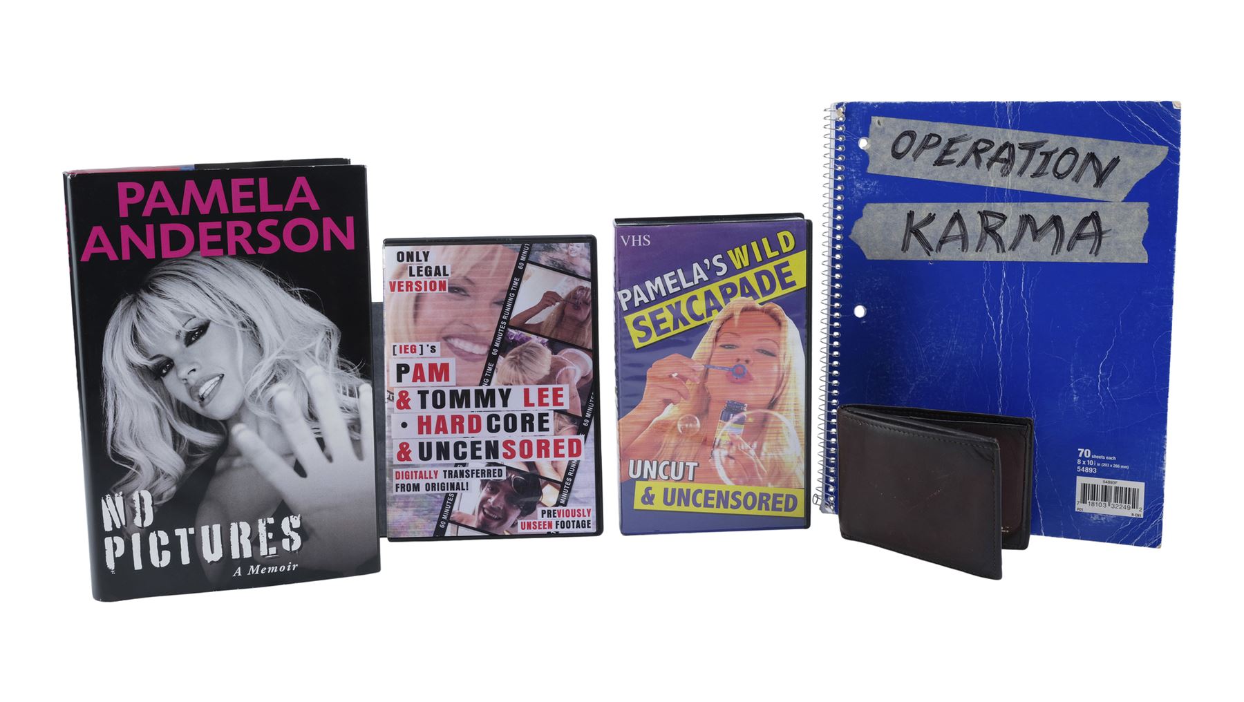 This lot consists of a brown leather wallet; a production-distressed, blue spiral-bound notebook labeled "Operation Karma" and filled with handwritten notes and a hand-drawn diagram; an empty black plastic VHS case with a purple "Pamela's Wild Sexcapade" cover; an empty black plastic DVD case with a cover labeling it as IEG's "Only Legal Version" of the video; and a production-made "No Pictures" memoir consisting of a custom printed cover over a copy of Mark Crispen Miller's Cruel and Unusual, which has a signature simulating Anderson's on the first page. The wallet contains Gauthier's license, business cards, credit card, a credit card under "Pamela Anderson", a credit card under "Valley Irons," and a business card for therapist Molly Griswold. The lot exhibits minor wear, including scuffing and edge wear, to all elements. Dimensions: (largest) 10" x 12" x 1" (25.5 cm x 3.5 cm x 2.75 cm)