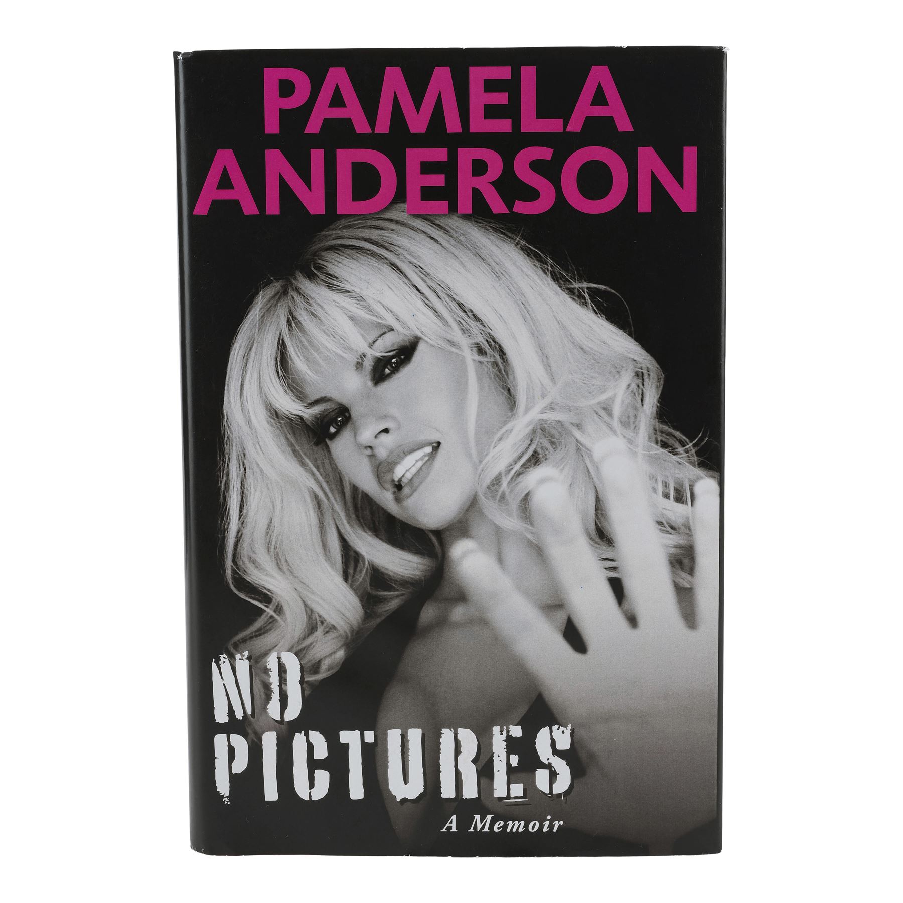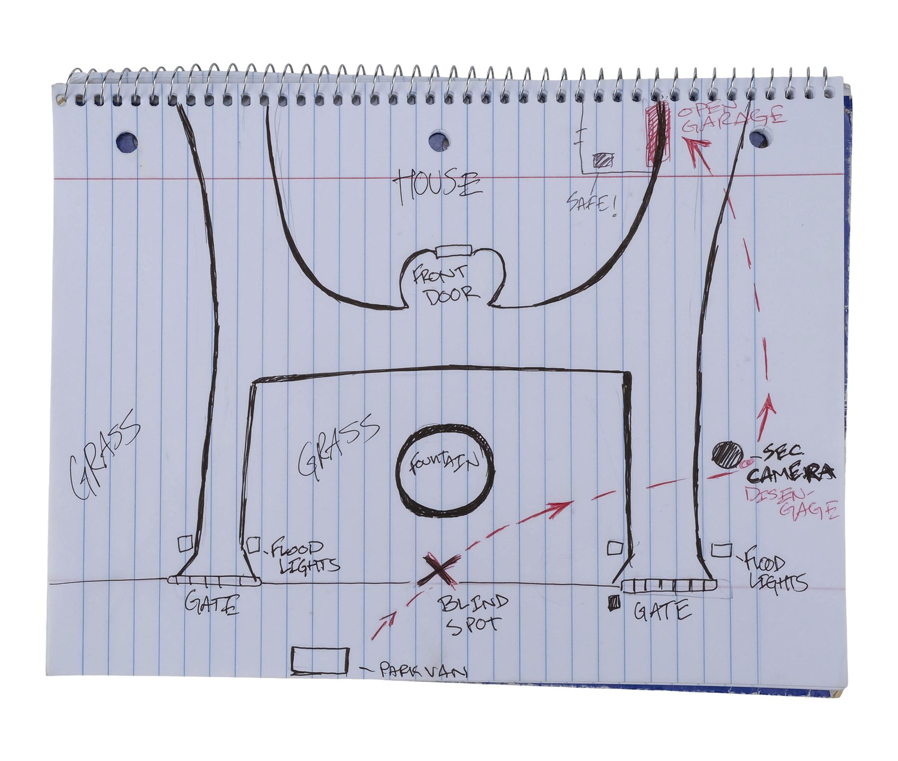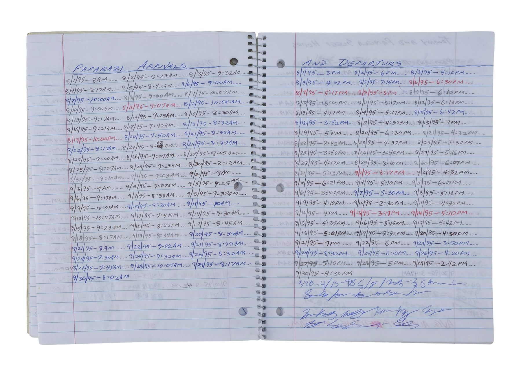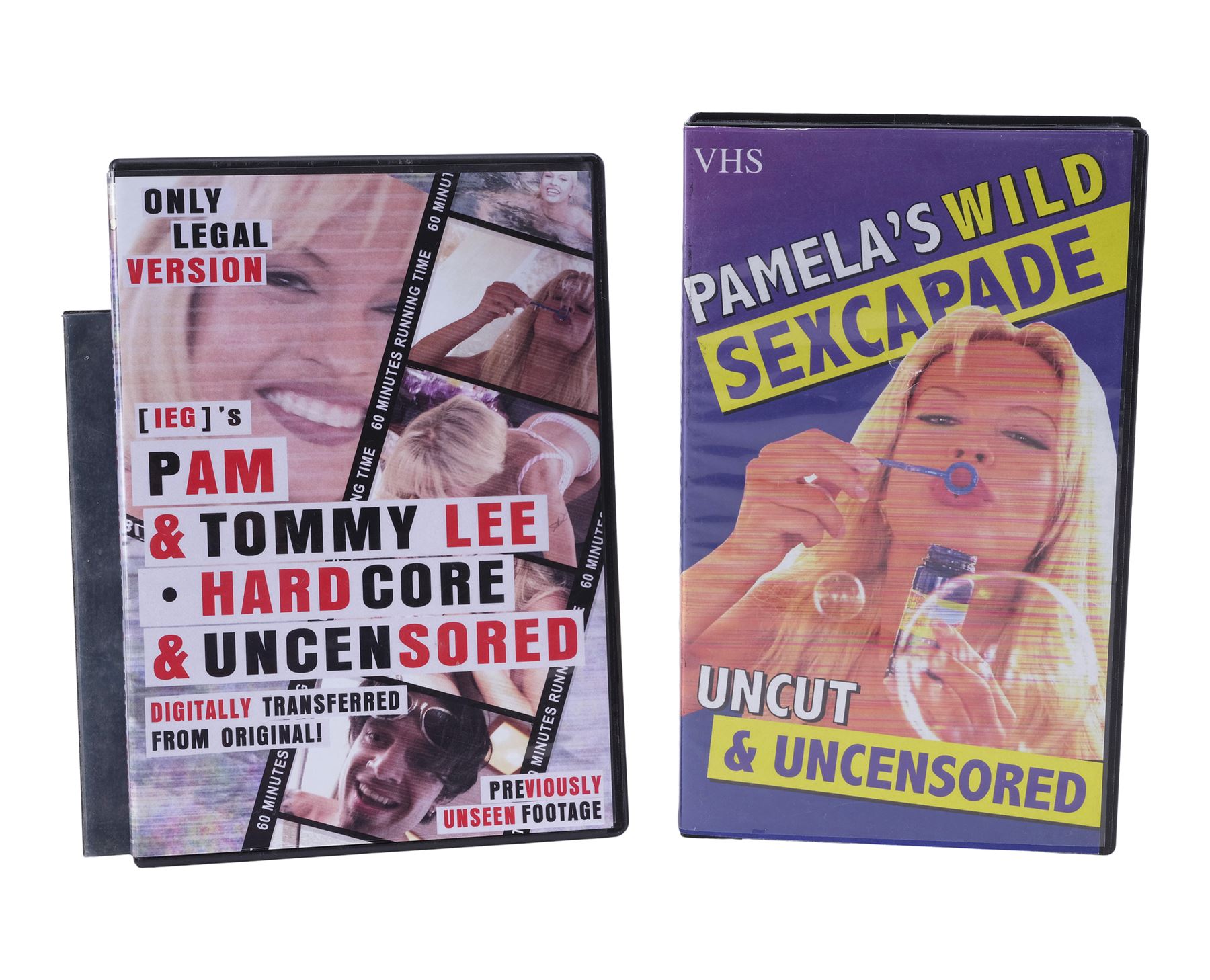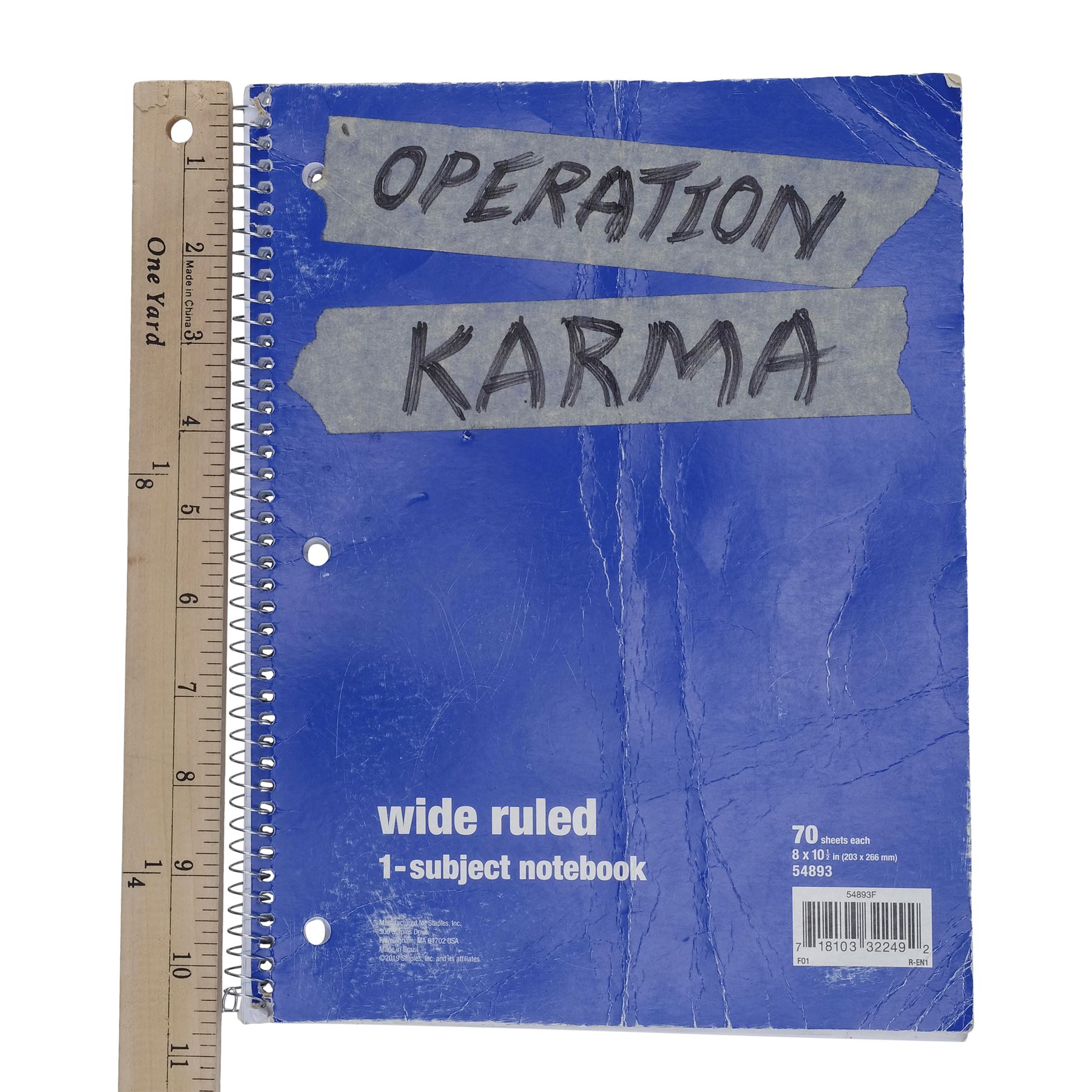 This lot consists of a brown leather wallet; a production-distressed, blue spiral-bound notebook labeled "Operation Karma" and filled with handwritten notes and a hand-drawn diagram; an empty black plastic VHS case with a purple "Pamela's Wild Sexcapade" cover; an empty black plastic DVD case with a cover labeling it as IEG's "Only Legal Version" of the video; and a production-made "No Pictures" memoir consisting of a custom printed cover over a copy of Mark Crispen Miller's Cruel and Unusual, which has a signature simulating Anderson's on the first page. The wallet contains Gauthier's license, business cards, credit card, a credit card under "Pamela Anderson", a credit card under "Valley Irons," and a business card for therapist Molly Griswold. The lot exhibits minor wear, including scuffing and edge wear, to all elements. Dimensions: (largest) 10" x 12" x 1" (25.5 cm x 3.5 cm x 2.75 cm)