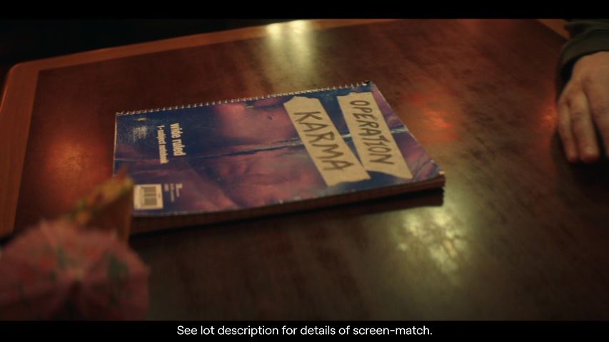 PAM & TOMMY (2022) - Rand Gauthier's (Seth Rogen) Wallet and Screen-Matched Notebook with Pamela Anderson (Lily James) Book and Videos - Rand Gauthier's (Seth Rogen) wallet and screen-matched notebook with a Pamela Anderson (Lily James) book and videos from Robert Siegel's Pam & Tommy. Gauthier went through his wallet as he struggled to pay for caulk and outlined his plan for stealing from the series' titular couple in his notebook in the episode "Drilling and Pounding," the stolen sex tape was eventually released on both VHS and DVD, and the production-made book ultimately did not appear in the final cut of the series. Details in the blue notebook's cover, including the creasing, scuffing, tearing of the tape, and a small marking next to the first O in "Operation" screen-match to the closeup of Gauthier setting the notebook down in front of Lonnie (Larry Brown).