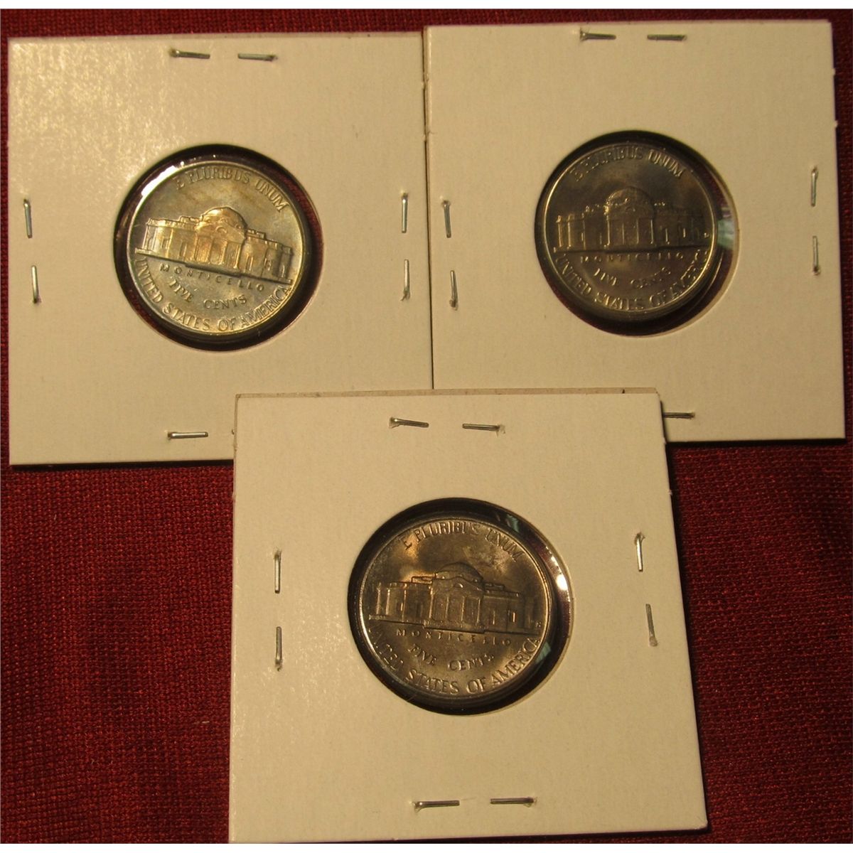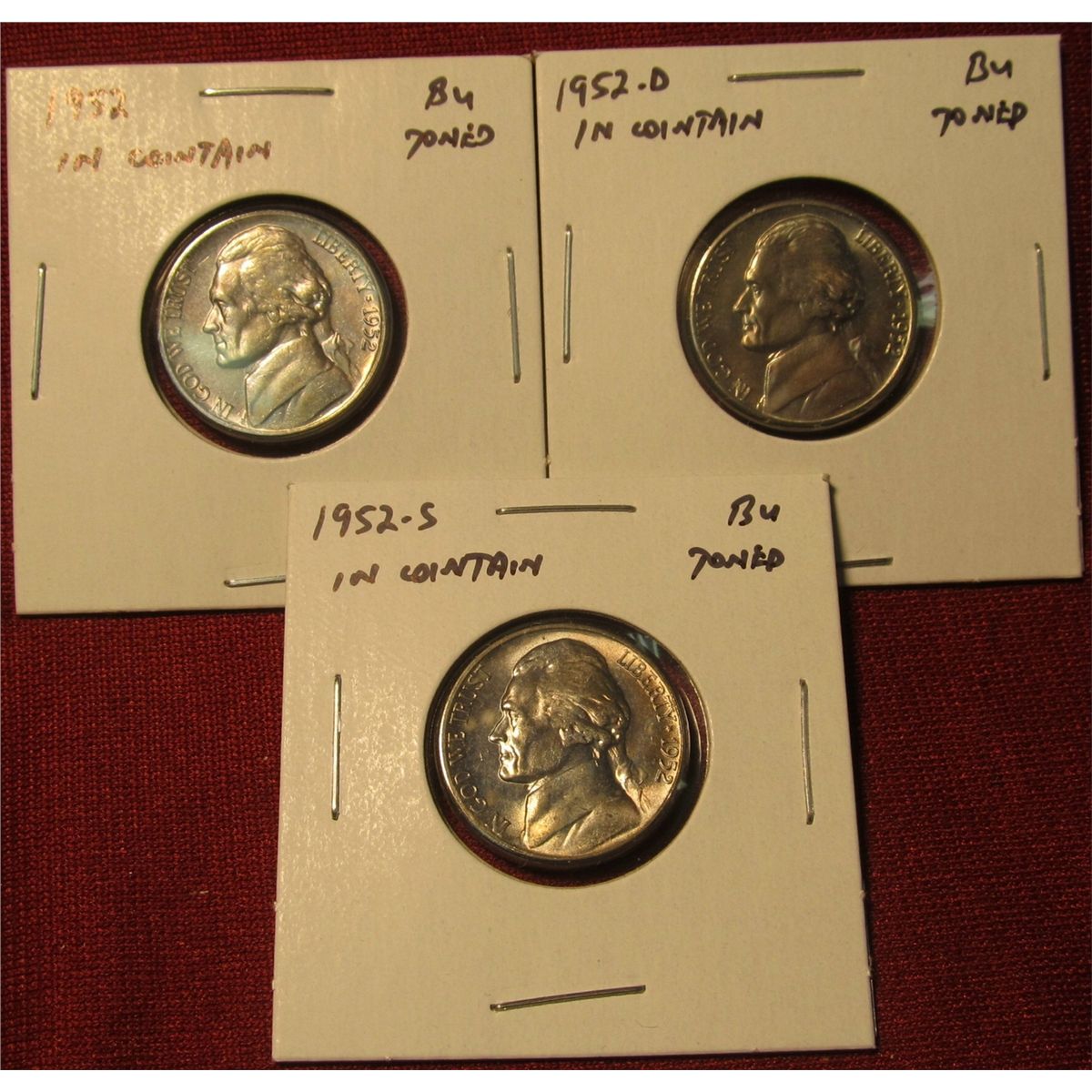 1242. 3 Jefferson Nickels – 1952 PDS, all BU toned, part of set break, all in Cointains