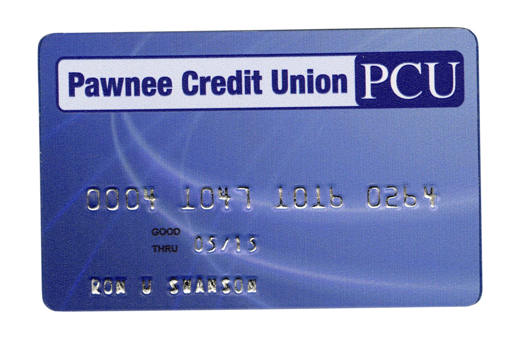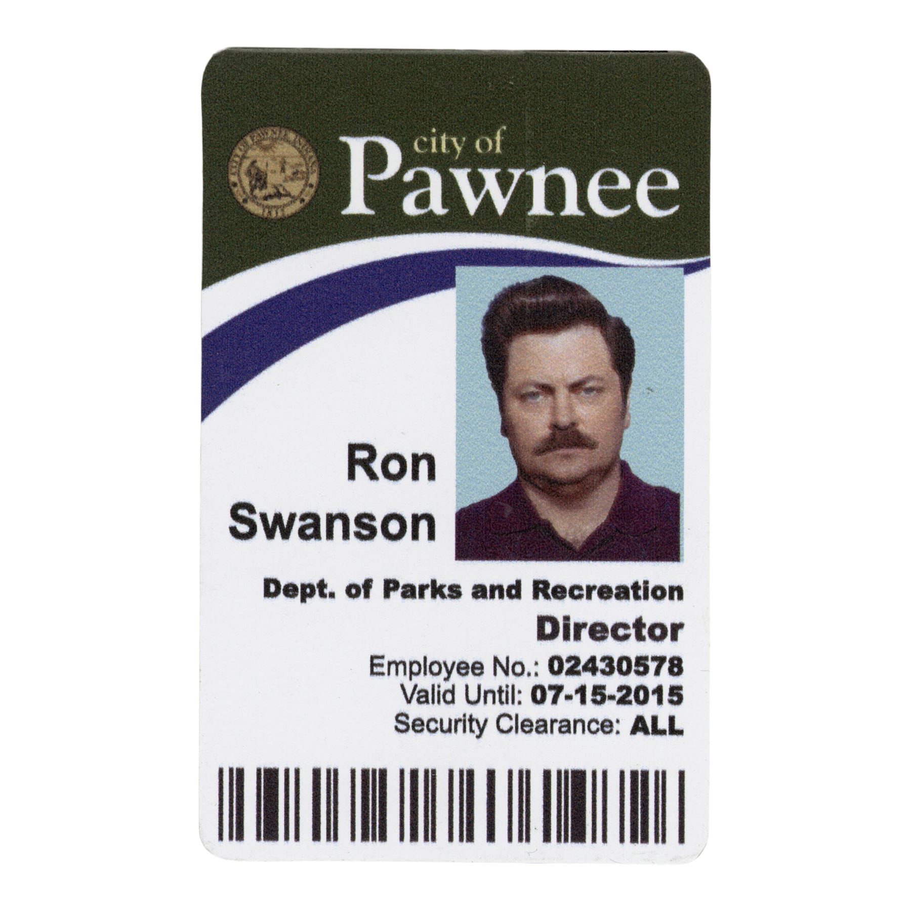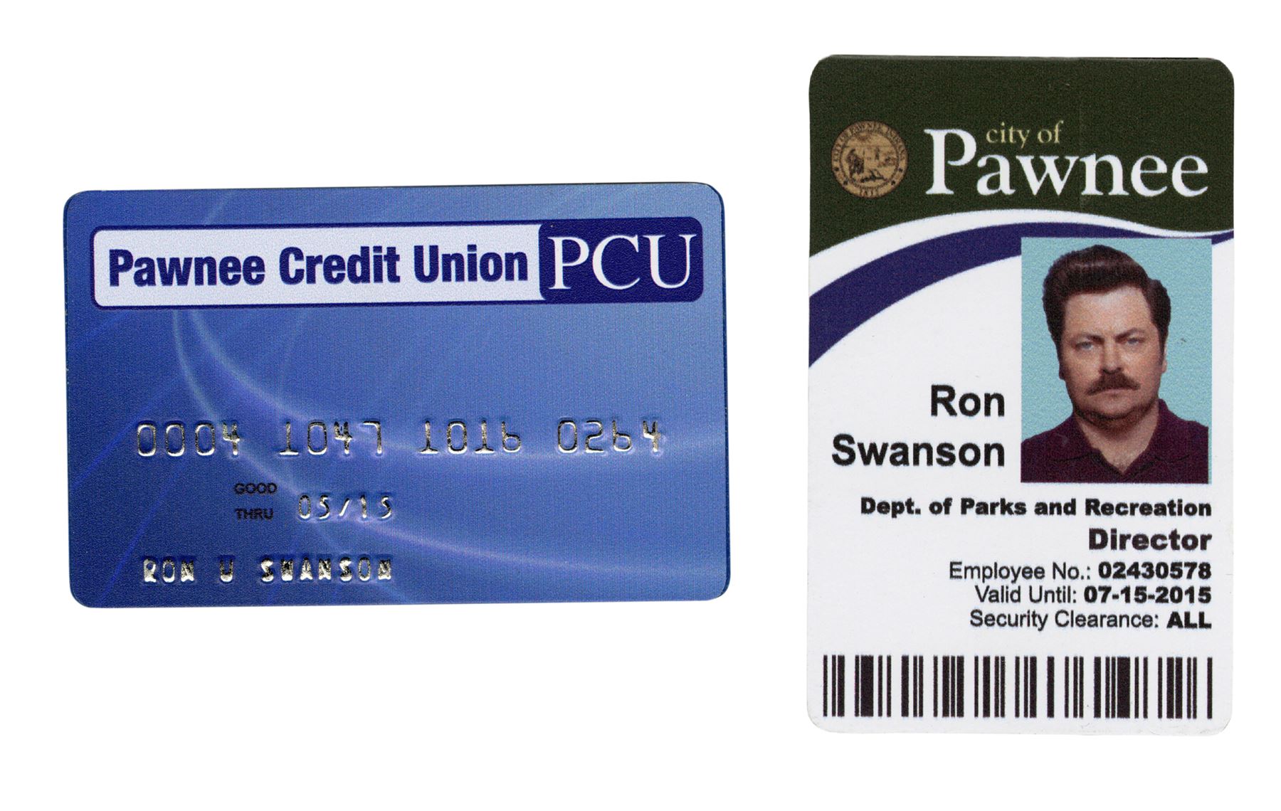 PARKS AND RECREATION (2009-2015) - Ron Swanson's (Nick Offerman) City of Pawnee ID and PCU Credit Card - Ron Swanson's (Nick Offerman) City of Pawnee ID and PCU credit card from Greg Daniels and Mike Schur's Parks and Recreation. In the Season 6 episode "The Pawnee-Eagleton Tip-Off Classic," Donna Meagal (Retta) cut up Ron's credit card and ID card to get him off the grid after he received a Pennysaver in the mail.