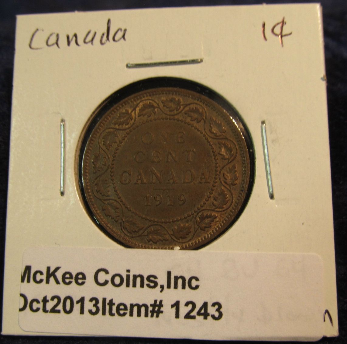 1243. 1919 Canada Large Cent. Choice BU 64 Mostly Brown.
