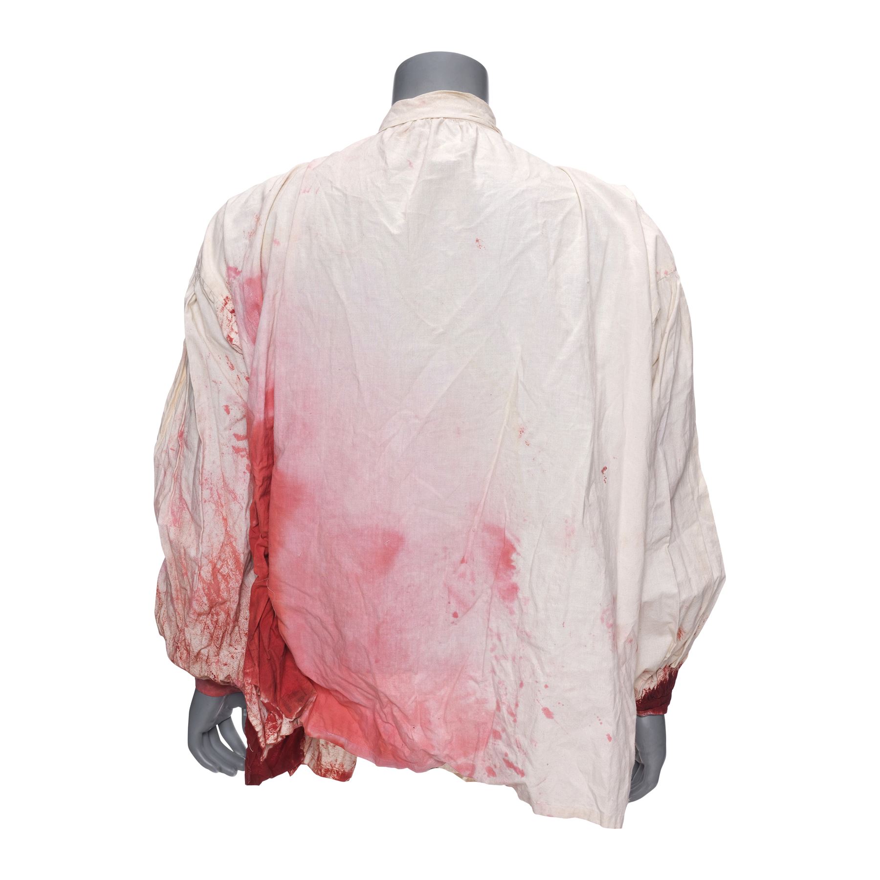 This lot consists of one off-white cotton shirt and two production tags. The production tags are hand-marked "Heath Ledger" for the part of "Gabriel" for scenes "39-42" and "42." Production intentionally distressed this shirt to appear bloodied and grimy. Also included is a black and white 8" x 10" (20.25 cm x 25.5 cm) print of Ledger in costume. This lot exhibits stiffness from the SFX blood.