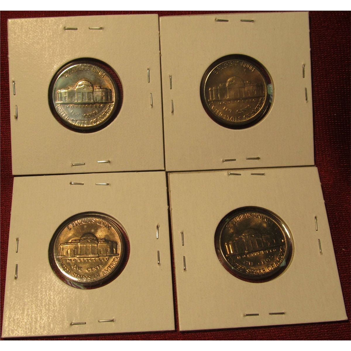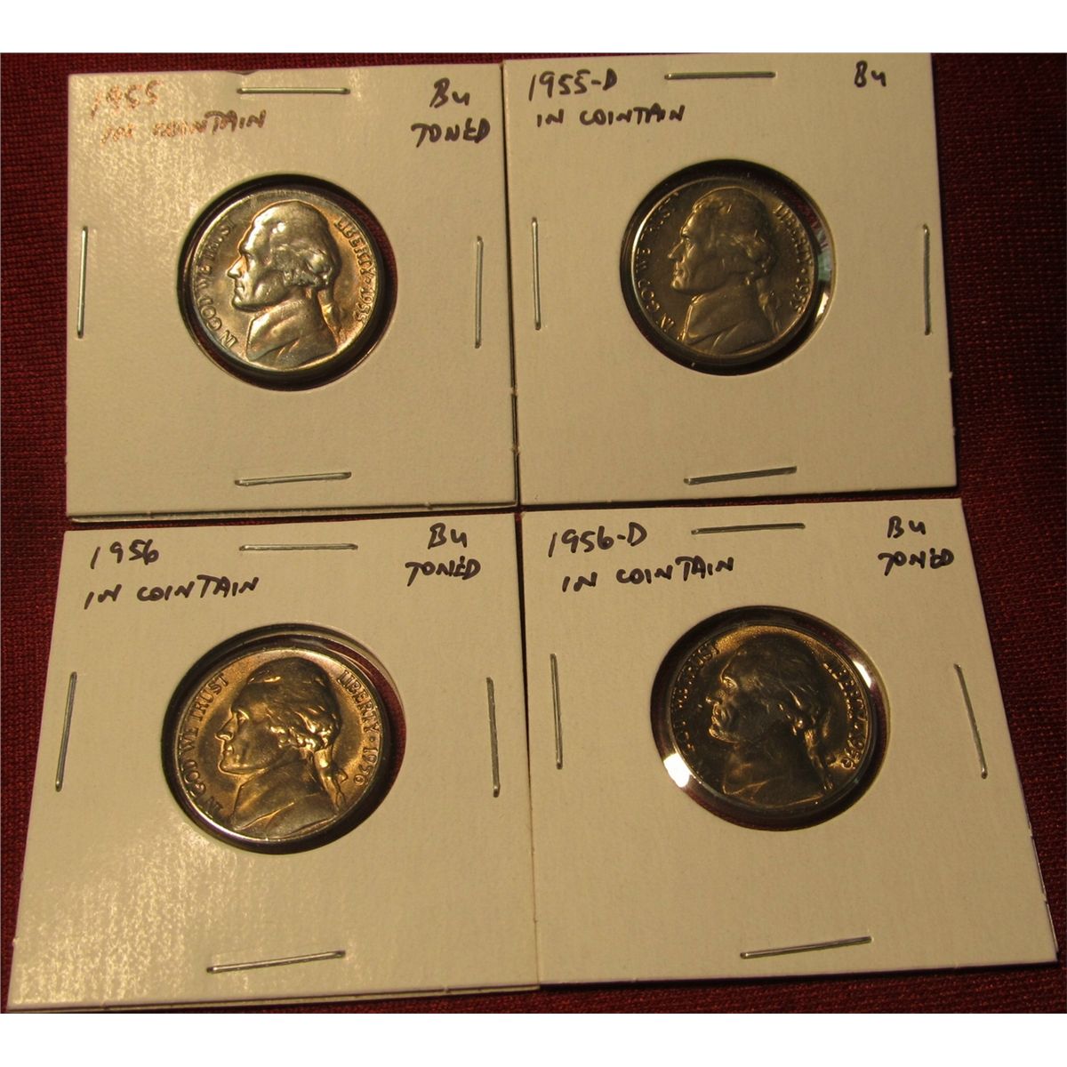1245. 4 Jefferson Nickels – 1955 PD & 1956 PD, all BU toned, part of set break, all in Cointains