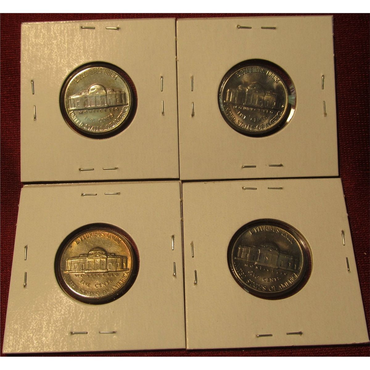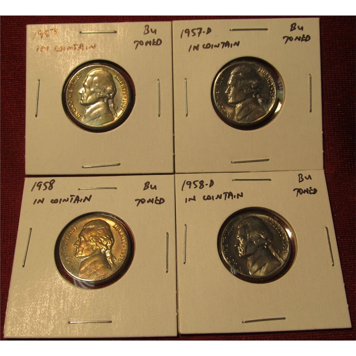 1246. 4 Jefferson Nickels – 1957 PD & 1958 PD, all BU toned, part of set break, all in Cointains