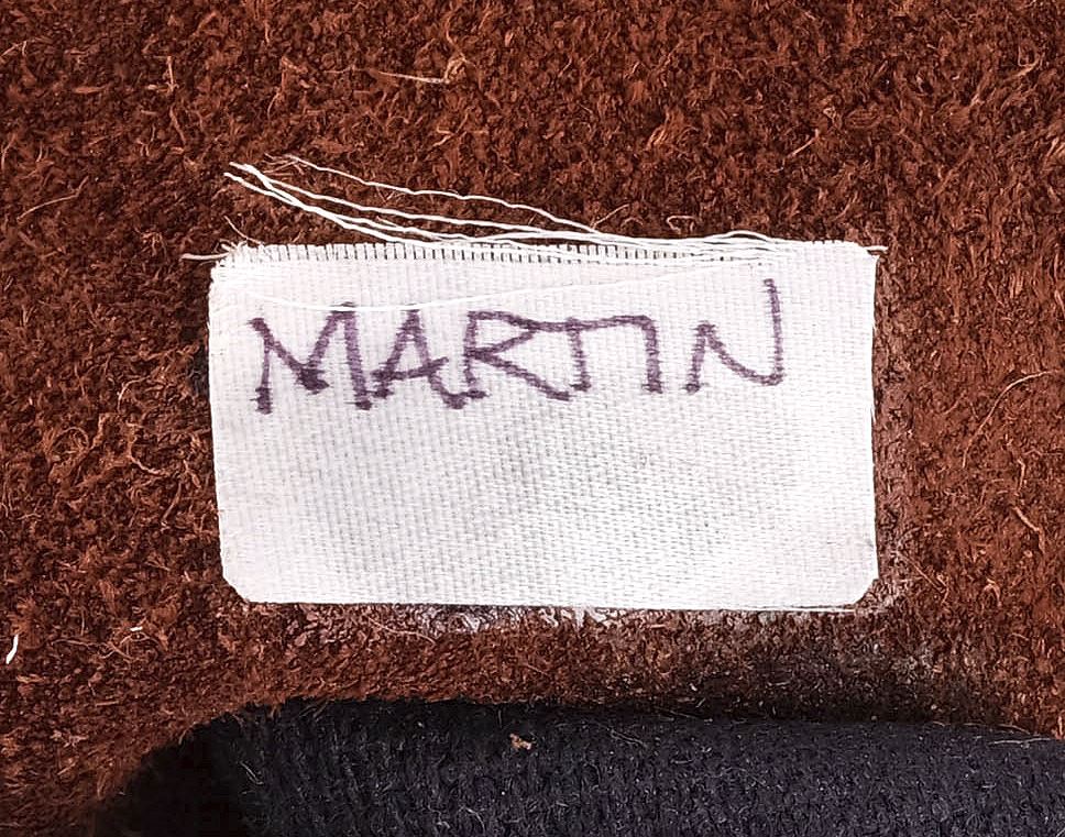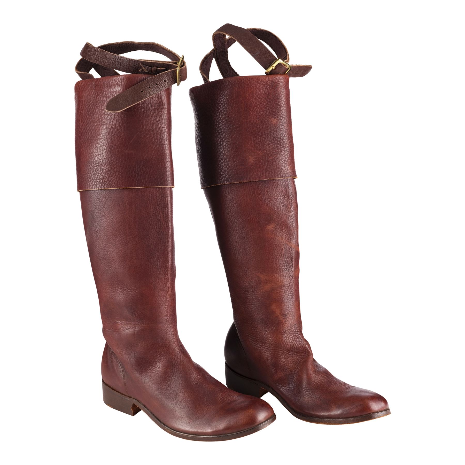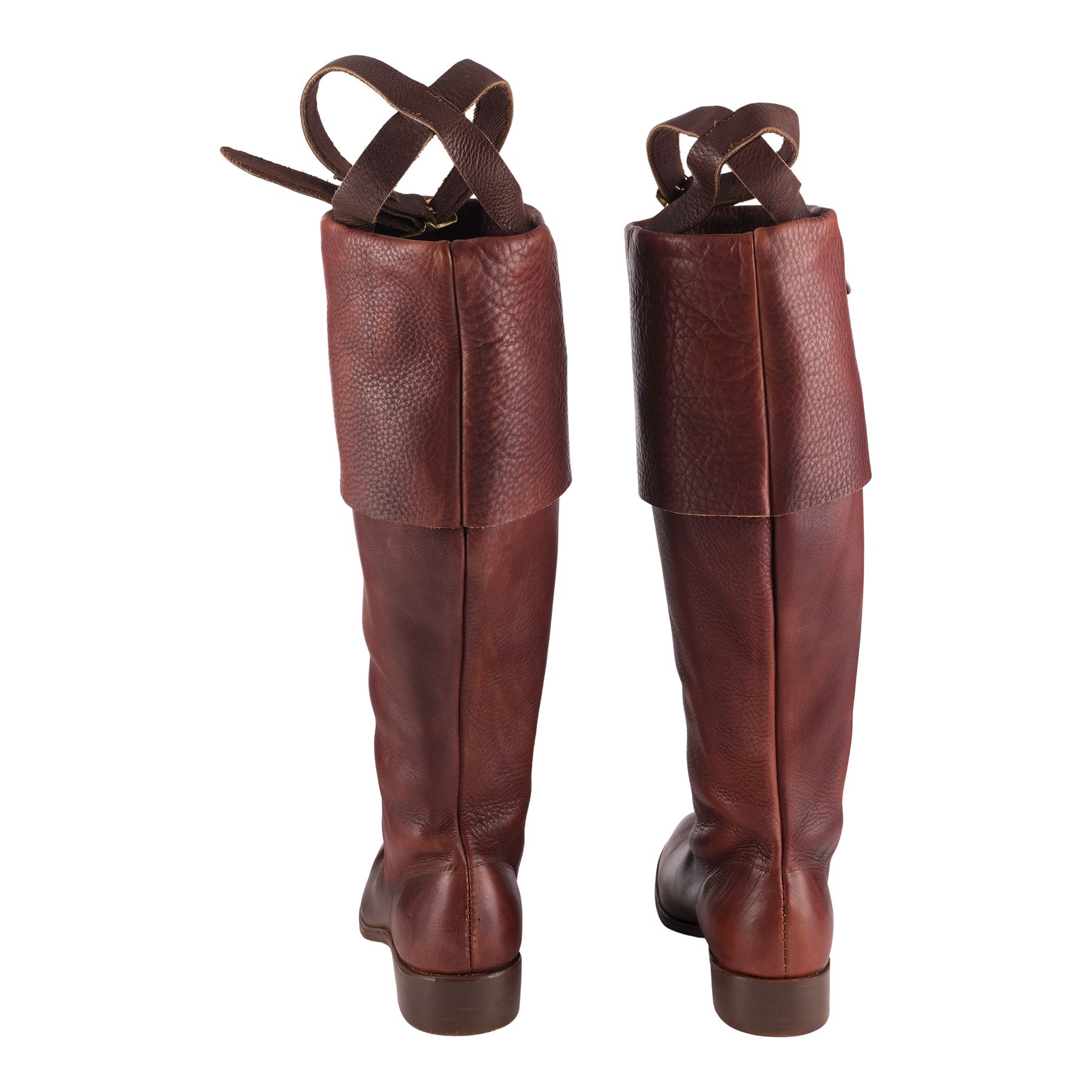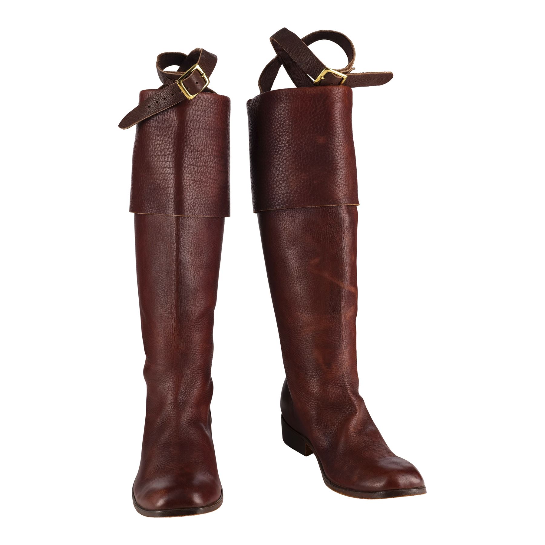 This lot consists of a pair of red-brown leather boots each with a matching red-brown leather strap and gold-color metal buckle that wraps around the knee. These boots are each labeled "MARTIN" on the interior. This lot exhibits minor worn leather.