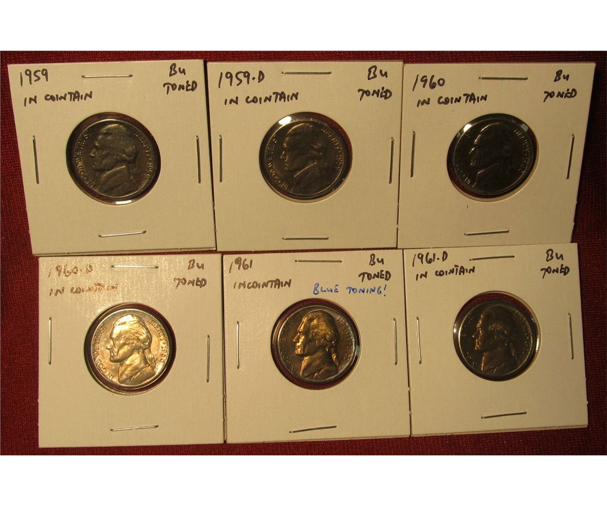 1247. 6 Jefferson Nickels – 1959 PD, 1960 PD & 1961 PD, all BU toned, part of set break, all in Cointains