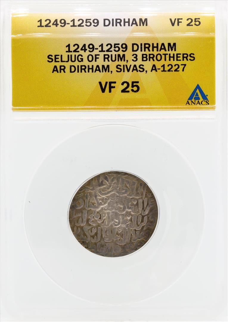 One 1249-1259 Dirham Seljug of Rum 3 Brothers Coin ANACS VF25. ANACS Certified.