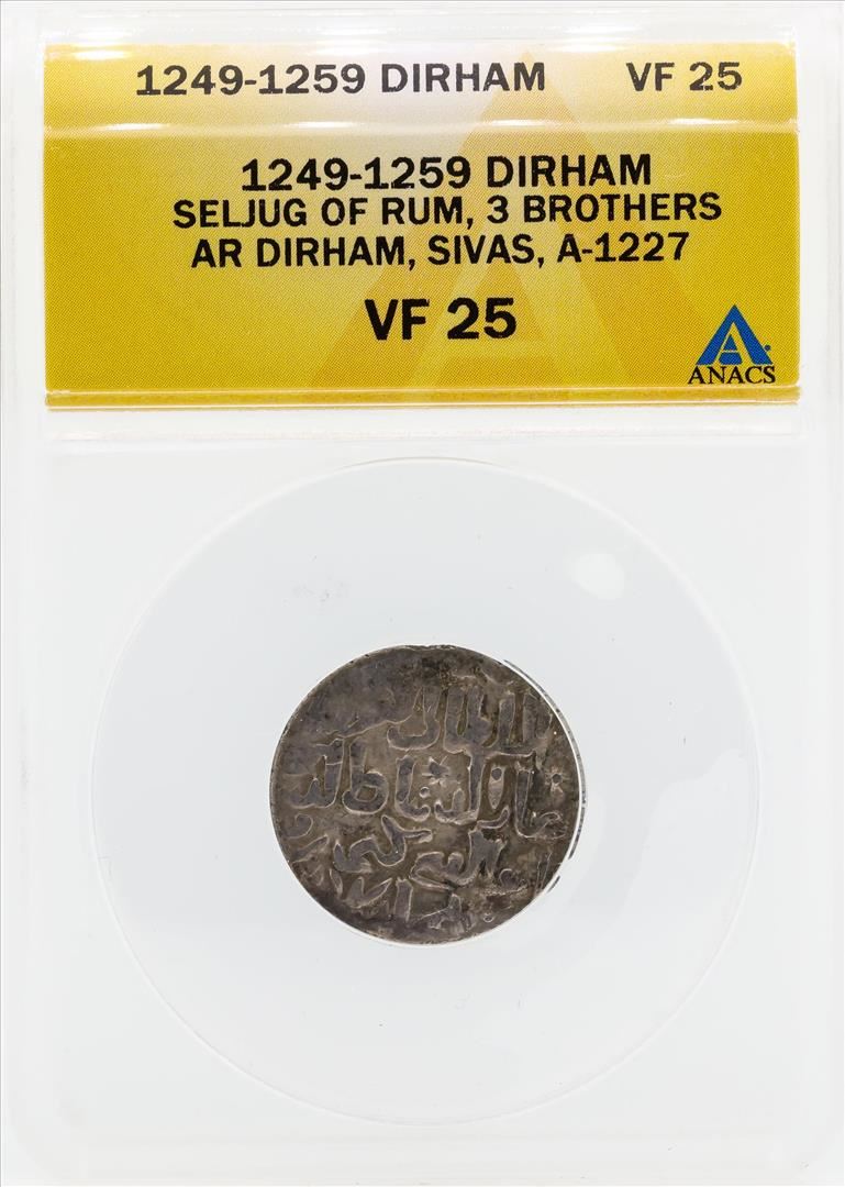 One 1249-1259 Dirham Seljug of Rum 3 Brothers Coin ANACS VF25. ANACS Certified.