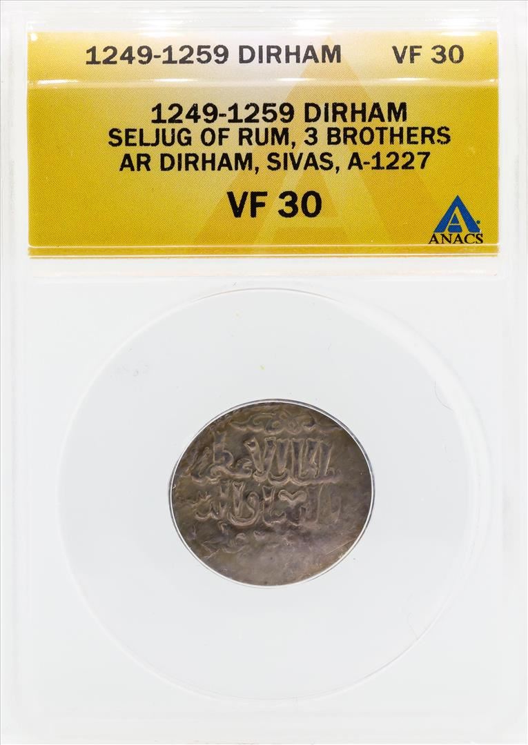 One 1249-1259 Dirham Seljug of Rum 3 Brothers Coin ANACS VF30. ANACS Certified.