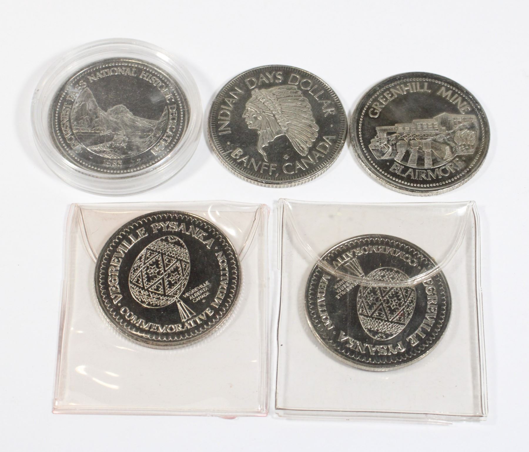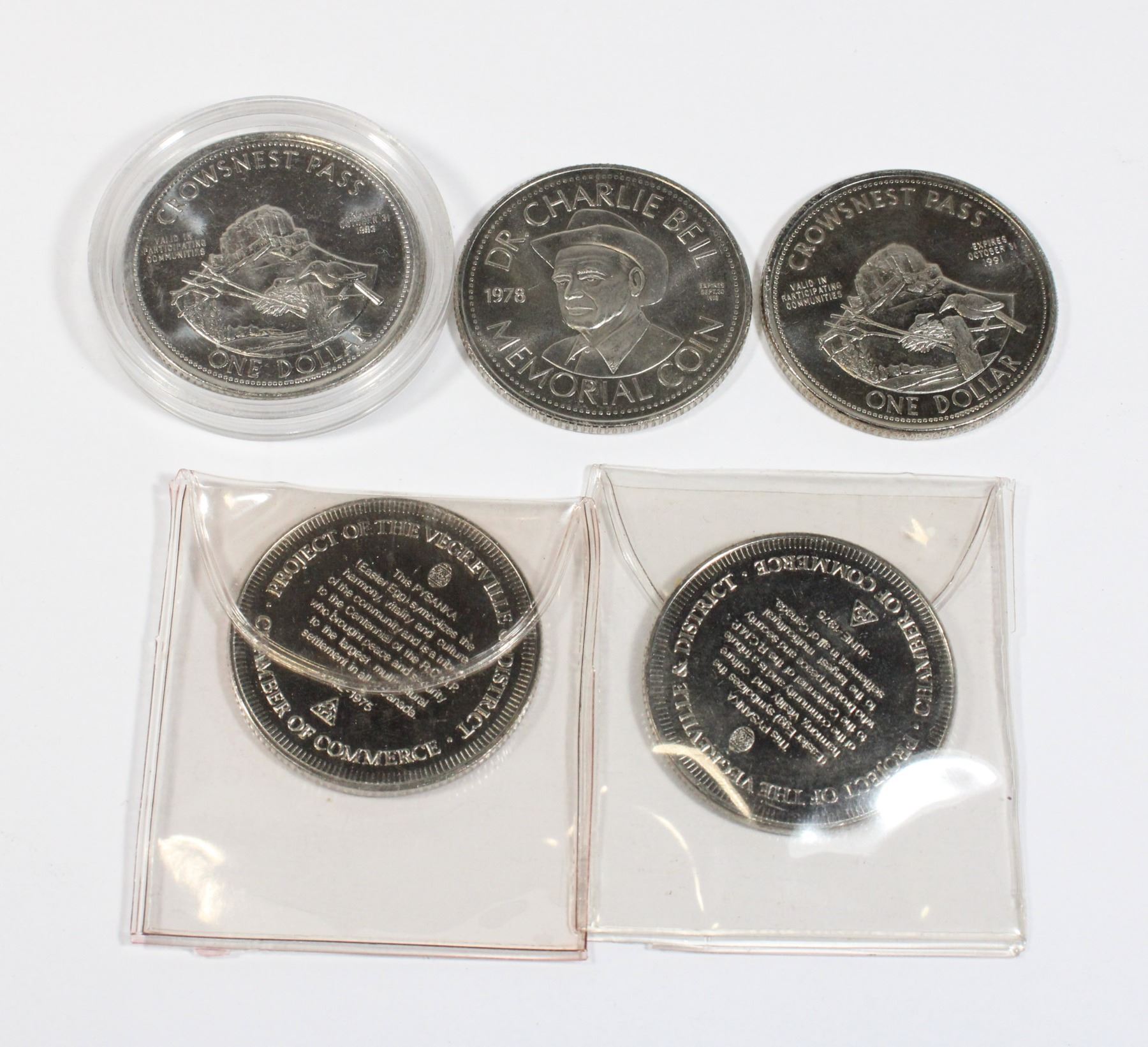 LOT OF 5 INCLUDING CROWSNEST PASS 1983 ONE DOLLAR, VEGREVILLE PYSANKA MEDALLION JUNE 1975 BANFF CANADA 1978 MEMORIAL COIN 1900'S CANADIAN COIN TOKENS