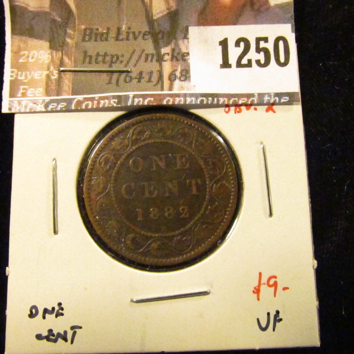 1250 . 1882H Canada One Cent, Obverse 2, VF, value $9