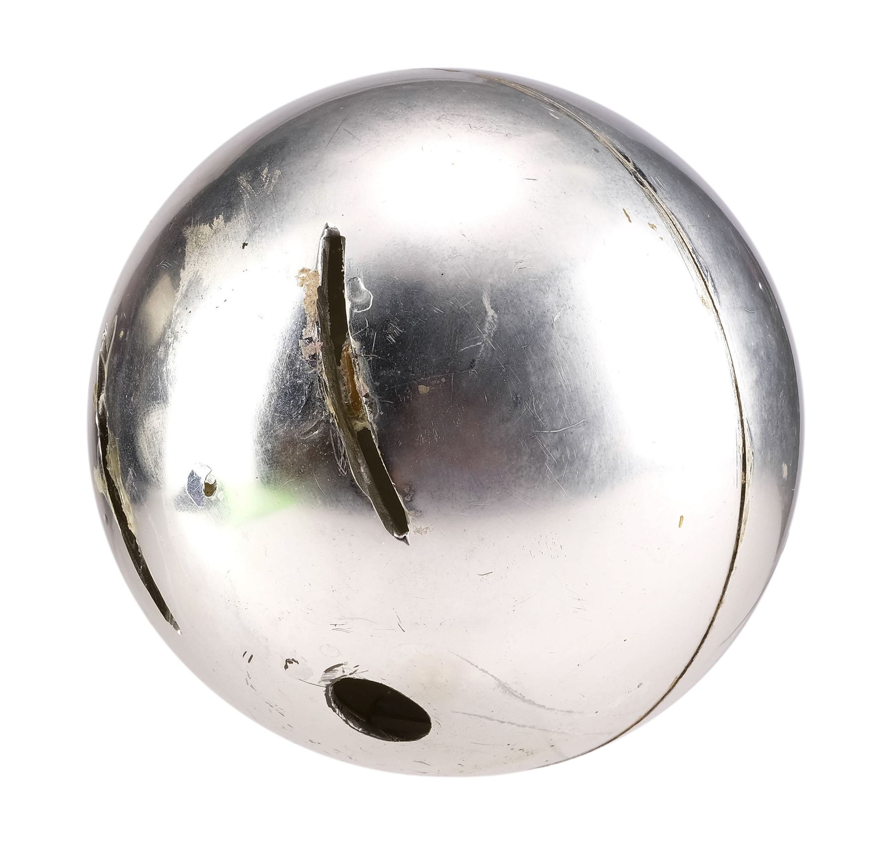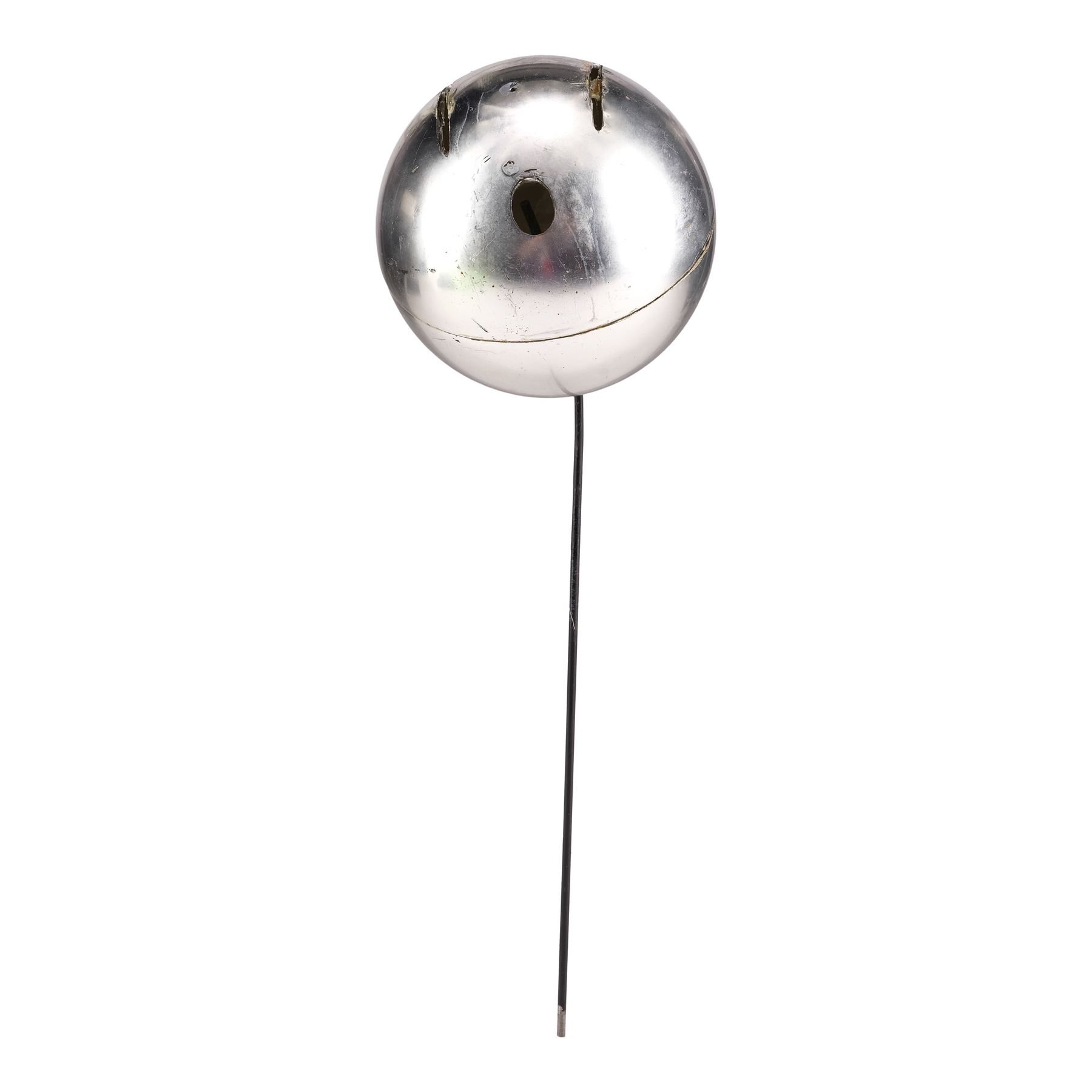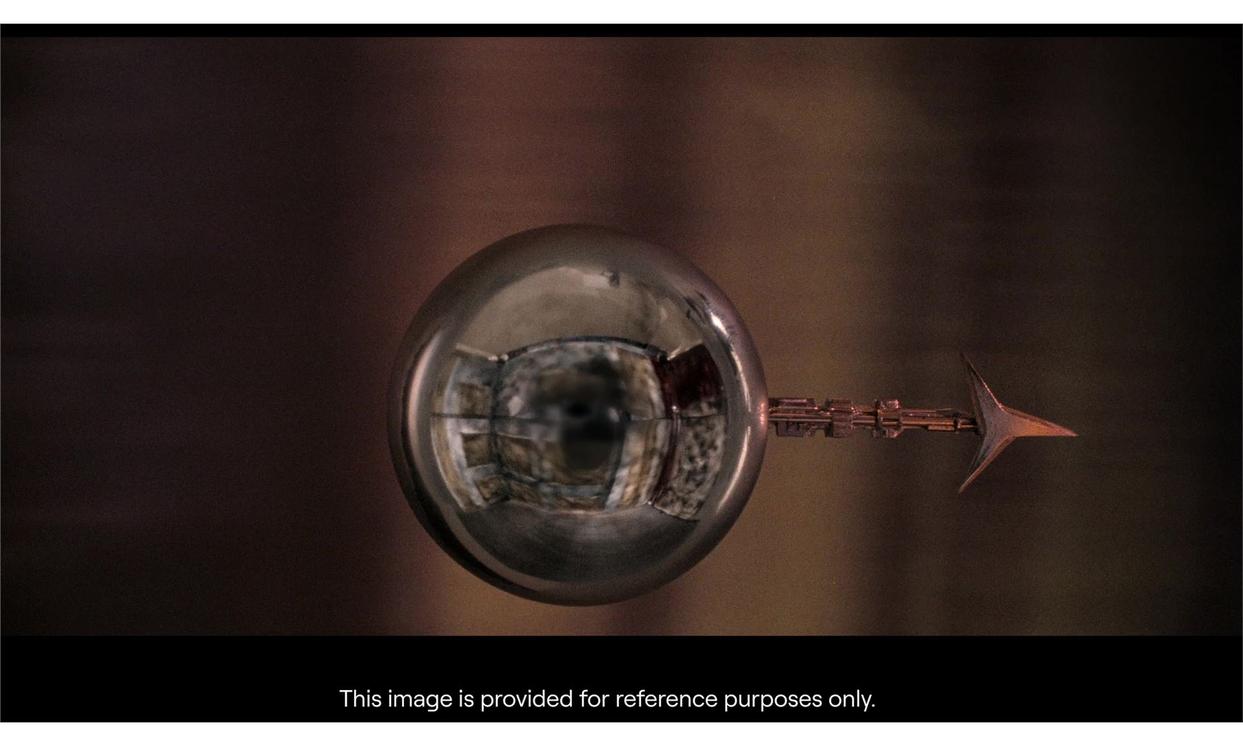 This chrome-color, metal-plated Sentinel features two crescent-shaped holes for inserting or projecting blades, as well as a hole on the bottom out of which extends a metal puppeteering rod. The rods were eliminated during post-production. The Sentinel exhibits a small puncture at center, some tarnishing, and adhesive residue in the larger holes from production. Dimensions: 14" x 5" x 5" (35.75 cm x 12.75 cm x 12.75 cm)