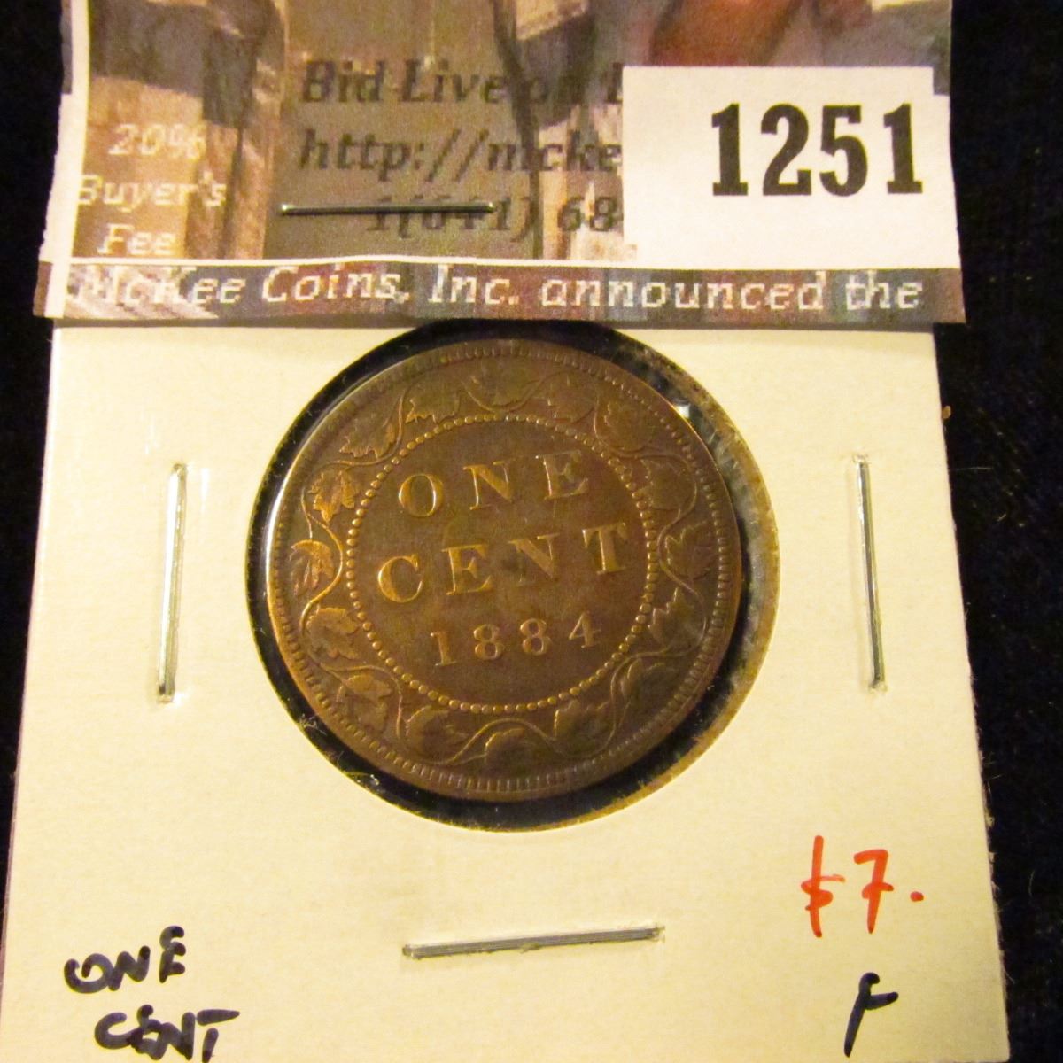 1251 . 1884 Canada One Cent, Obverse 2, F, value $7