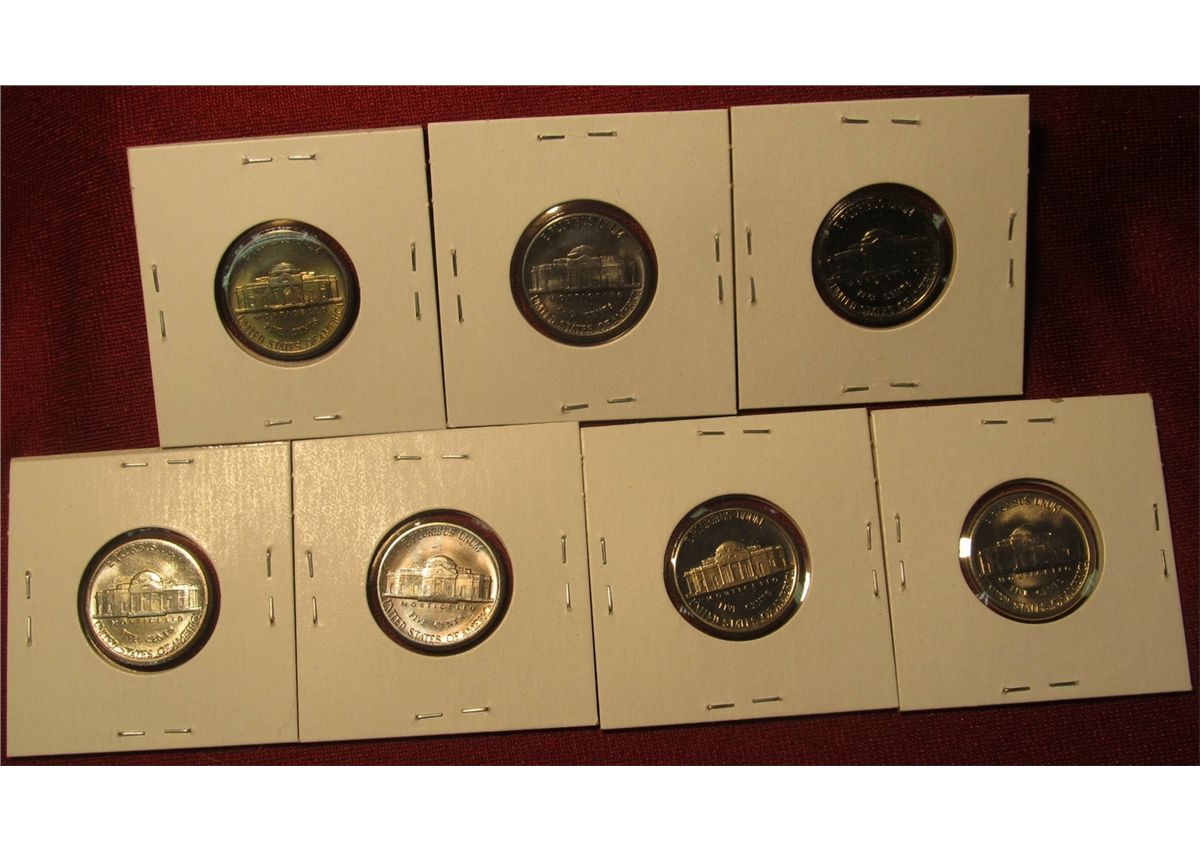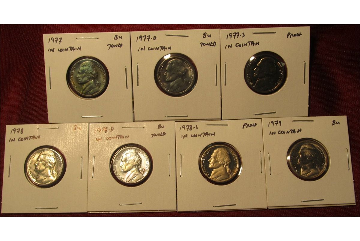 1254. 7 Jefferson Nickels – 1977 PD, 1978 PD and 1979, all BU ; 1977-S Proof & 1978-S Proof, part of set break, all in Cointains