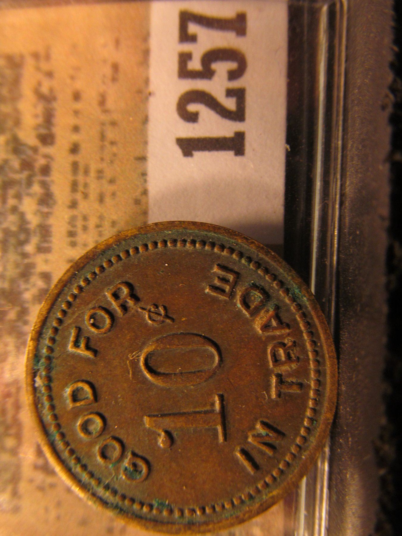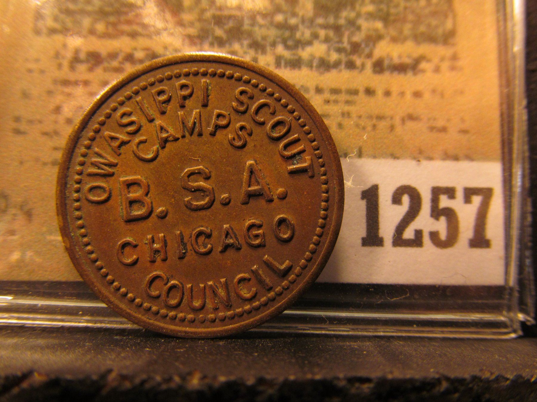 1257 _ "OWASIPPI SCOUT/CAMPS/B.S.A./CHICAGO/COUNCIL," "GOOD FOR/10¢/IN TRADE", Br., rd., TC-17069.