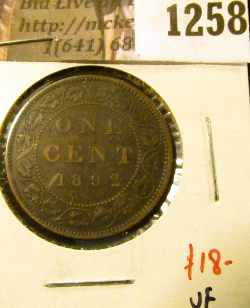 1258 . 1892 Canada One Cent, Obverse 3, VF, value $18