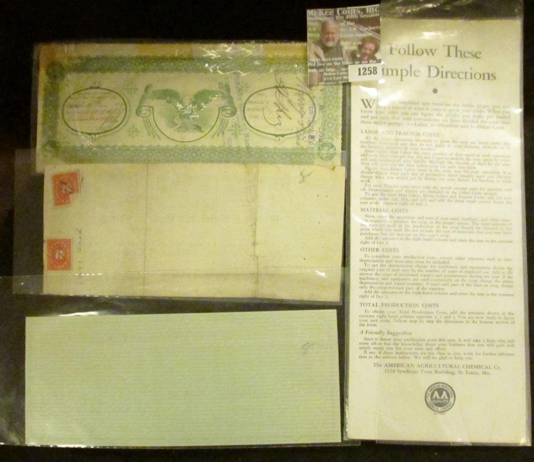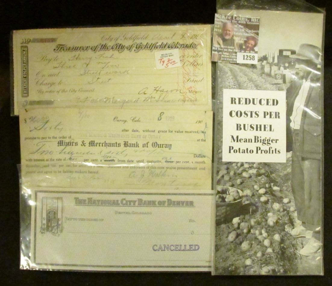 1915 Check "Treasurer of the City of Goldfield Colorado"; 1922 Ouray, Colorado Promissory note "Miners & Merchants Bank of Ouray" with two attached revenue stamps; unissued cancelled check "The National City Bank of Denver, Colorado"; & brochure from "The American Agricultural Chemical Co." titled "Reduced Costs per Bushel Means Bigger Potato Profits".