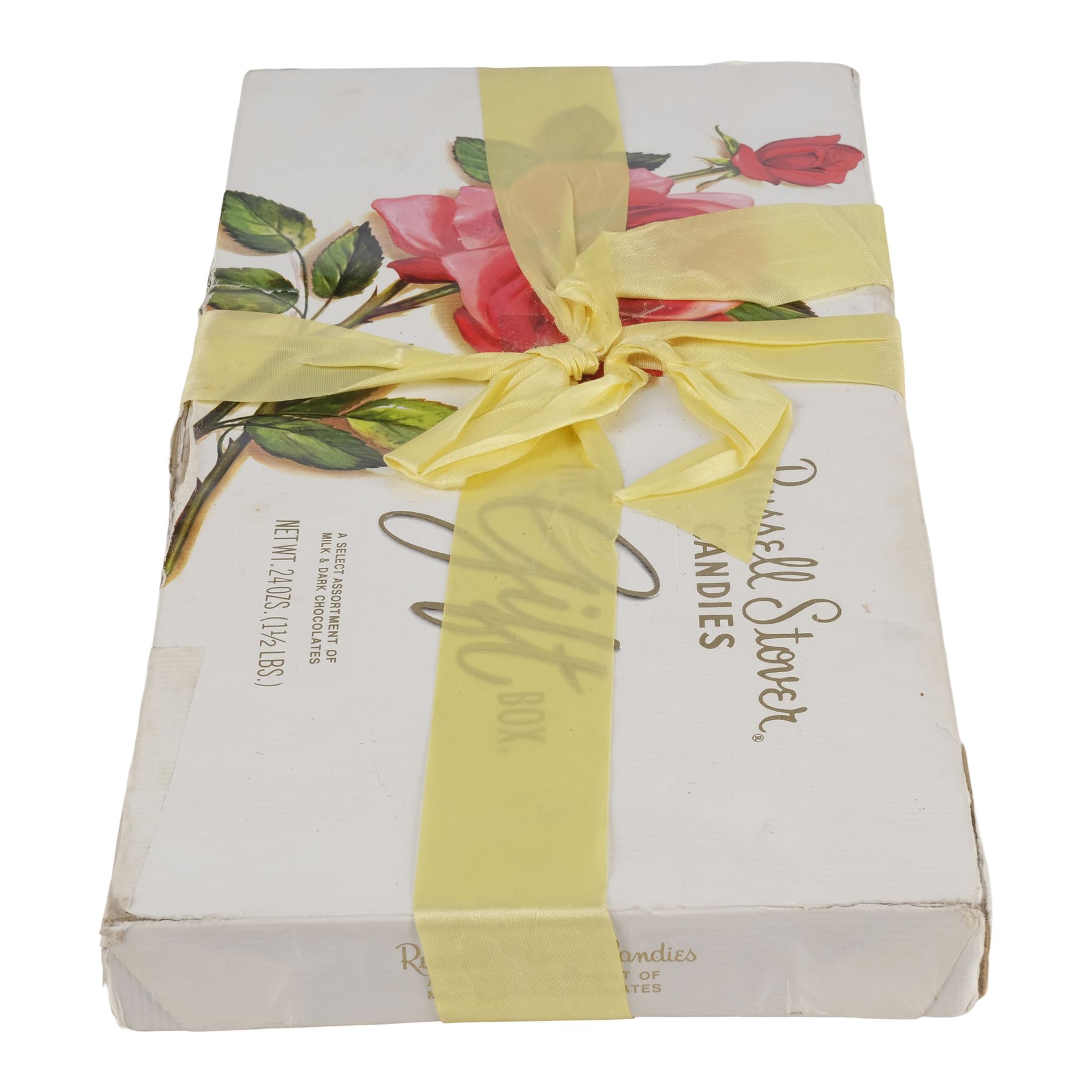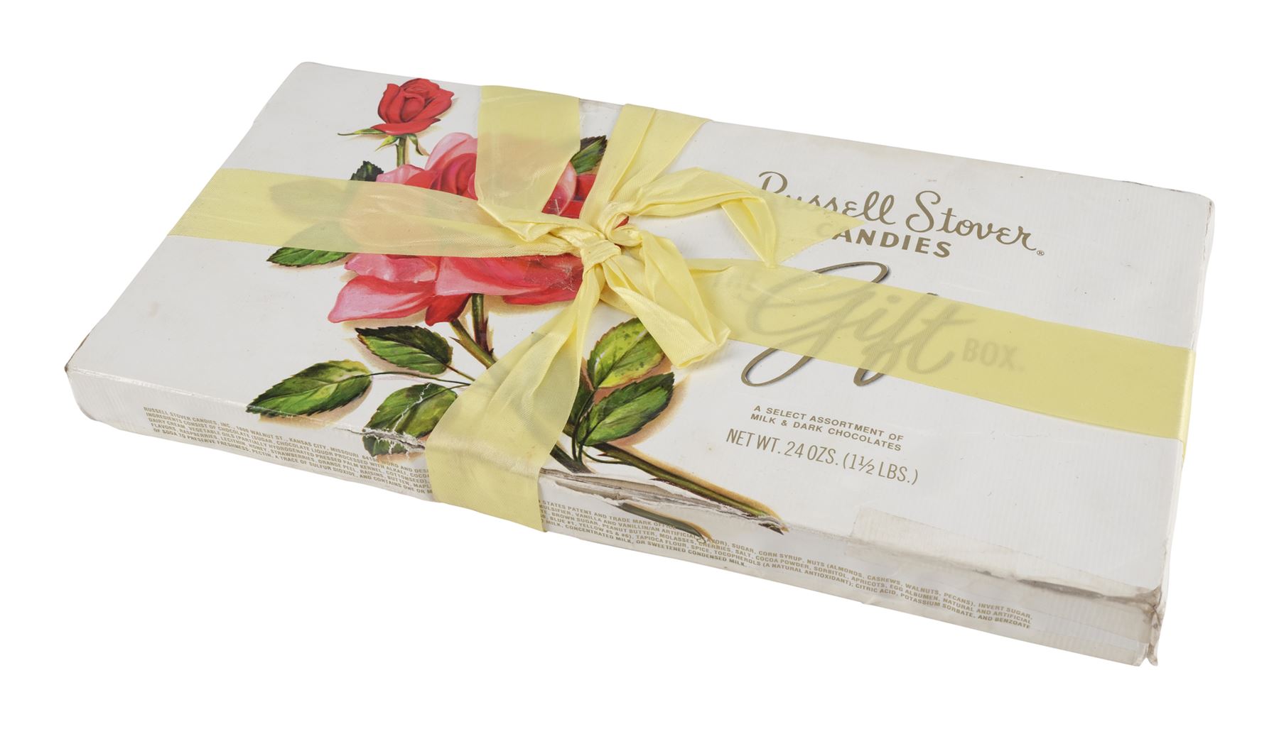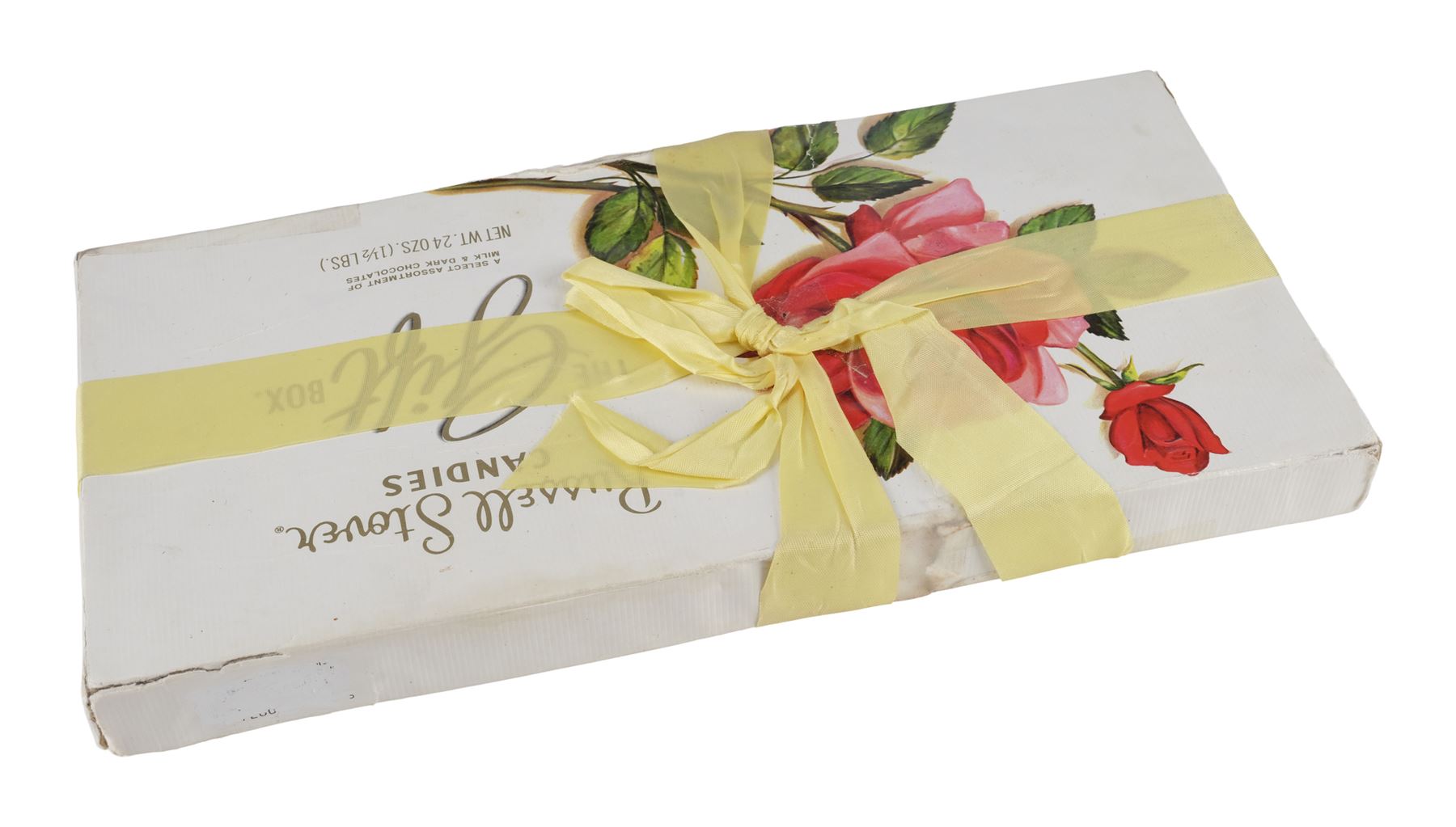 Believed to be a real-world chocolate box lid with a black backing, this lot consists of one "The Gift Box" Russell Stover Candies box of chocolates with a pale yellow ribbon composed of white paper-wrapped cardboard. The box features some modifications, including a white-out barcode. The interior of the box has been weighted, but also still retains the original cellophane film-covered chocolates. Two types of ribbons are seen in the film, a peach color ribbon and this yellow colored ribbon that is seen during the rain scenes. This box exhibits discoloration, torn and ripped cardboard on the edges repaired with tape, separated paper, lifted adhesive, a buildup of grime, and frayed fibers. Dimensions: 13.25" x 6.5" x 1.5" (33.25 cm x 16.5 cm x 4 cm)