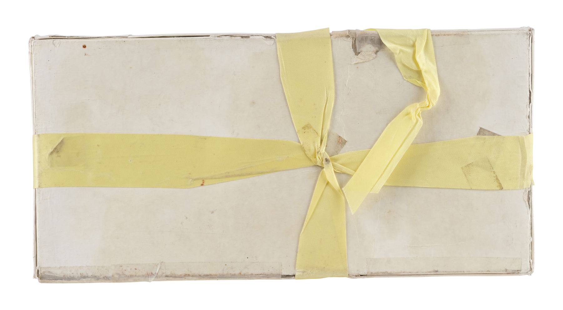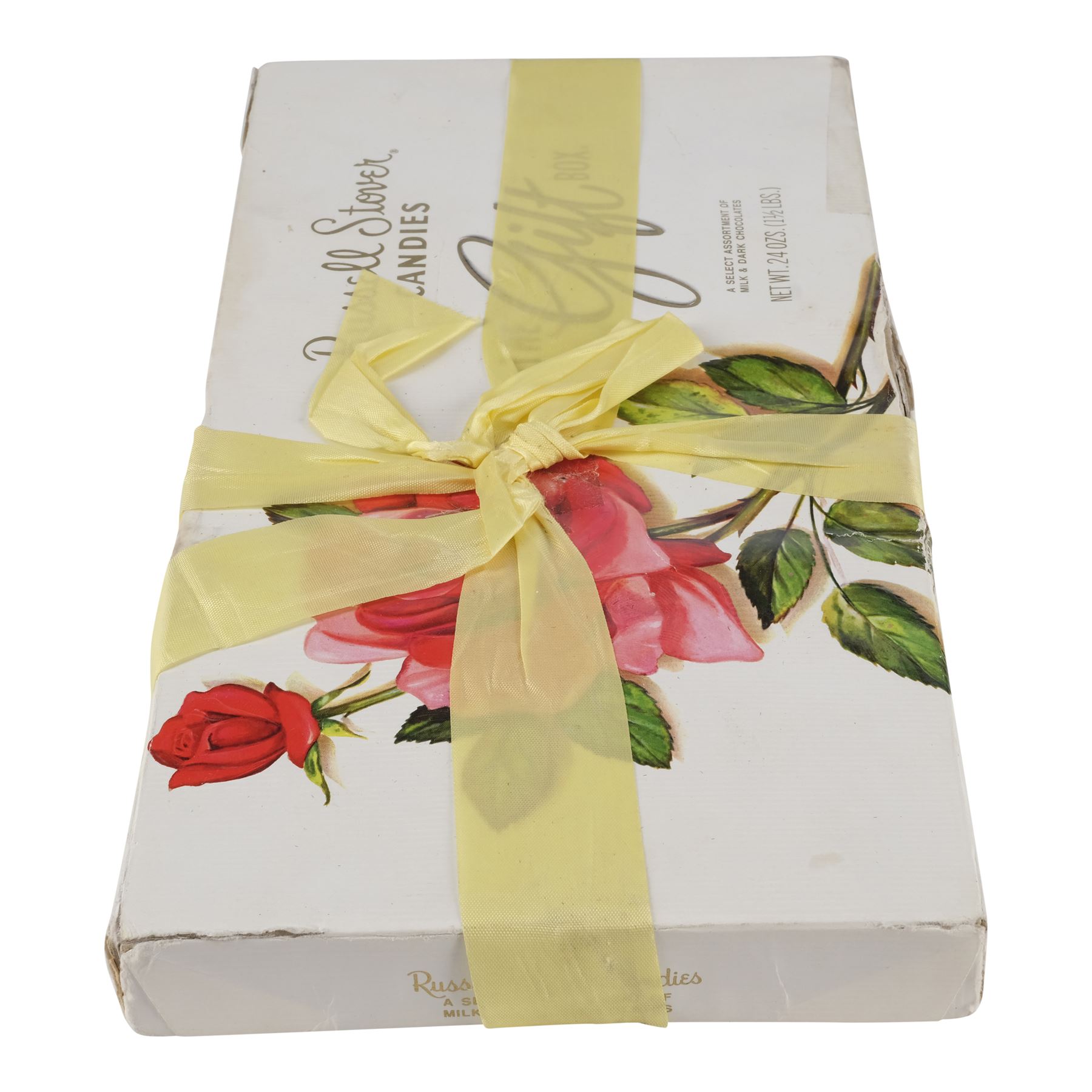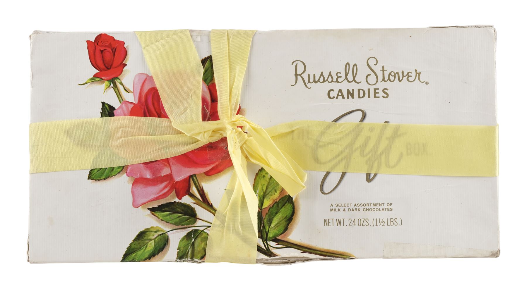 Believed to be a real-world chocolate box lid with a black backing, this lot consists of one "The Gift Box" Russell Stover Candies box of chocolates with a pale yellow ribbon composed of white paper-wrapped cardboard. The box features some modifications, including a white-out barcode. The interior of the box has been weighted, but also still retains the original cellophane film-covered chocolates. Two types of ribbons are seen in the film, a peach color ribbon and this yellow colored ribbon that is seen during the rain scenes. This box exhibits discoloration, torn and ripped cardboard on the edges repaired with tape, separated paper, lifted adhesive, a buildup of grime, and frayed fibers. Dimensions: 13.25" x 6.5" x 1.5" (33.25 cm x 16.5 cm x 4 cm)