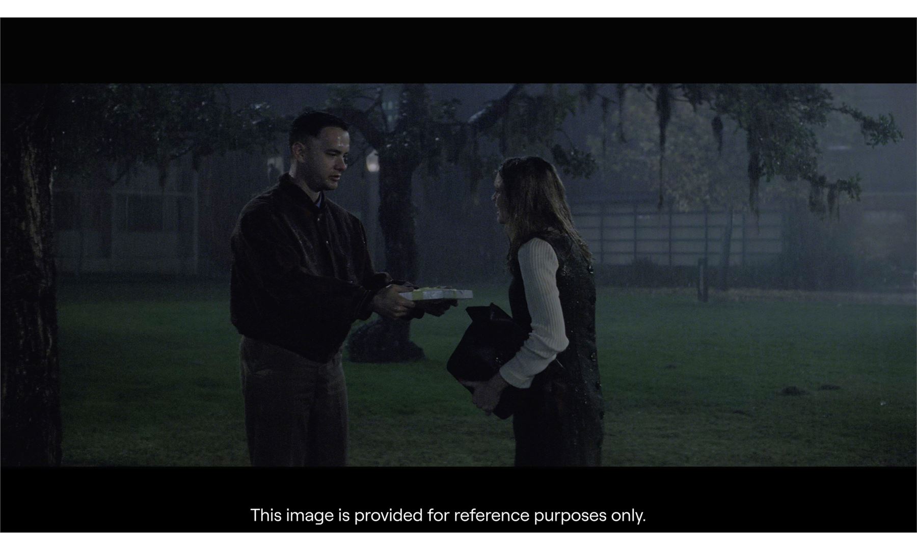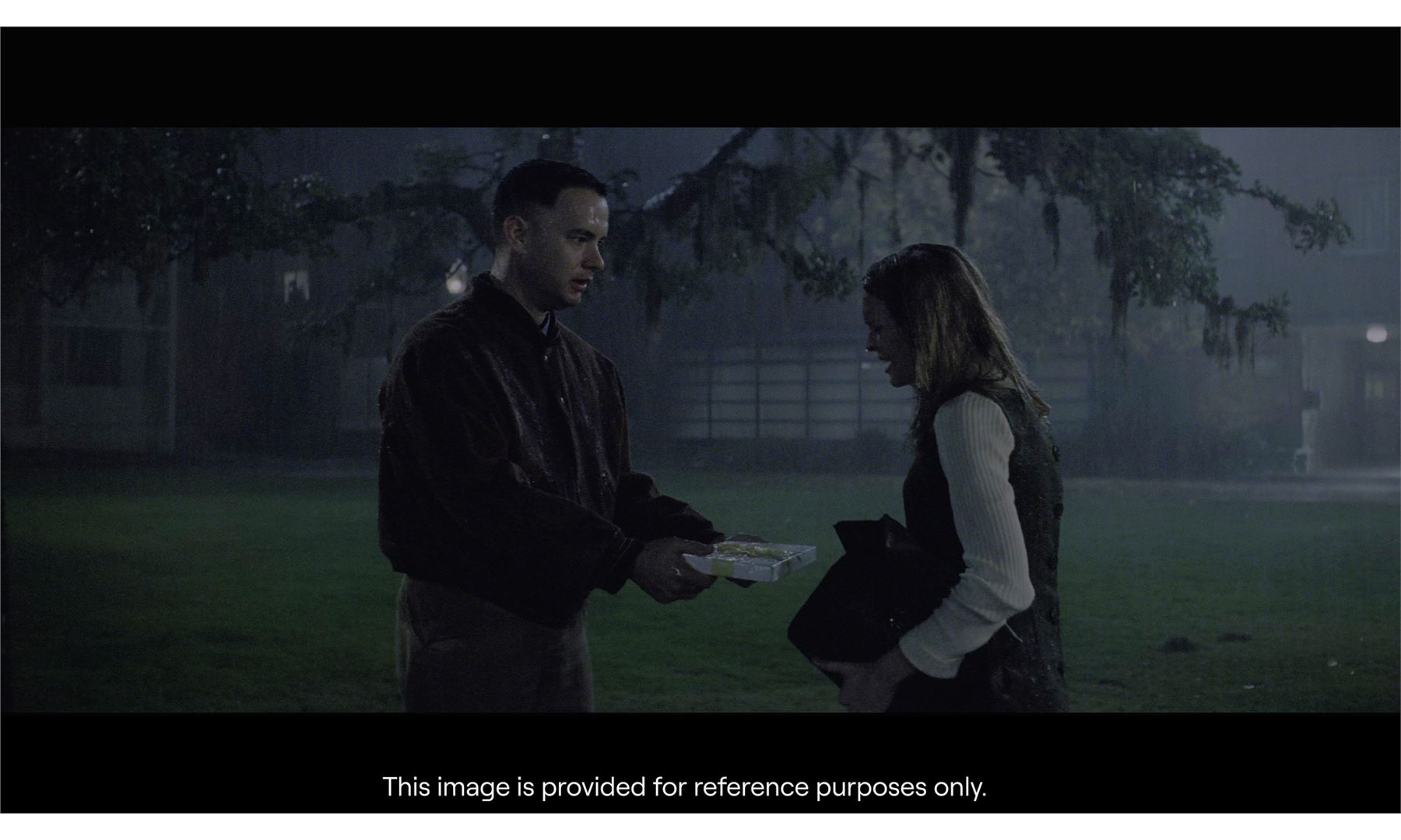 FORREST GUMP (1994) - Forrest Gump's (Tom Hanks) Box of Chocolates - Forrest Gump's (Tom Hanks) box of chocolates from Robert Zemeckis' Forrest Gump. Forrest brought his long-time friend and first love, Jenny, a box of chocolates with a pale yellow ribbon when he visited her at college while it was raining. The box of chocolates remained a recurring motif with Forrest, lending to the iconic scenes of him sitting with one throughout the film at the bus stop to meet Jenny once more.