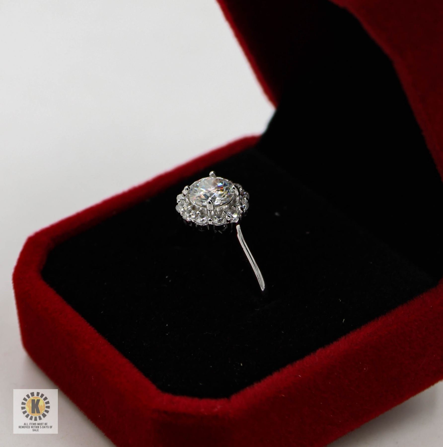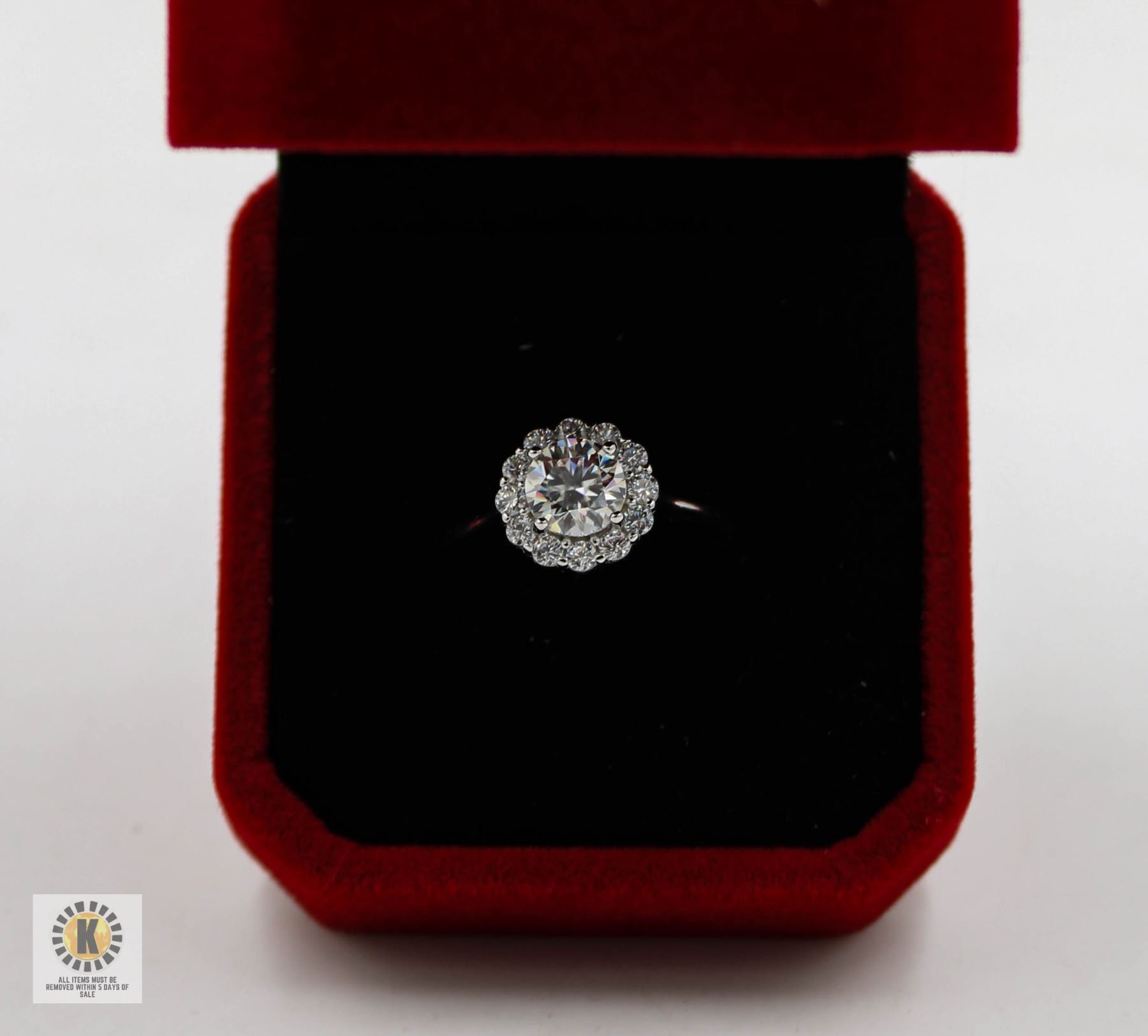 CUT MOISSANITE STONE VVS D COLOR SET WITH 12 ROUND BRILLIANT CUT CUBIC ZIRCONIA'S SET SURROUNDING THE CENTER SET IN 925 SILVER RING SIZE ADJUSTABLE RETAIL VALUE $850.00