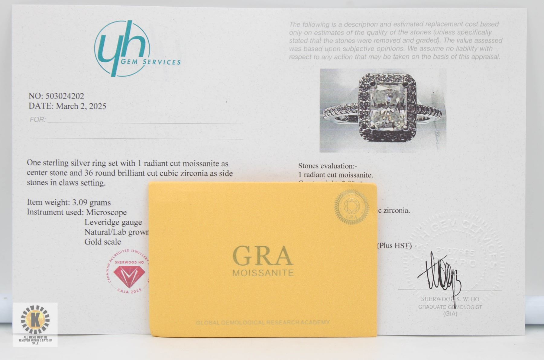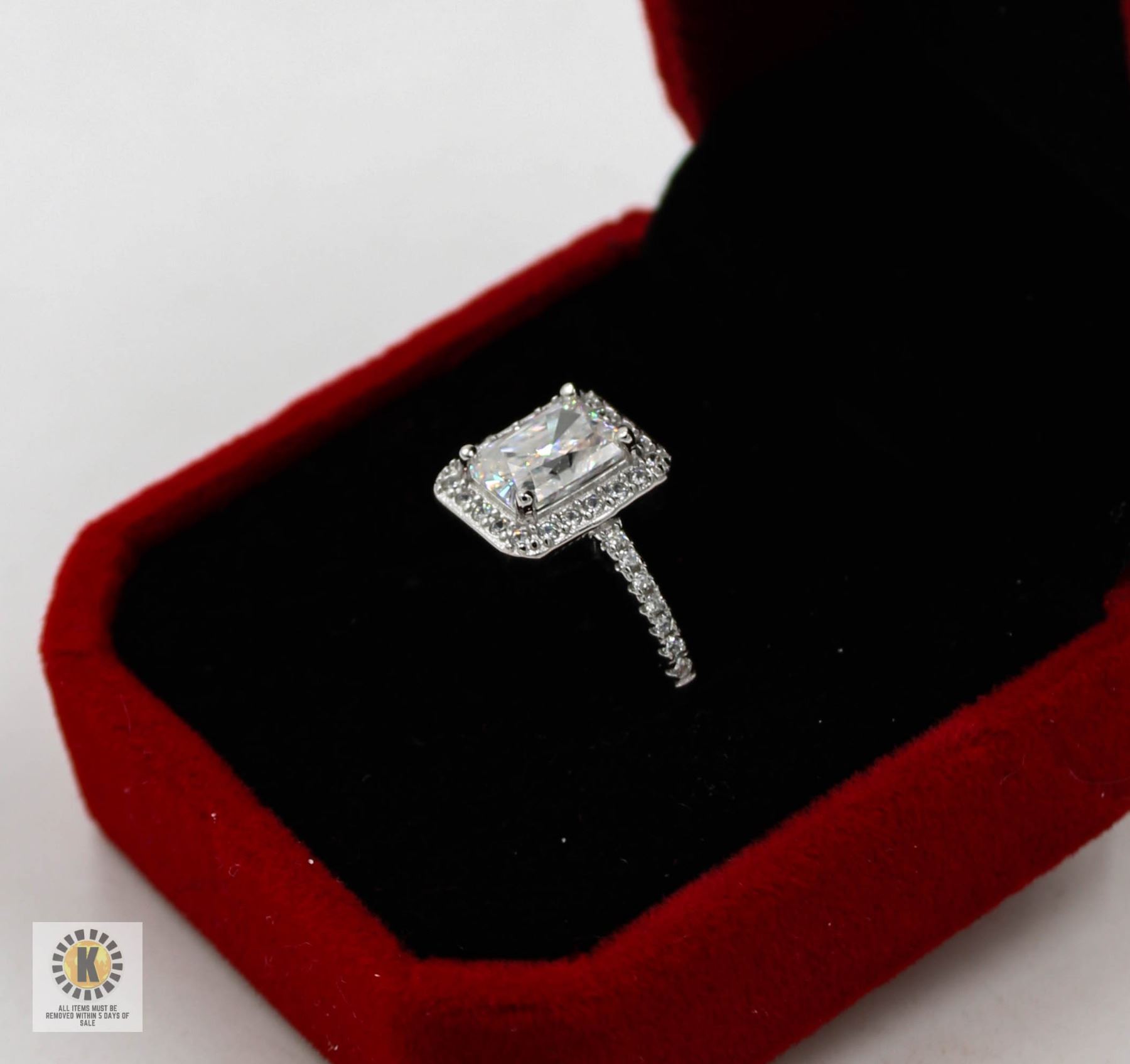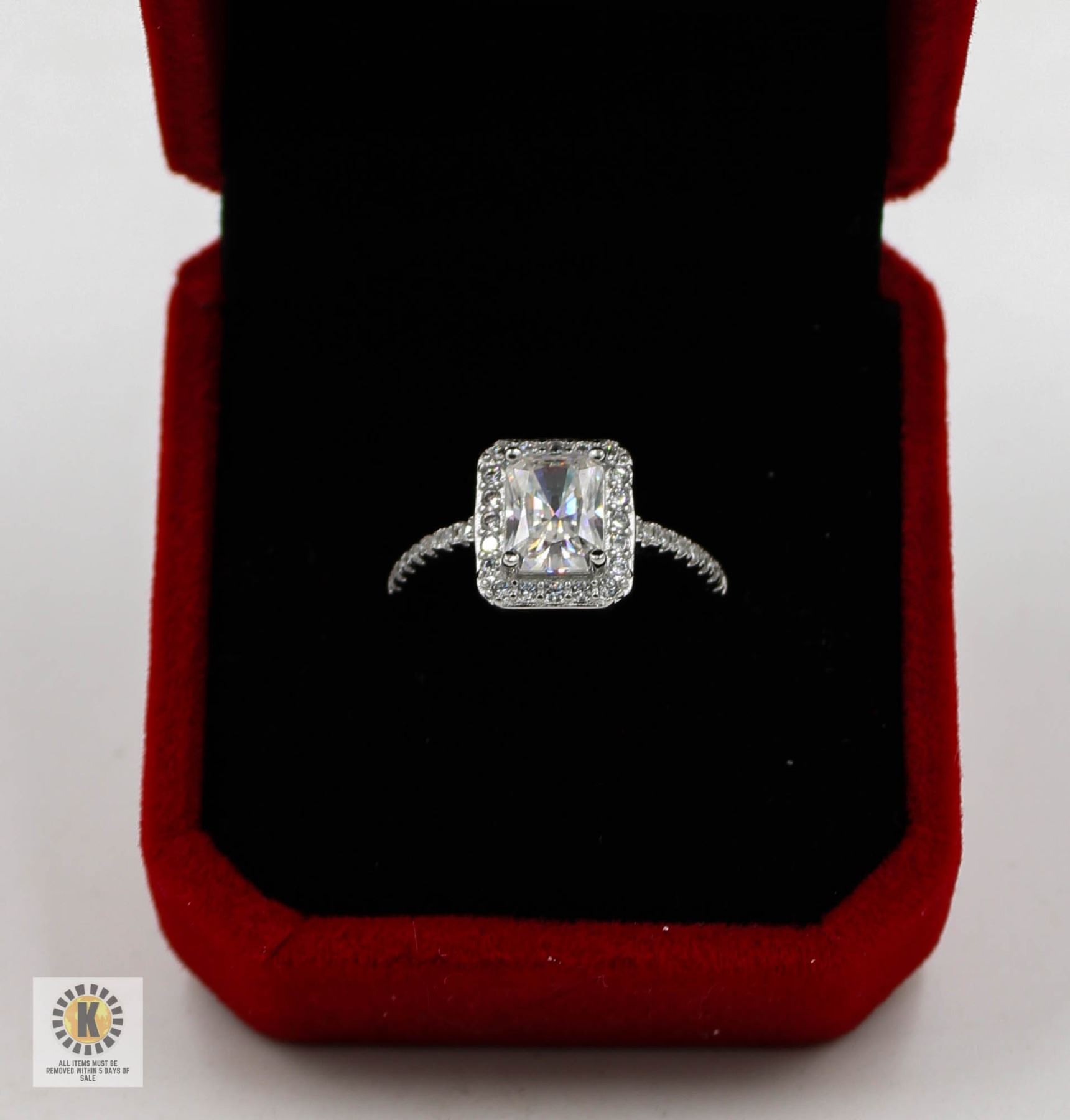 MOISSANITE STONE VVS D COLOR SET WITH 36 ROUND BRILLIANT CUT CUBIC ZIRCONIAS SET IN RECTANGULAR SHAPED HALO WITH SOME SET IN SHANKS SET IN 925 SILVER RING SIZE 7 RETAIL VALUE $1050.00