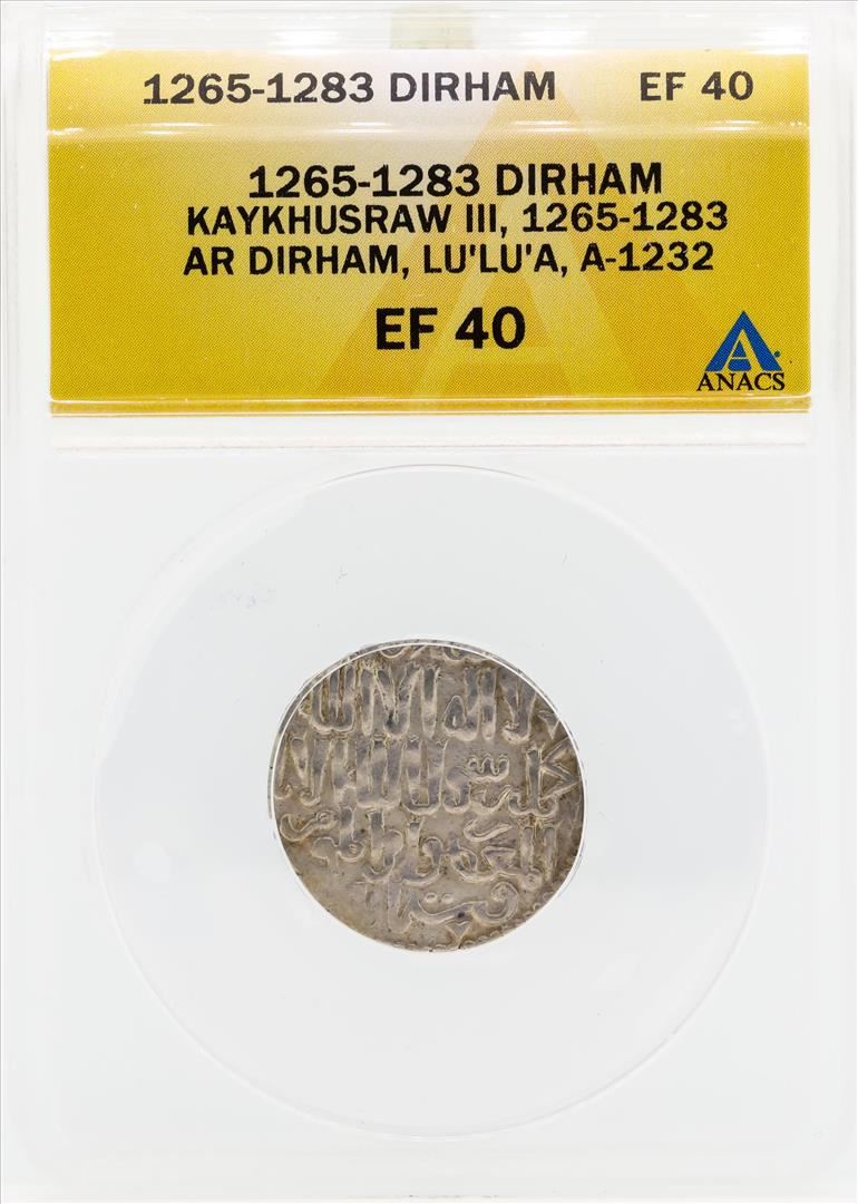 One 1265-1283 Dirham Kaykhusraw III Coin ANACS EF40. ANACS Certified.