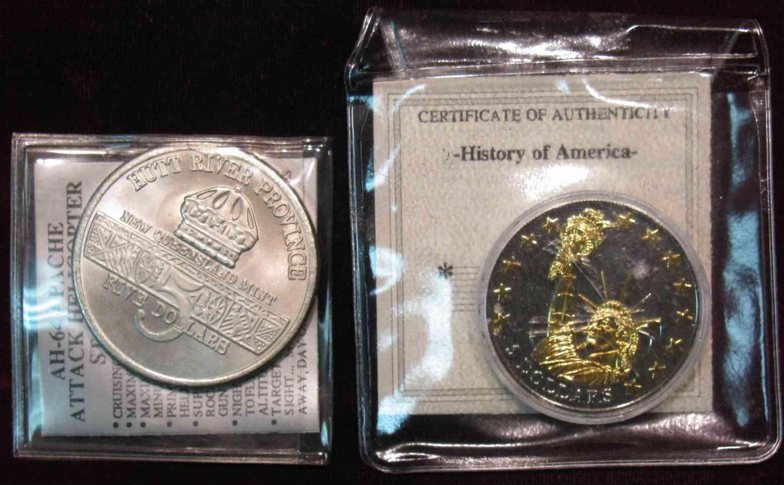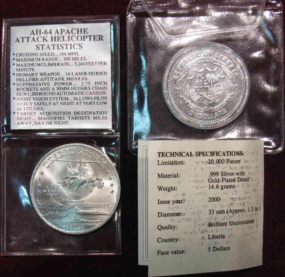1266. 2000 Liberia $5. Statue of Liberty Gold Highlights & 1991 Hutt River Providence $5. Apache Helicopter. BU.