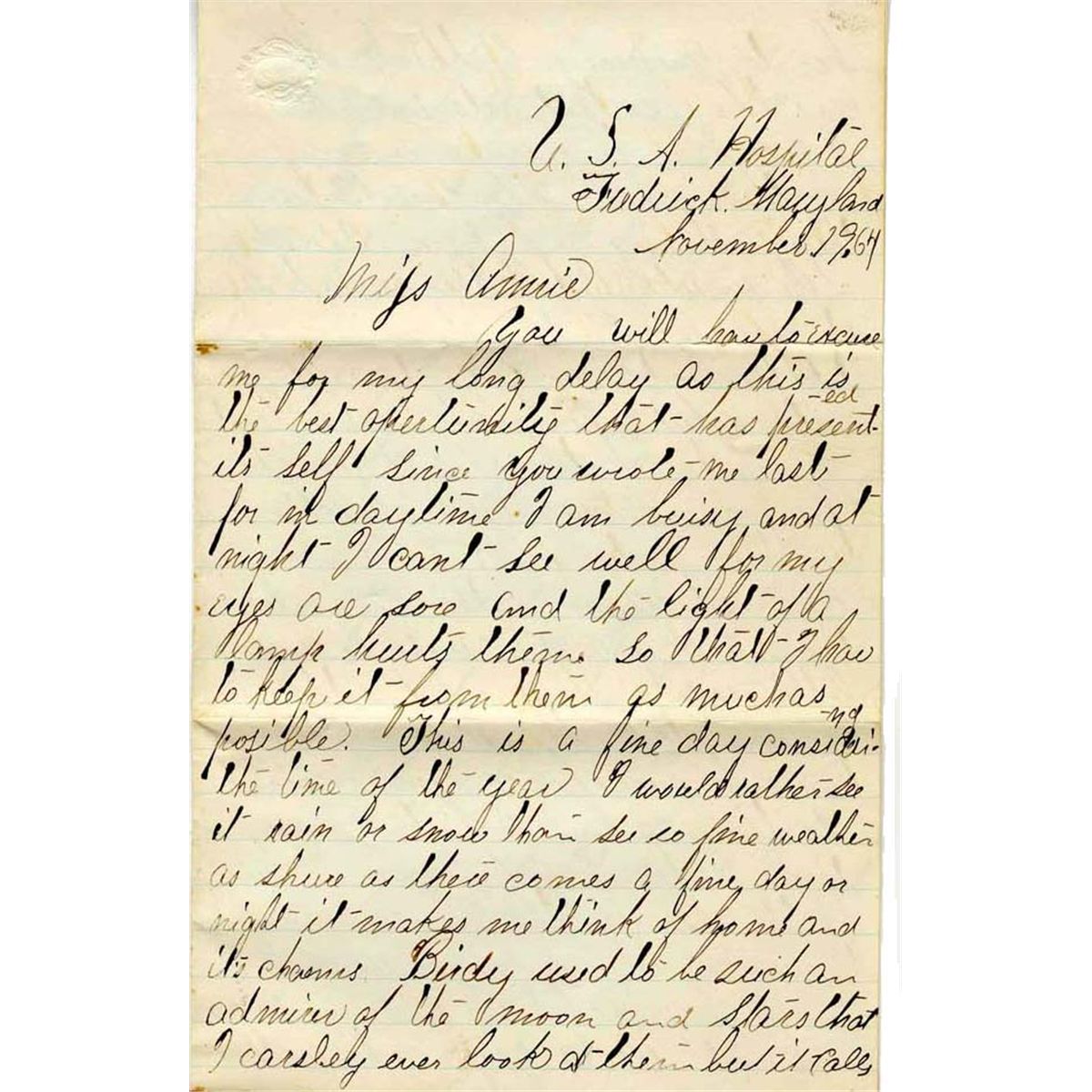 Letter from First Sergeant John M. Ebersole of the 126th Ohio Infantry, Company F. Accompanied by cover. Written in ink and datelined ''U.S.A. Hospital / Frederick, Maryland / November 19 /64,'' letter reads in part: ''…This is a fine day considering the time of the year. I would rather see it rain or snow than see so fine weather. as shure as there comes a fine day or night it makes me think of home and its charms…reminds me of mother when she would see any thing strong or prety in the sky she would call Father or me to see it pap would say oh go long I see it…and go on with what ever he chanced to be at. I dont like the idea of going so far from Malvern…Shaw what is the use of such talk the rebs say there will be war for 4 years more so they can sell out a dozen times be fore I get home if this be the case if the rebs can cary the war on 4 years longer we can I am shure. so let the wide world say as it will Il be gay and hapy still. you speak of geting a litter from Hasher…he is a prety fine fellow yet very wild and foolish I suppose he will be more so since he is in the army of his country…Old Cap Weyand has resigned oh good. I do think he was a little the meanest man I know and the army did not suit him…He will make a beter Carrollton loafer than any thing else…'' The 126th Ohio saw its first action in a heated skirmish at Martinsburg in the summer of 1863. The regiment went on to fight in the Battle of Bristoe Station and the subsequent skirmishing at Centerville, and in every engagement of the Richmond Campaign. John M. Ebersole mustered into Company F on 4 September 1862 and mustered out as a First Sergeant on 25 June 1865. Letter measures 5'' x 8'' and runs 3pp. Some separation at folds, otherwise near fine condition.