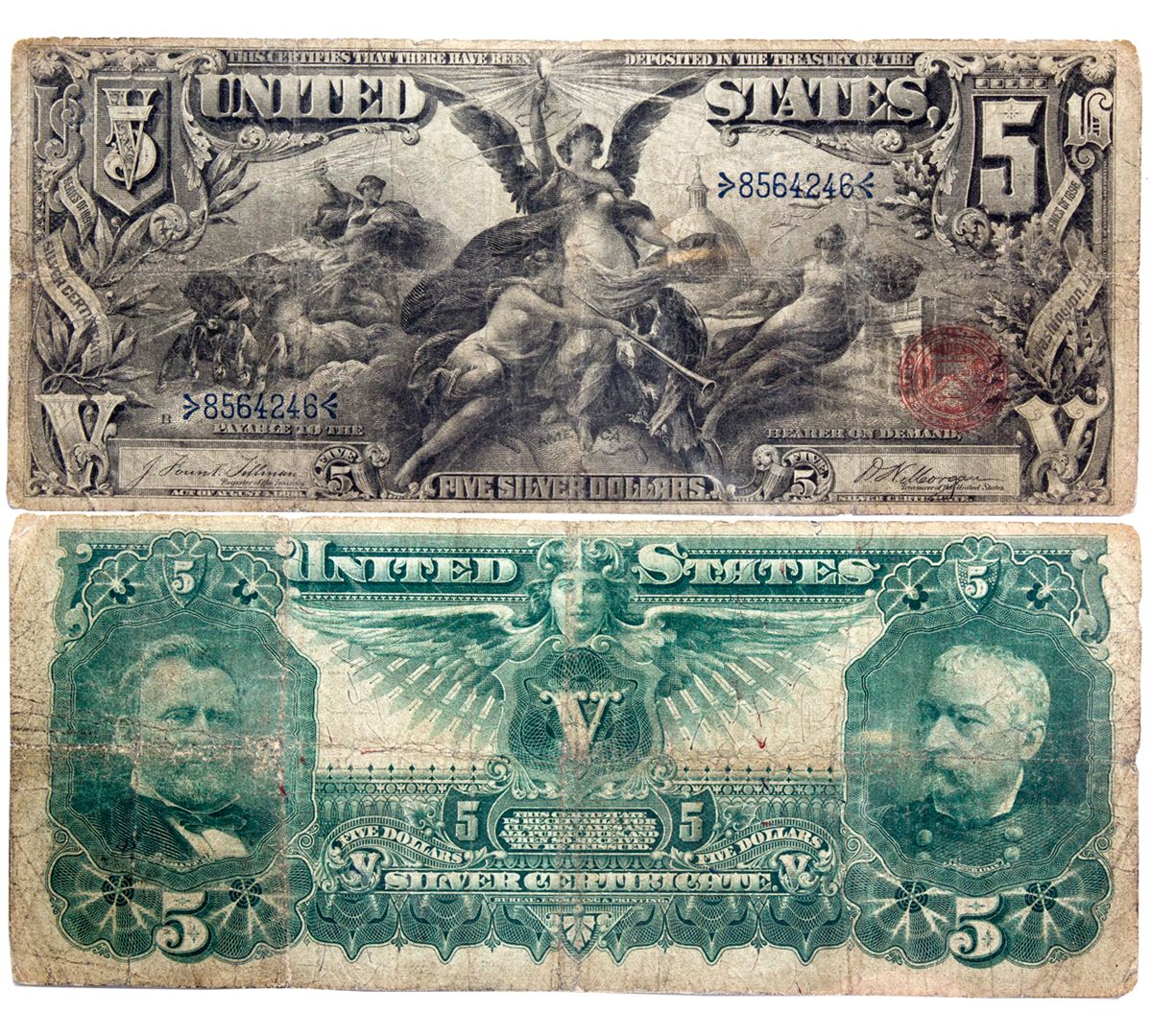 1896 A nicely centered note which is the scarcest of the Educational Notes. The $5 depicts ‘Electricity Presenting Light to the World.’ This note, although not in high grade, is nice for the grade with no marks, staining, or pinholes. An affordable example for someone to complete their Educational collection. HKA#63481