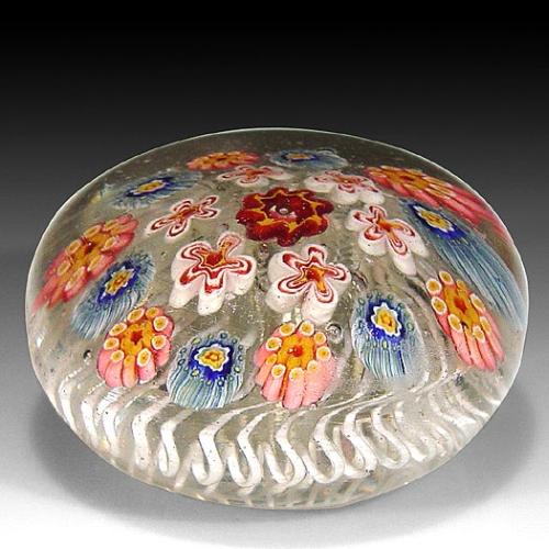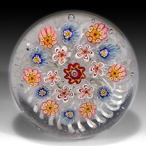 Old Miscellaneous spaced millefiori paperweight, with a central red and yellow crimped rod, encircled by a spaced ring of white and red flower-shaped canes, and a border ring of complex canes, on a spiraling white latticinio cushion. Diameter 2 1/8". NO RESERVE