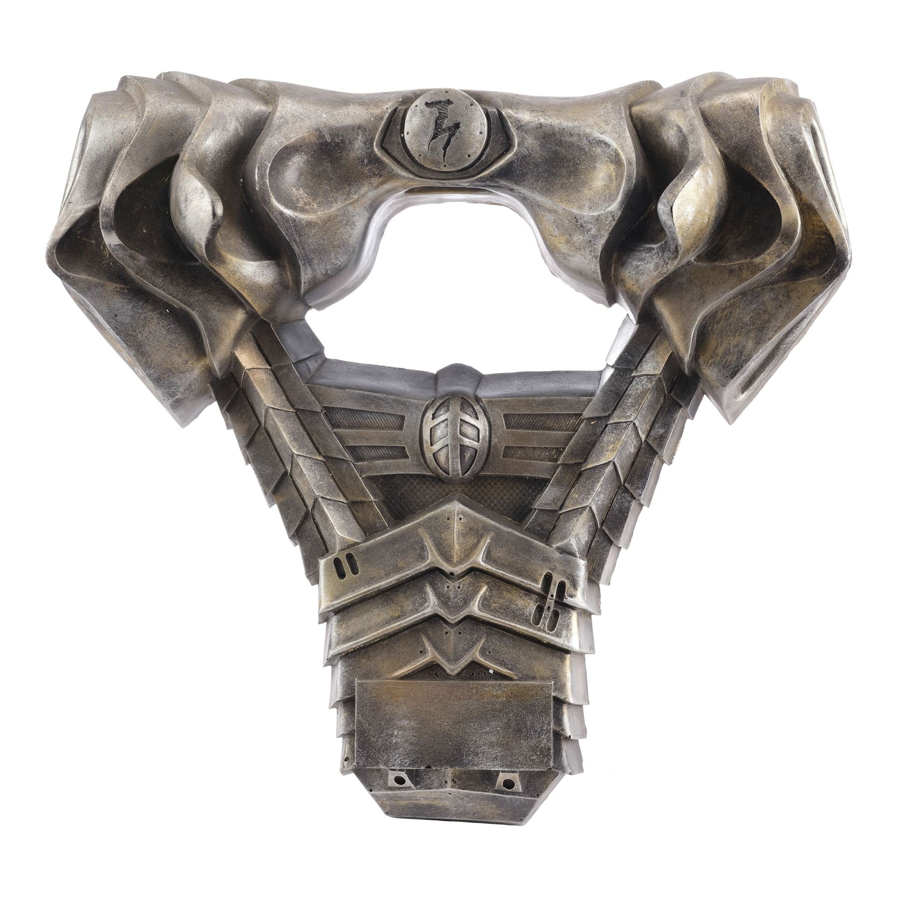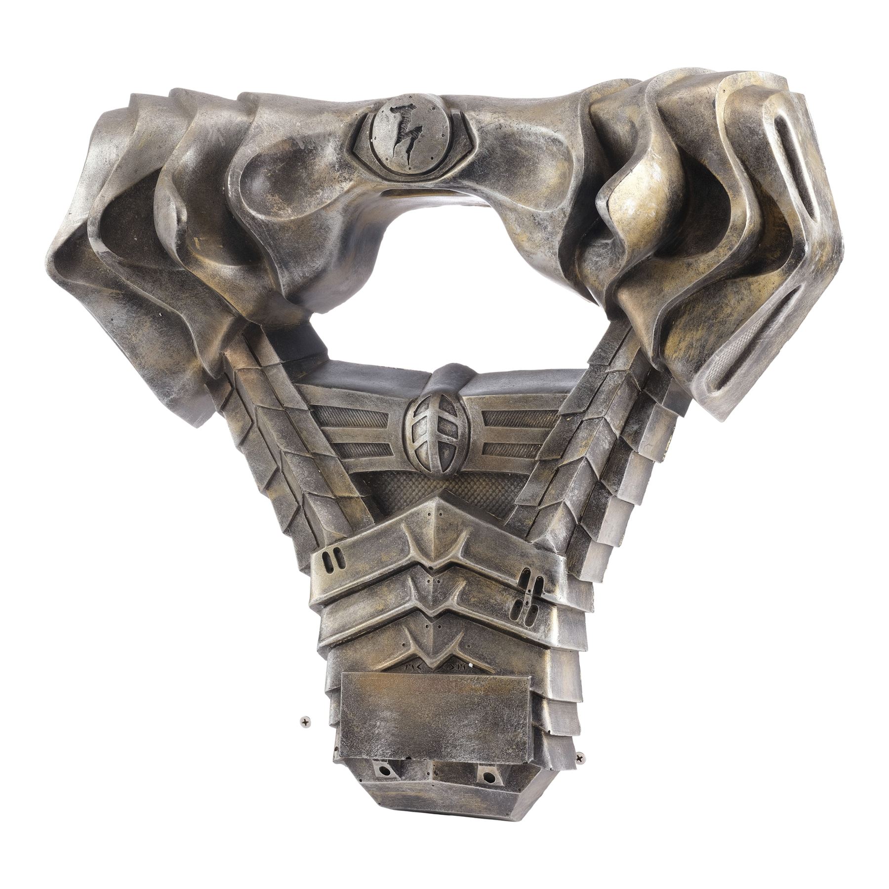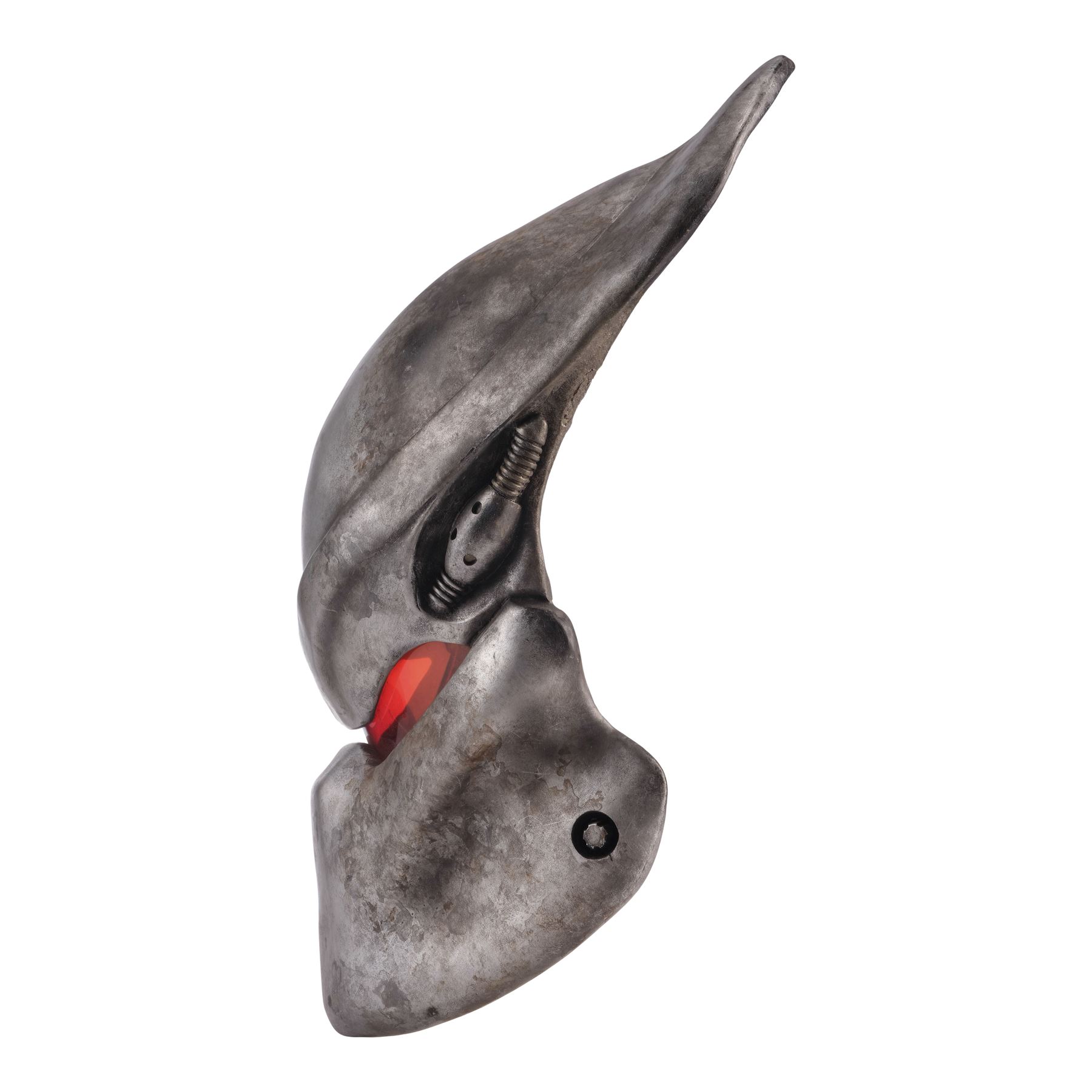 Made of fiberglass, this replica comes in two parts: the environment mask and a display base. The mask features a set of red LEDs on the helmet's laser target apparatus powered by two AA batteries wired on the interior side. A switch on the interior activates the lights. The mask was painted silver-color with production-applied tarnishing, and has a red plastic visor affixed over the eyeholes. The top interior of the mask has a metal wire to allow for easy hanging. The display base features an armored sculpt and was painted in various metallic colors. This lot exhibits notable adhesive residue on the interior. Dimensions: 20" x 18" x 7" (51 cm x 45.75 cm x 17.75 cm)
