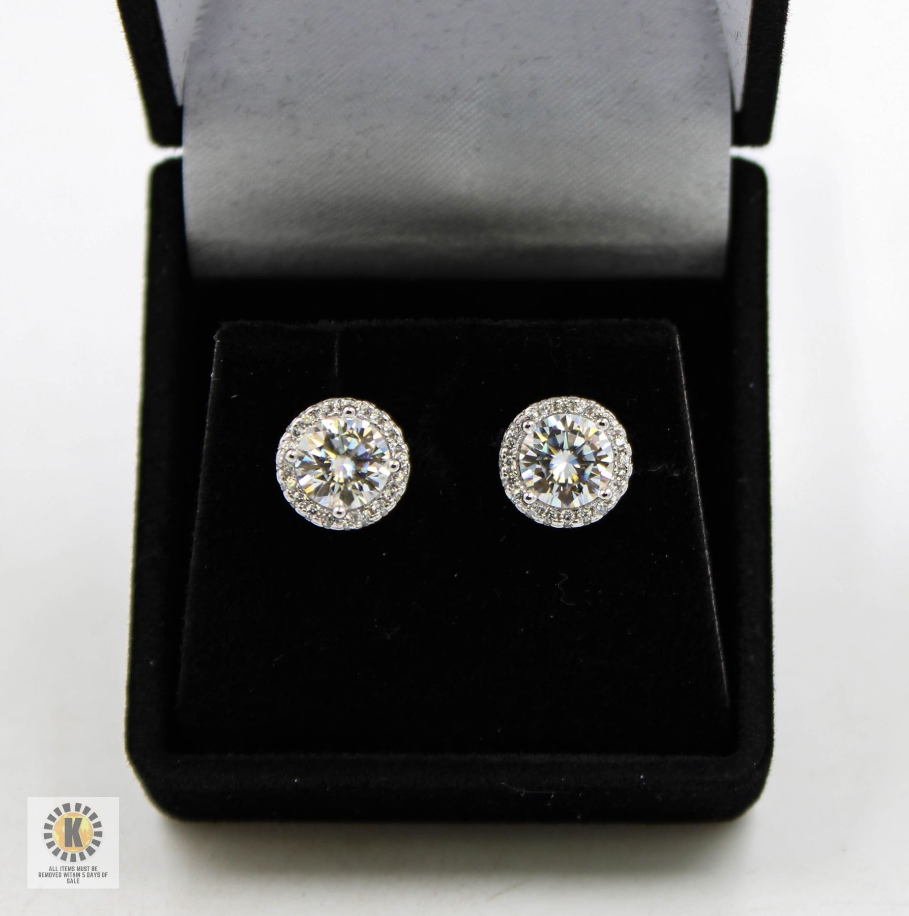 BRILLIANT CUT MOISSANITE STONES VVS D COLOR WITH 40 ROUND BRILLIANT CUT CUBIC ZIRCONIA SET IN HALOS SET IN 925 SILVER EARRINGS WITH SCREW BACKS RETAIL VALUE $925.00