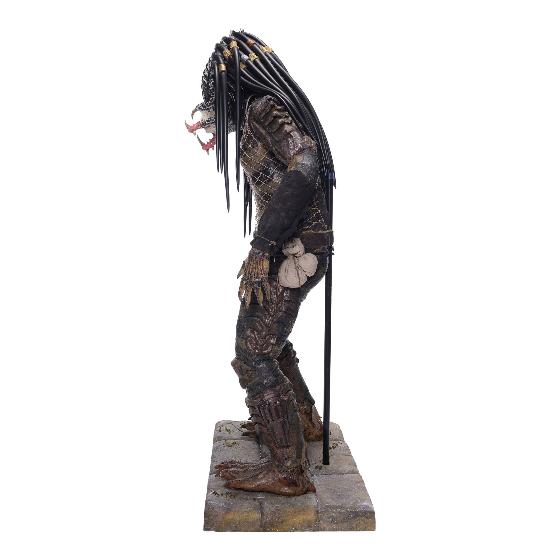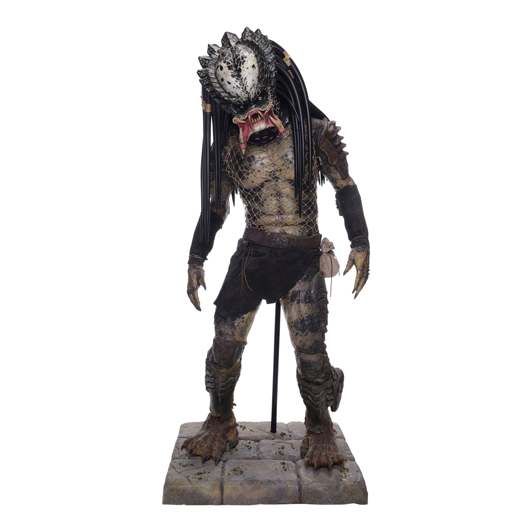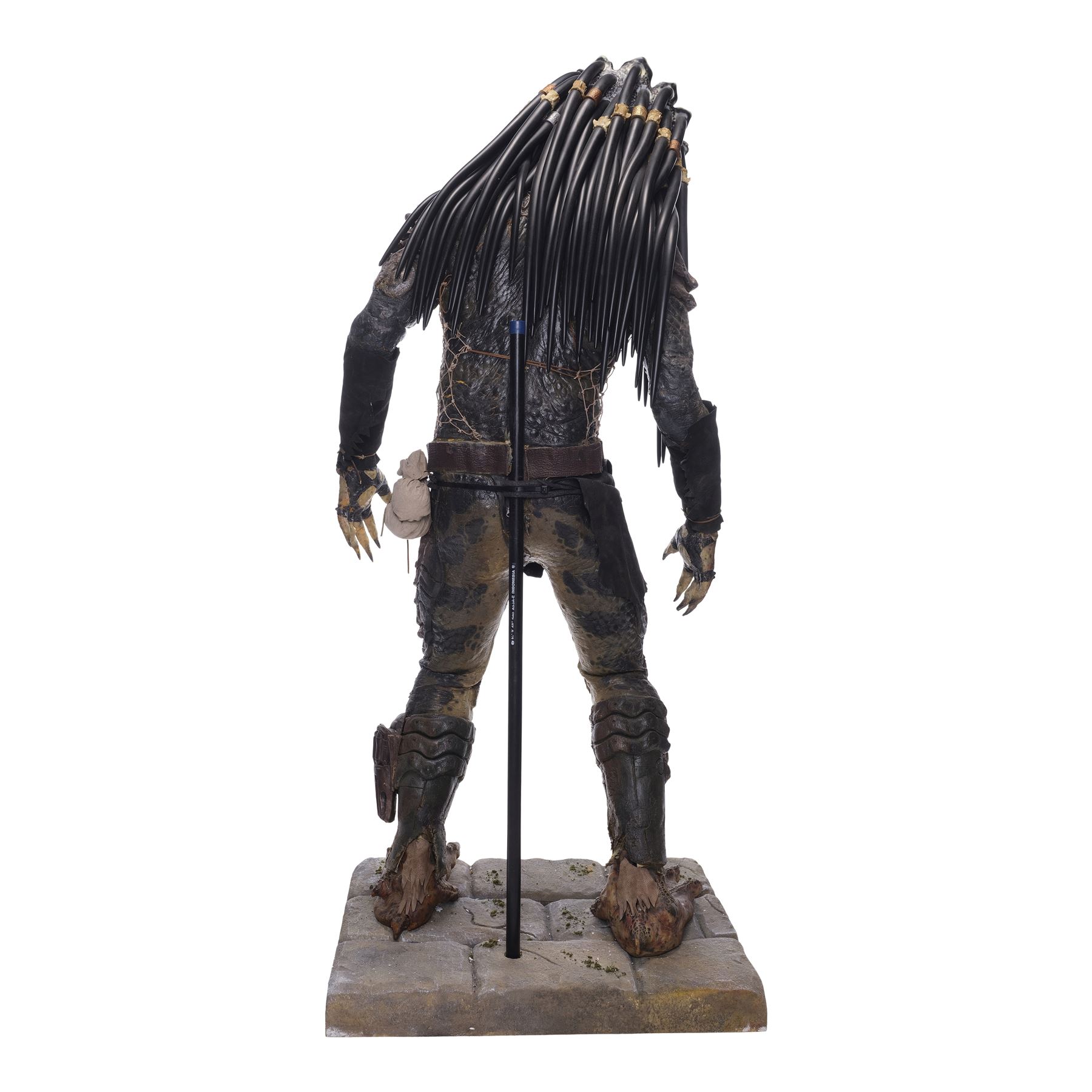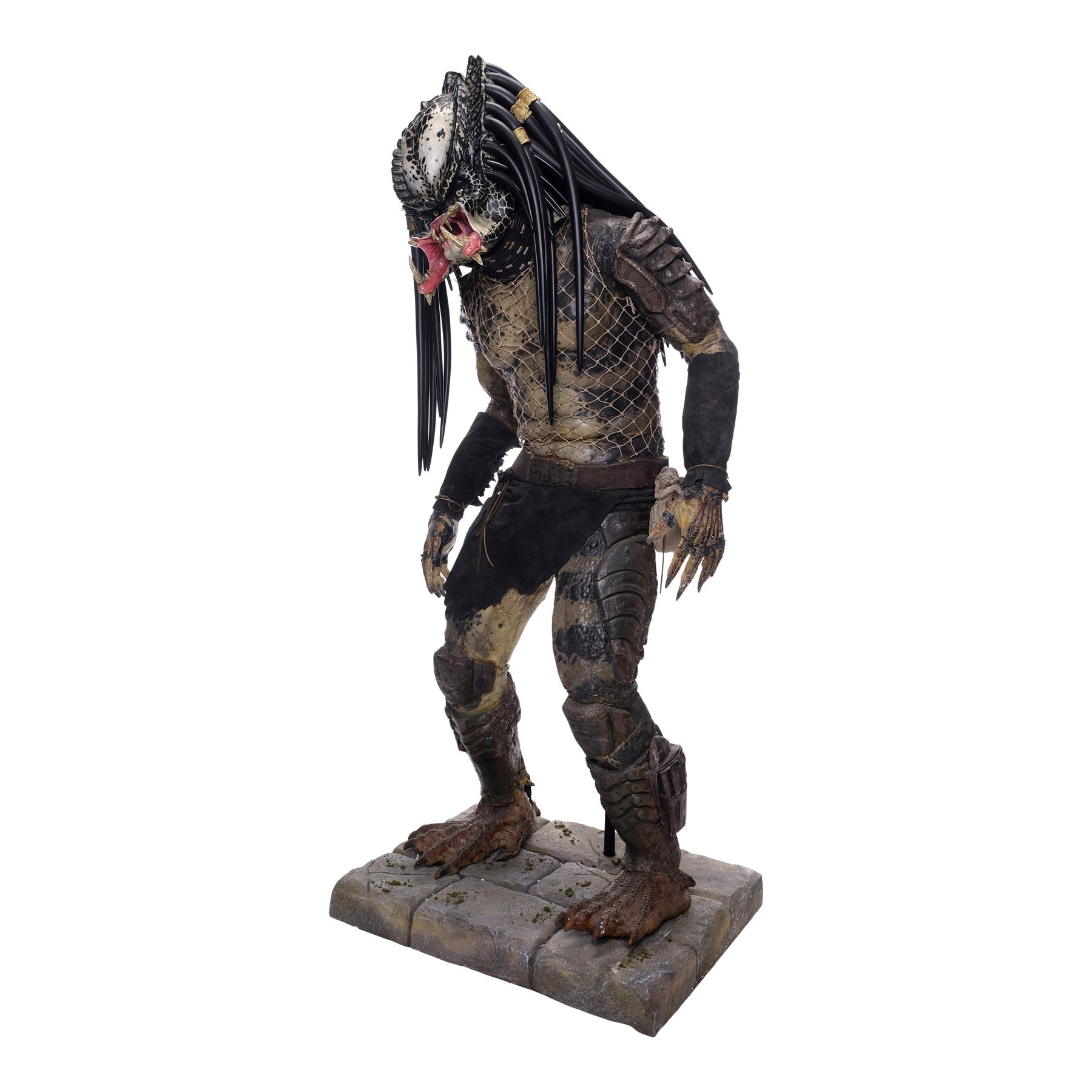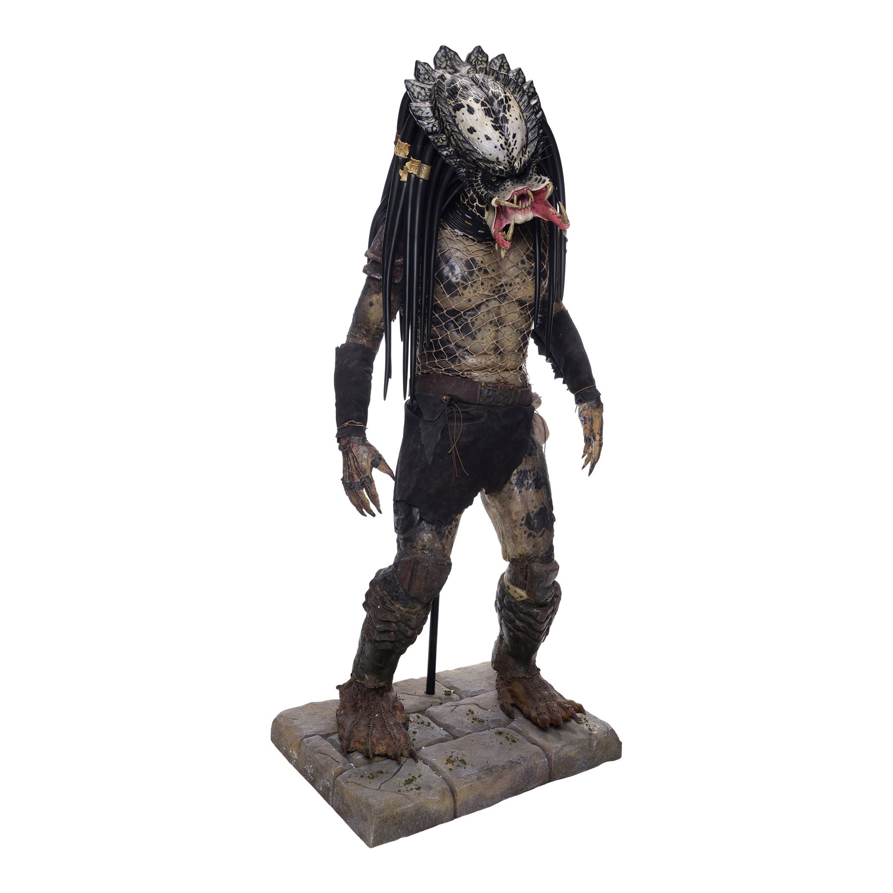 This costume consists of a foam latex Predator bodysuit hand painted in shades of black, gray, and brown, dressed with replica leather gauntlets and loincloth, an original belt, and a twine netting over the chest. The bodysuit is secured with a flesh-color zip closure on the back and comes displayed on a custom-made mannequin on a foam base. A resin replica head with foam locs was added to complete the display. This lot exhibits cracking in the foam, flaked paint, and foam fragility. Dimensions: 32" x 27" x 74" (81.25 cm x 68.5 cm x 188 cm)