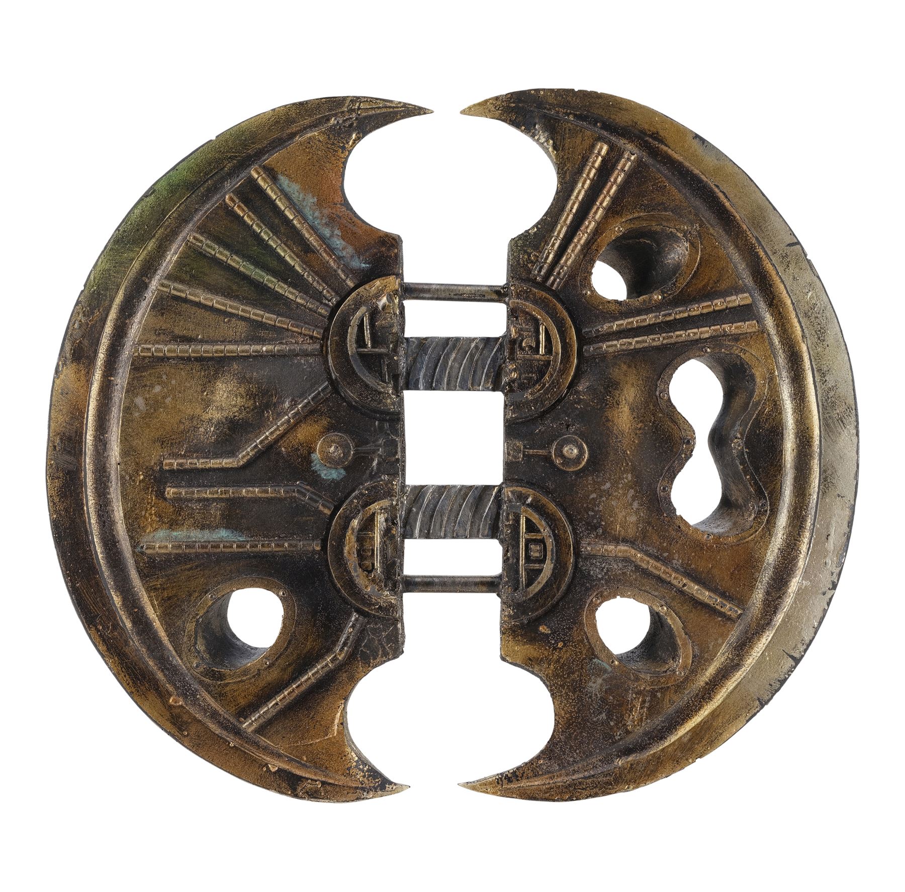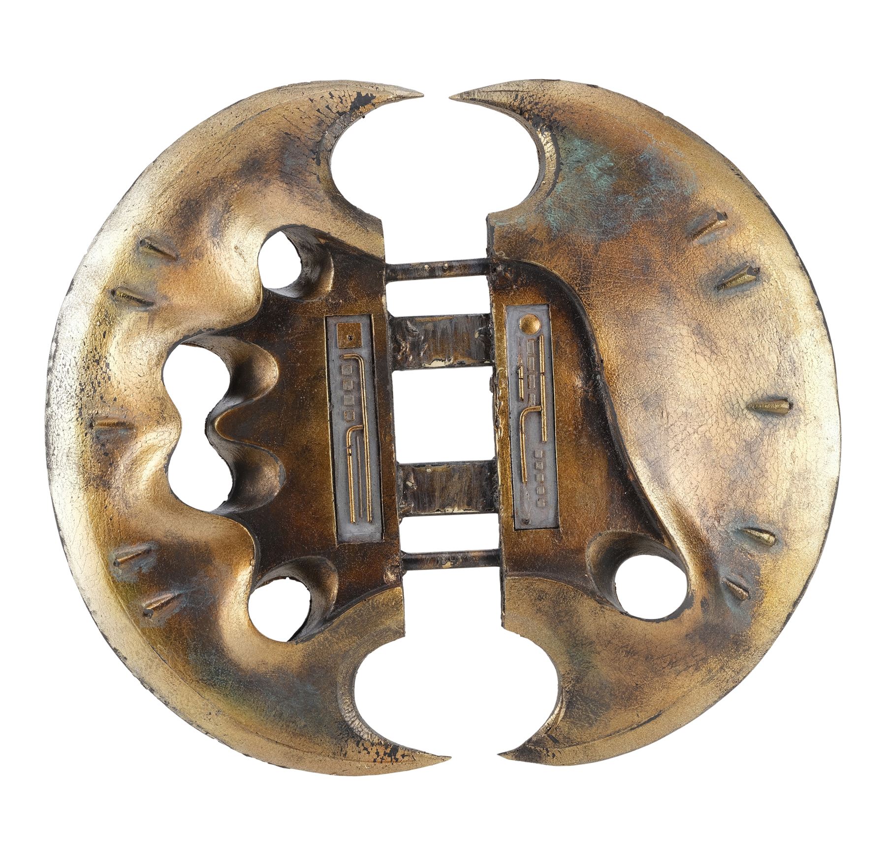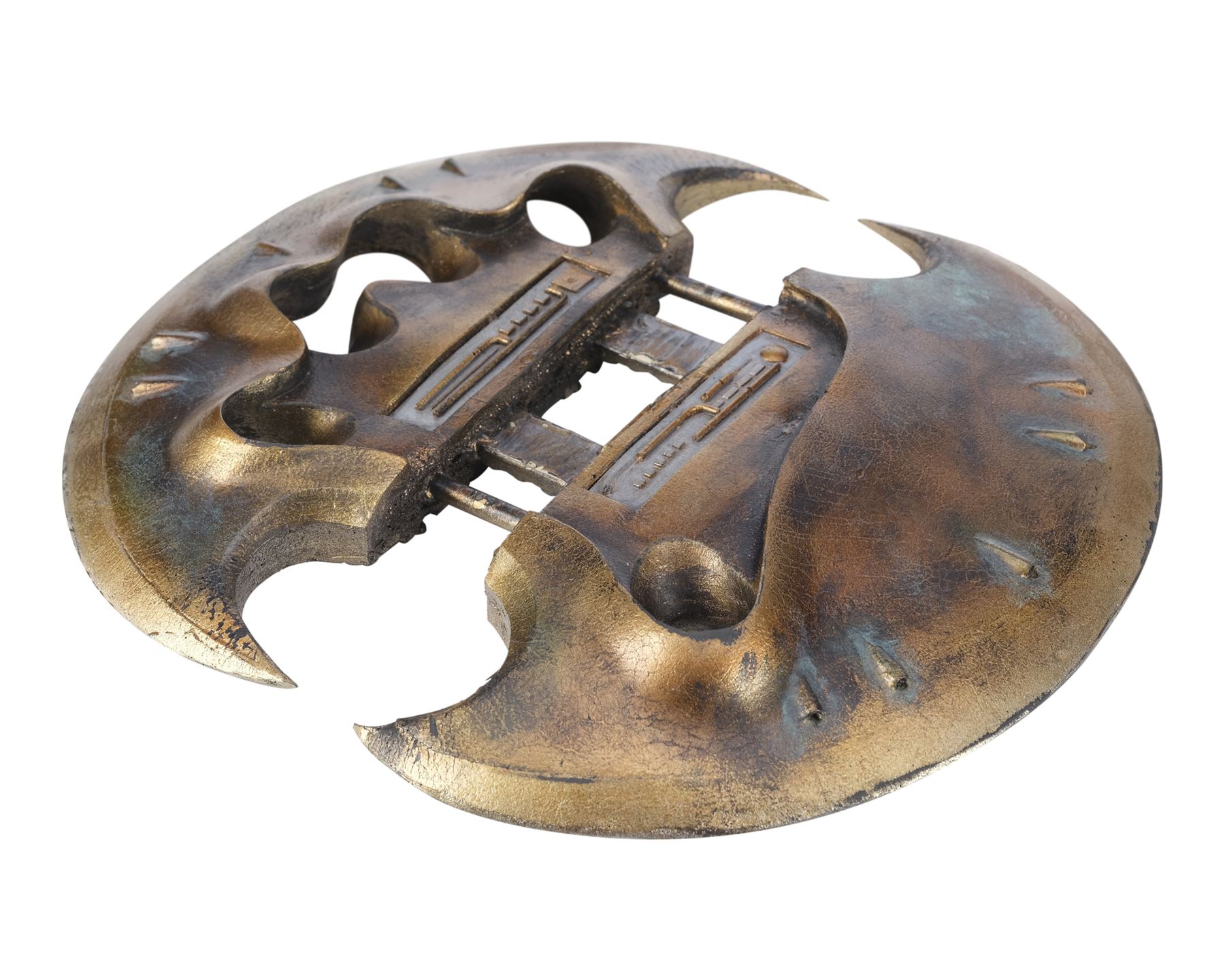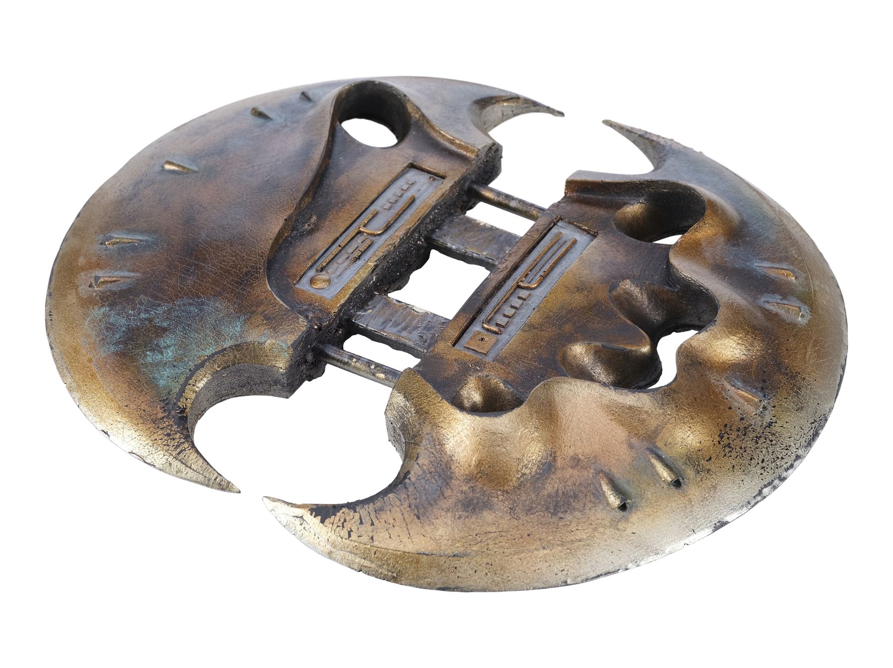 Both operable servo-equipped and static, nonmechanical Smart Discs were manufactured for production. This notched, foam rubber stunt Disc is painted copper-color to appear mechanical with large finger holes, spiked detailing, and static Yautja technology molded on both halves. The halves are connected in an "open" position via four slatted bars at their center. The Disc exhibits cracking throughout from age and the copper-color paint exhibits green discoloration in some places from age. Dimensions: 12" x 10" x 0.5" (30.5 cm x 25.5 cm x 1.5 cm)