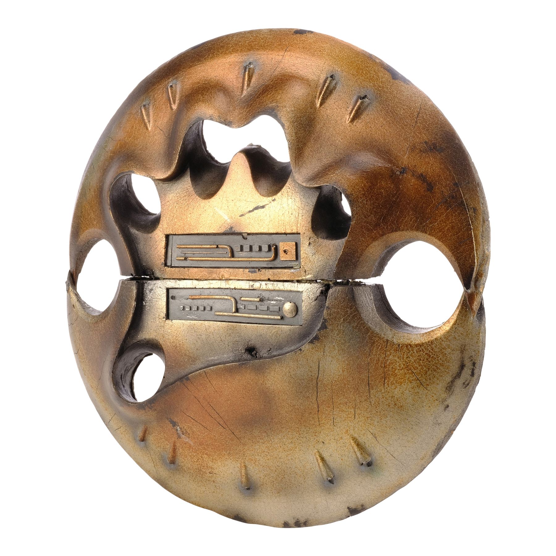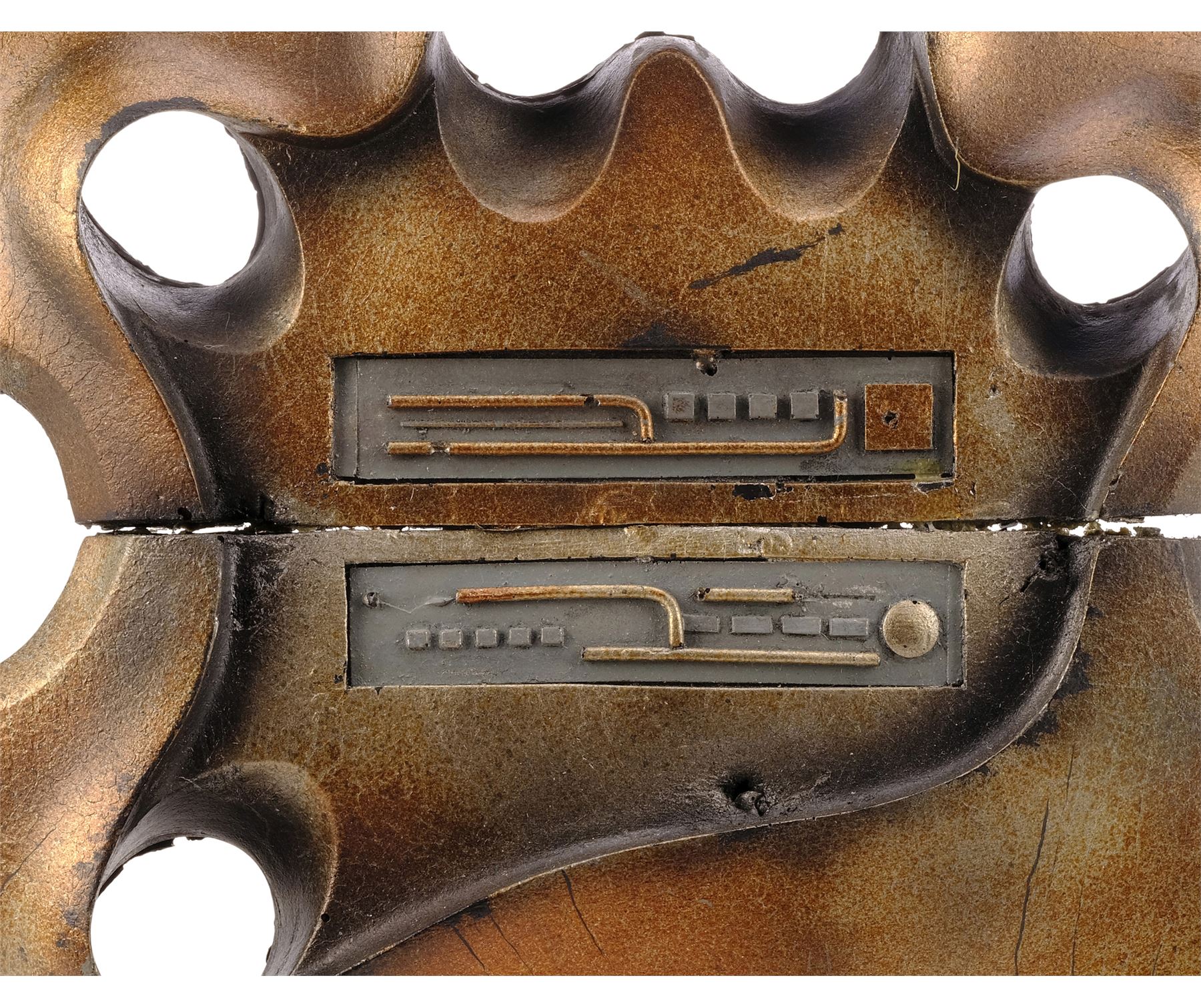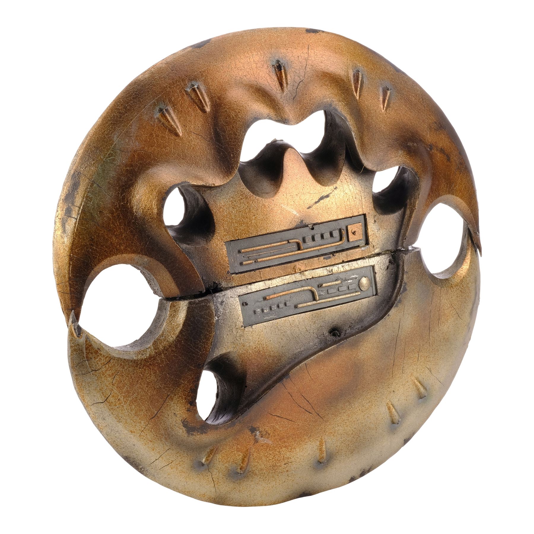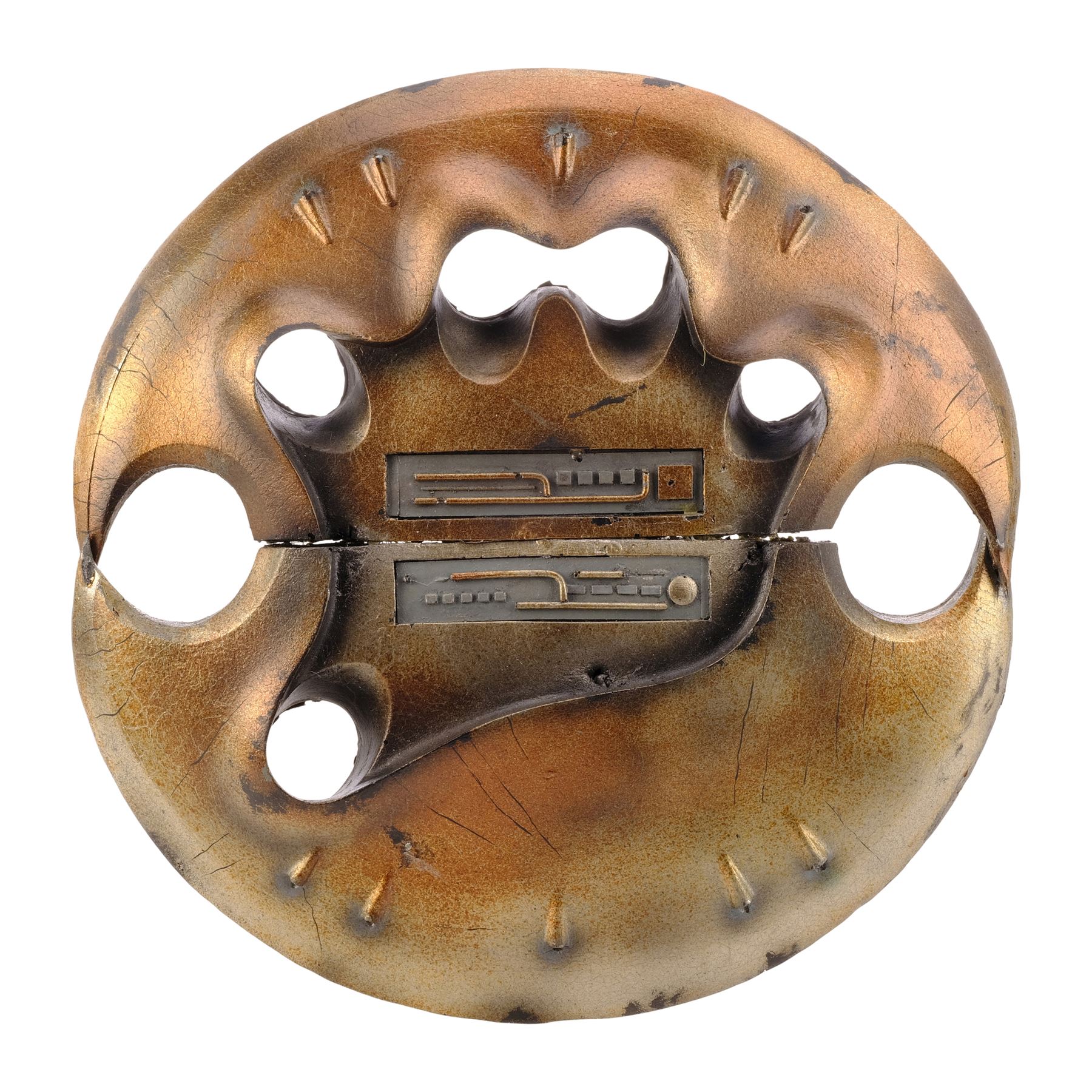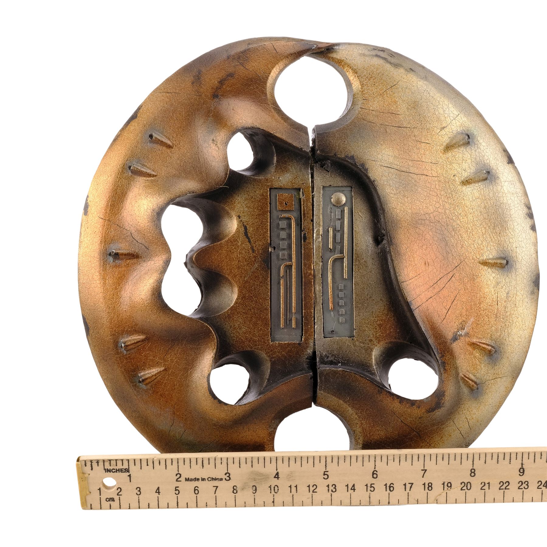 Both operable servo-equipped and static, nonmechanical Smart Discs were manufactured for production. This notched, two-piece rubber stunt Disc is painted copper-color to appear mechanical with large finger holes, spiked detailing, and static Yautja technology molded on both halves. It exhibits cracking throughout from age and the copper paint exhibits green discoloration in some places from age. Dimensions: 10" x 10" x 1.5" (25.5 cm x 25.5 cm x 4 cm)