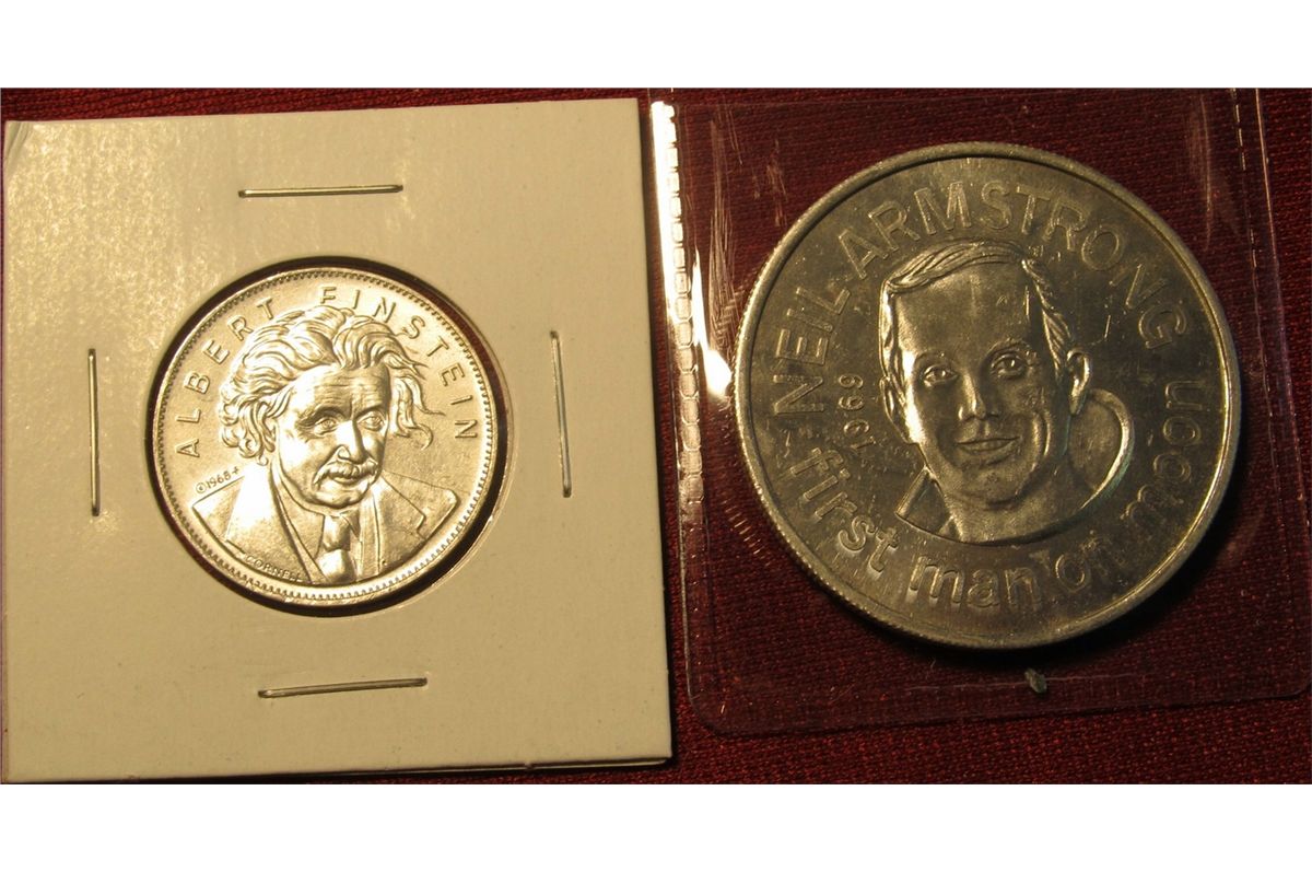 1274. 2 aluminum tokens – Albert Einstein and Neil ArMStrong, First man on the Moon