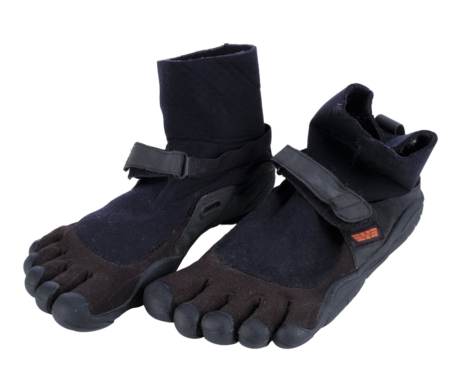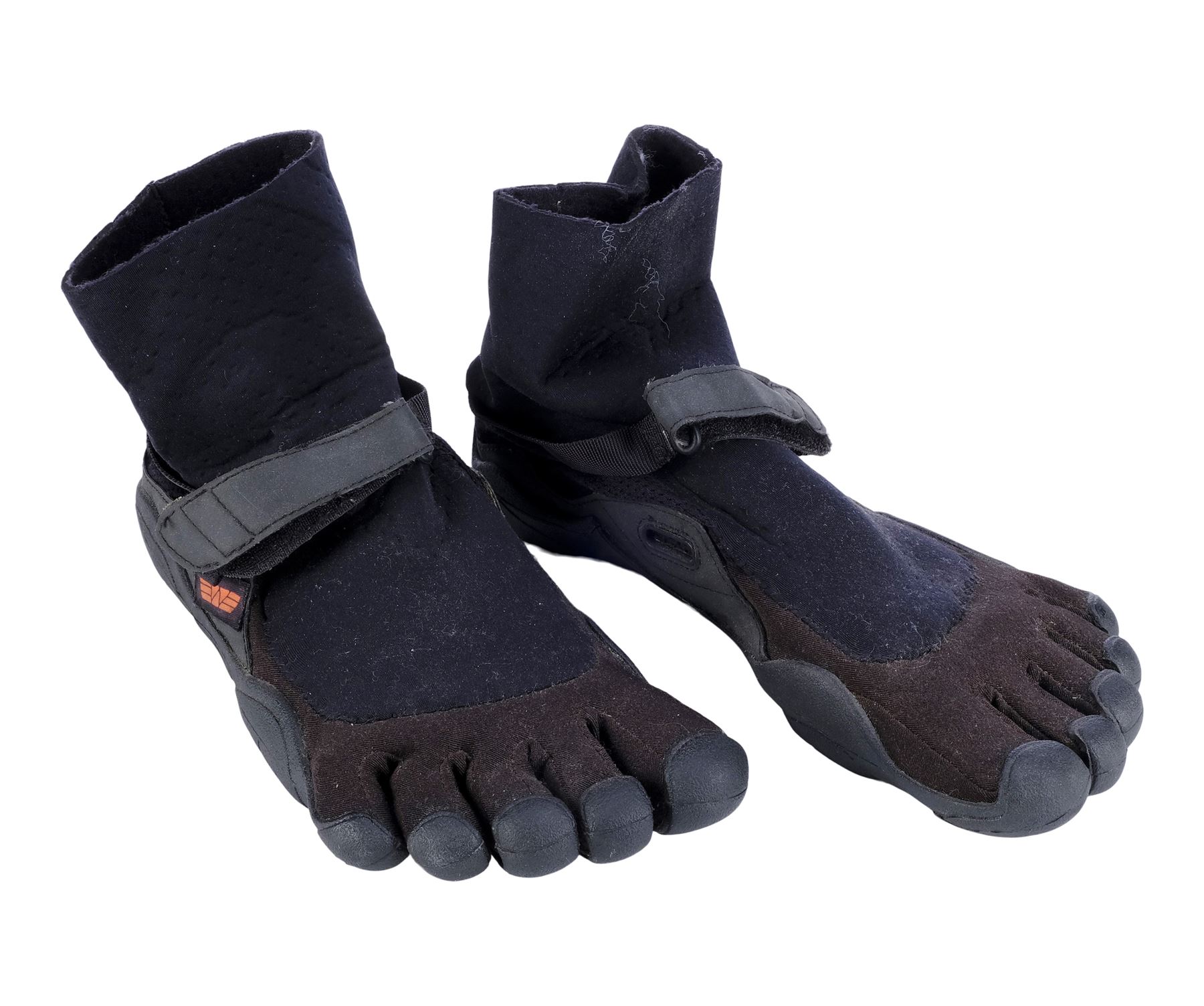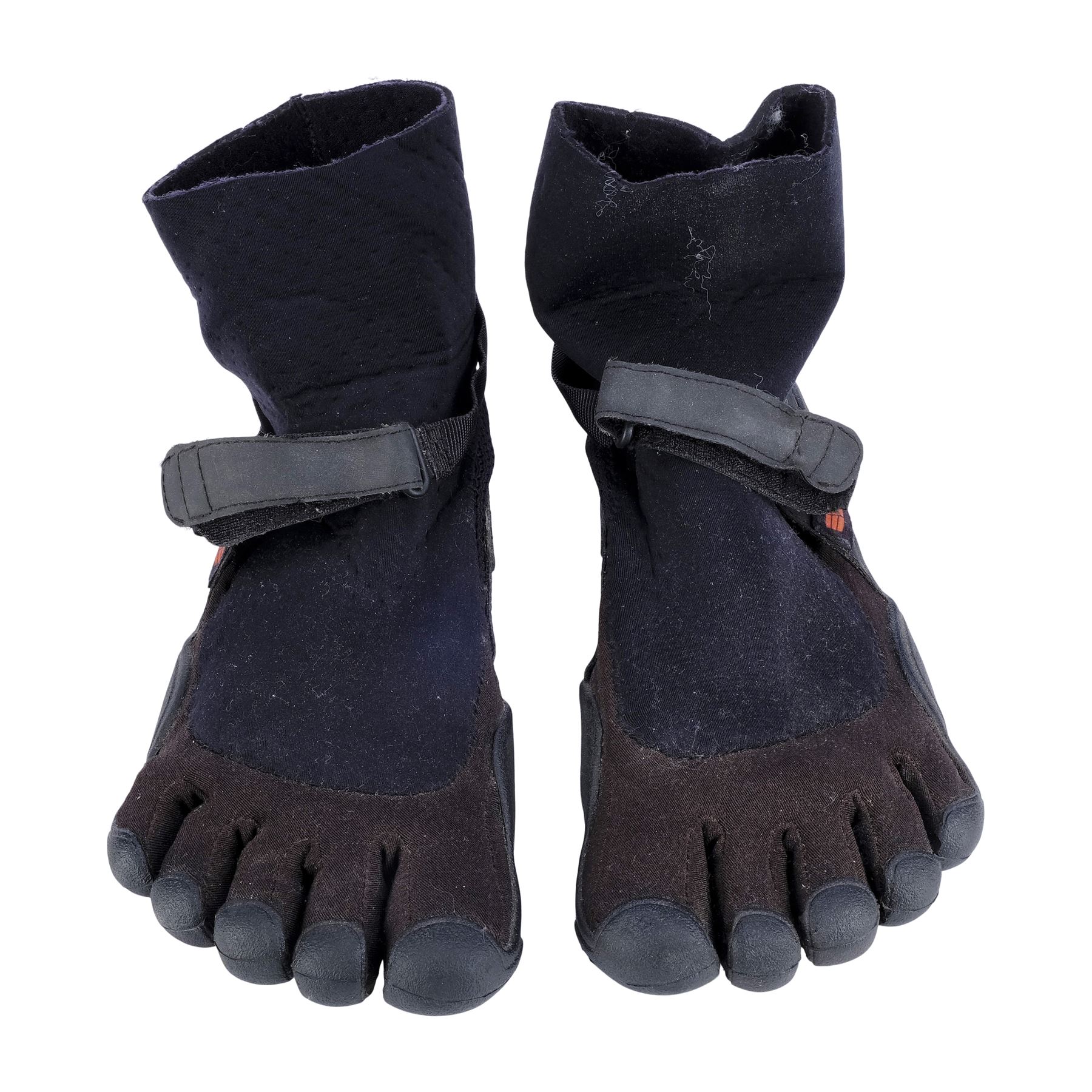 This lot consists of black and blue neoprene Vibram toe sock shoes with black elastic fastening strips. This lot exhibits tearing material on the ankles.