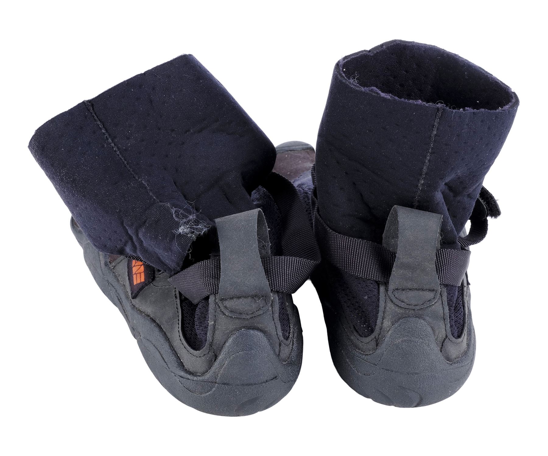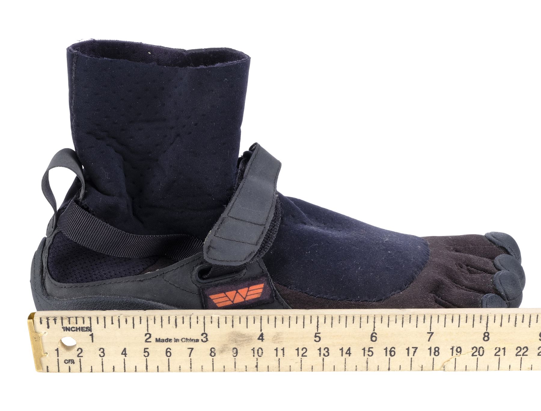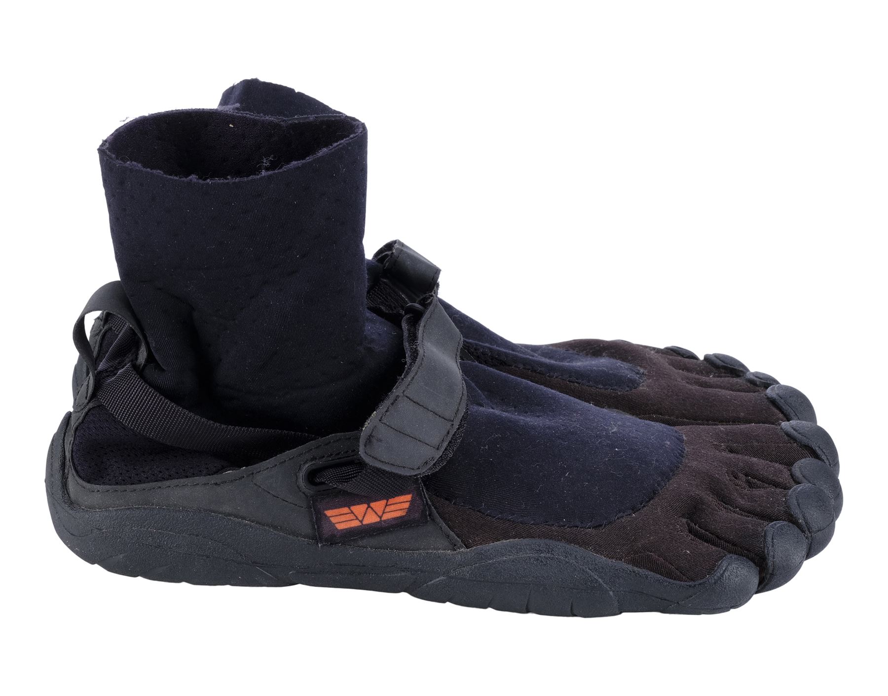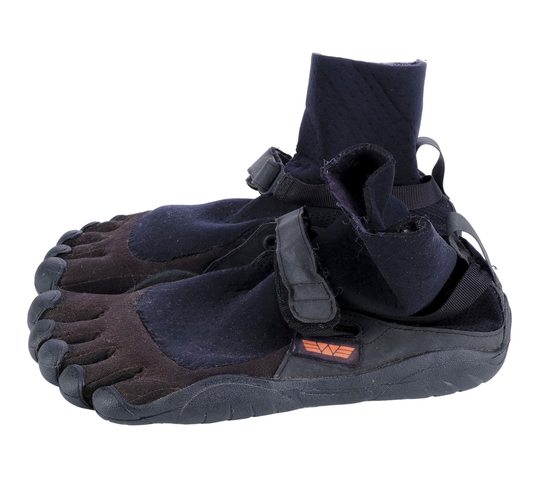 This lot consists of black and blue neoprene Vibram toe sock shoes with black elastic fastening strips. This lot exhibits tearing material on the ankles.