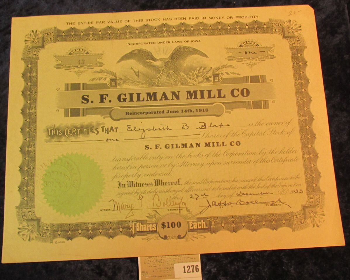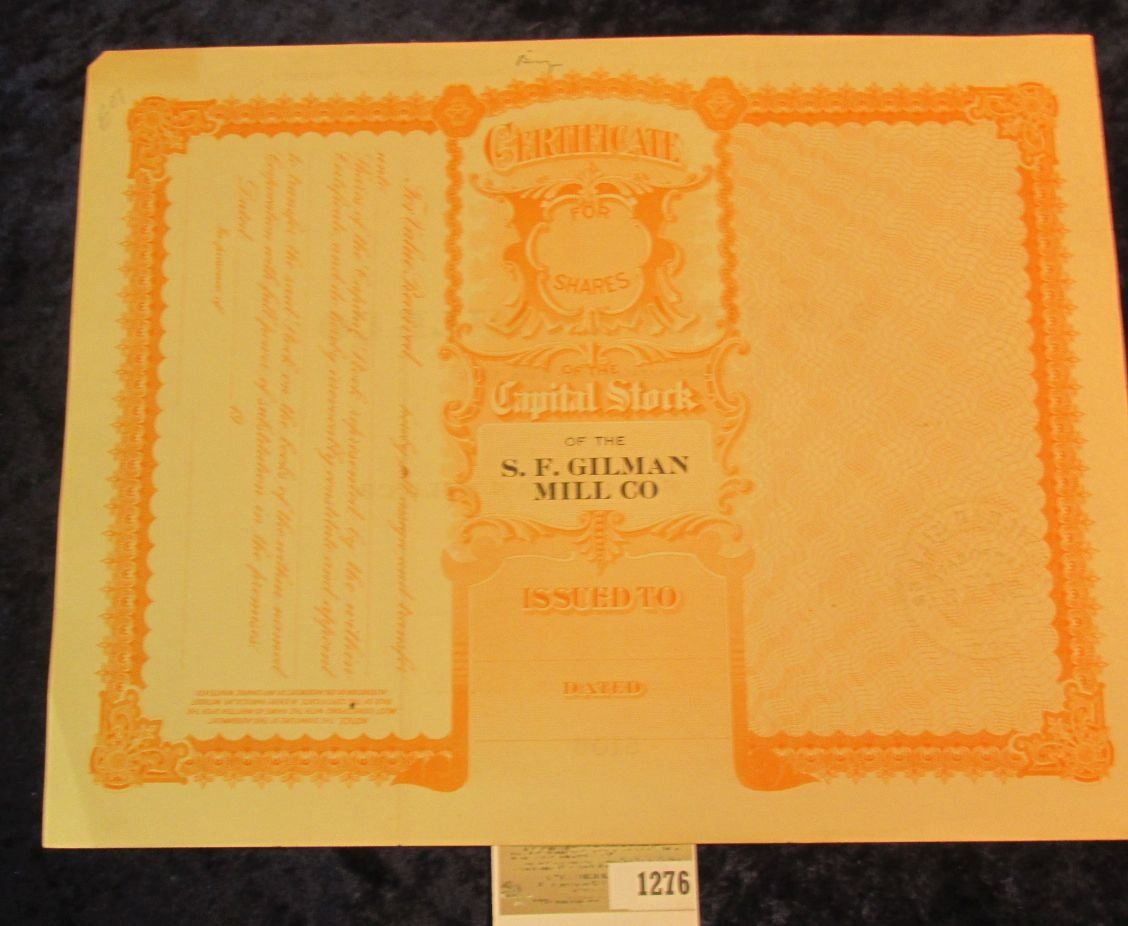 1276 _ No. 43 One Share "S.F. Gilman Mill Co." Stock Certificate dated 27th December 1923., central