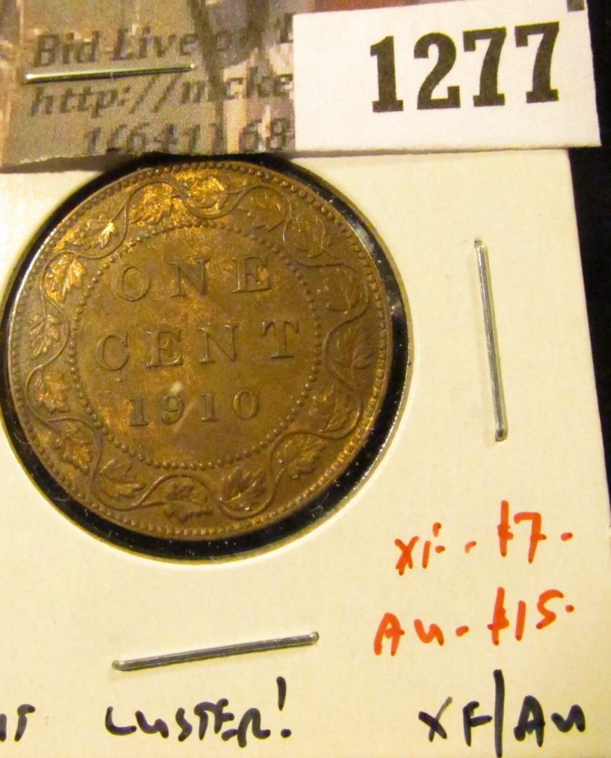 1277 . 1910 Canada One Cent, XF/AU, luster, XF value $7, AU value $