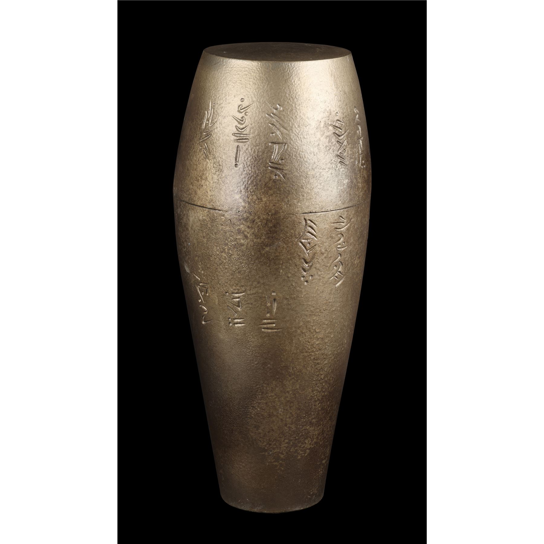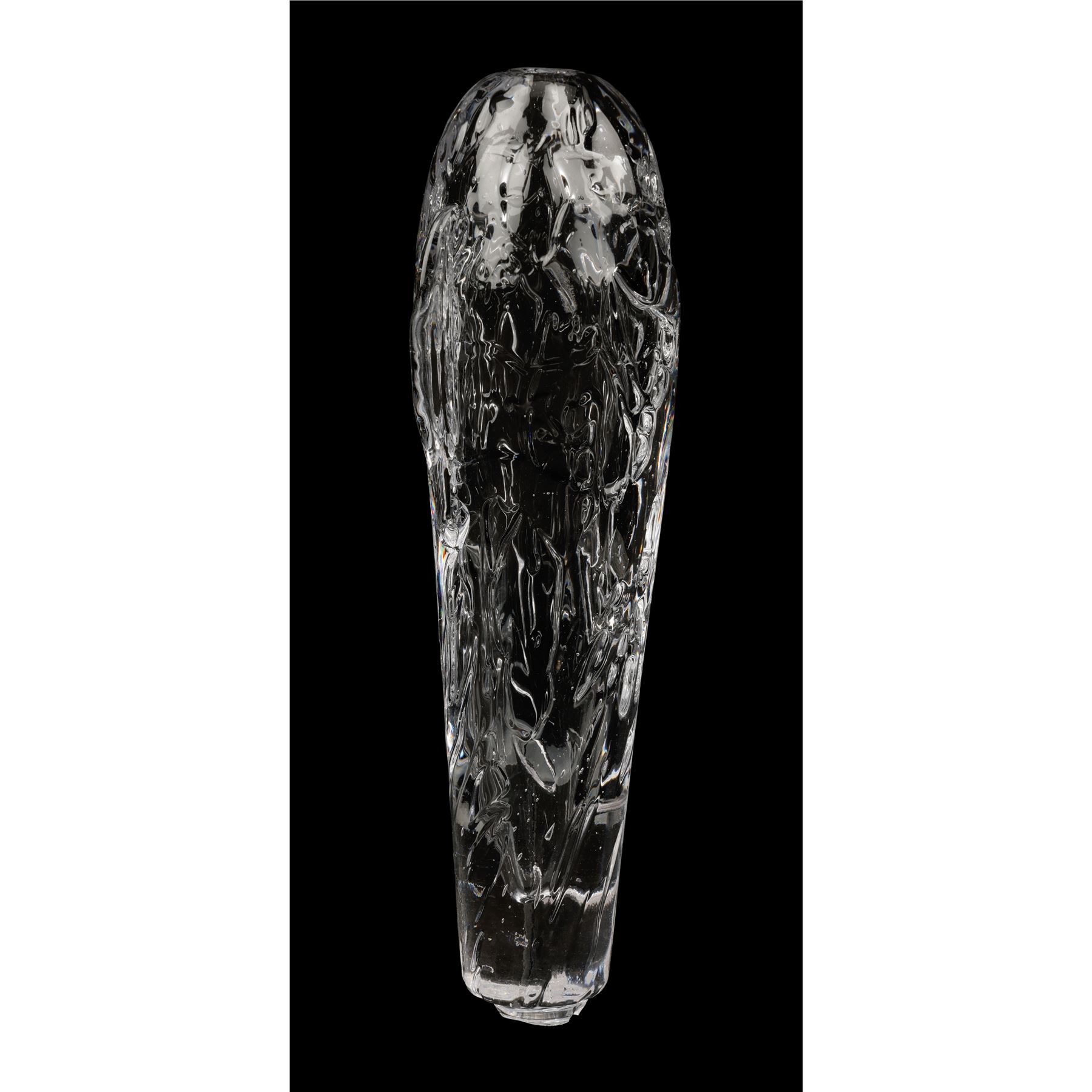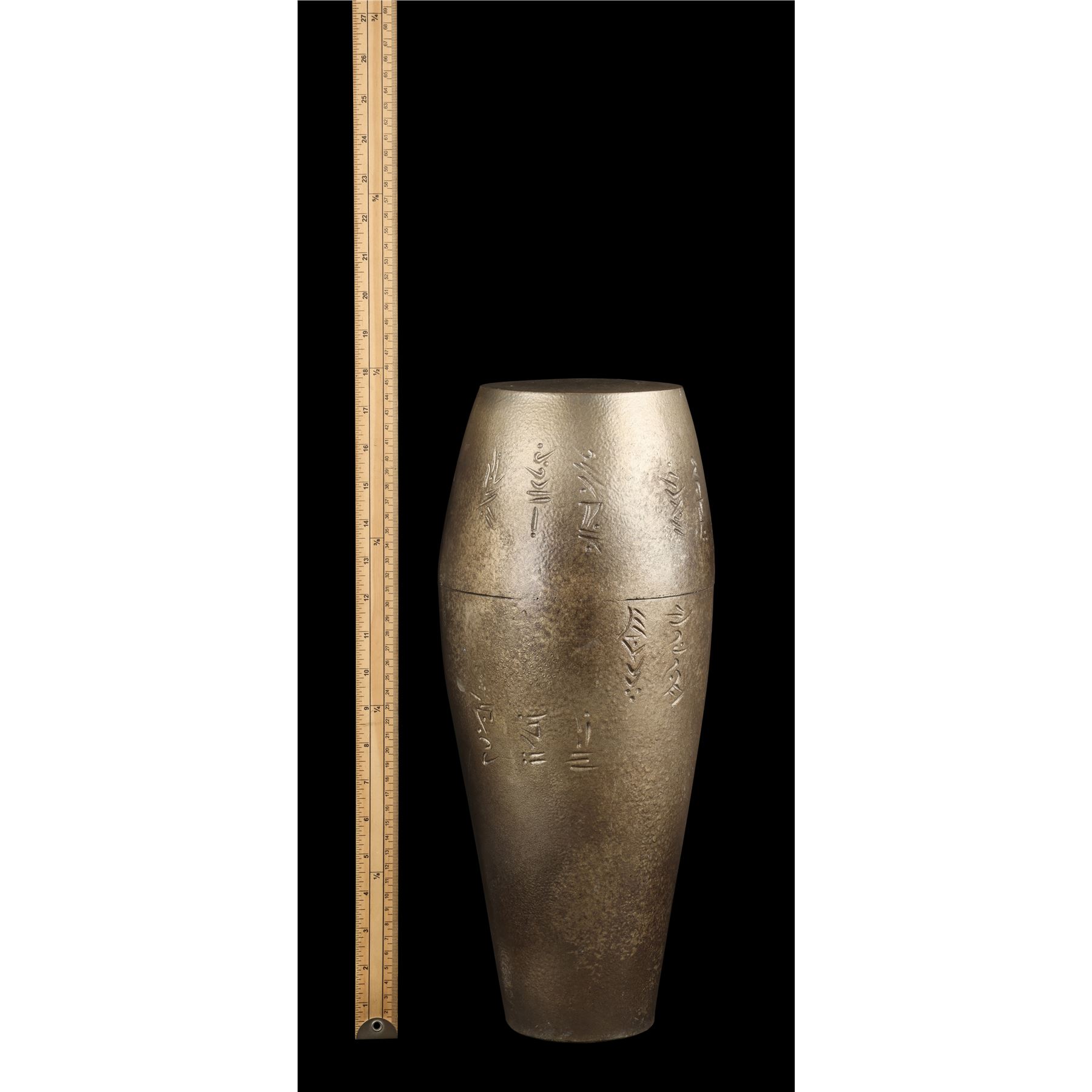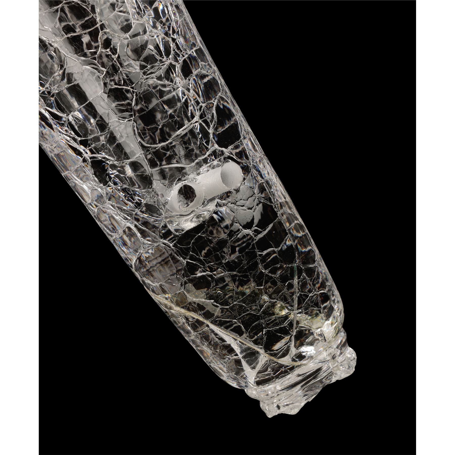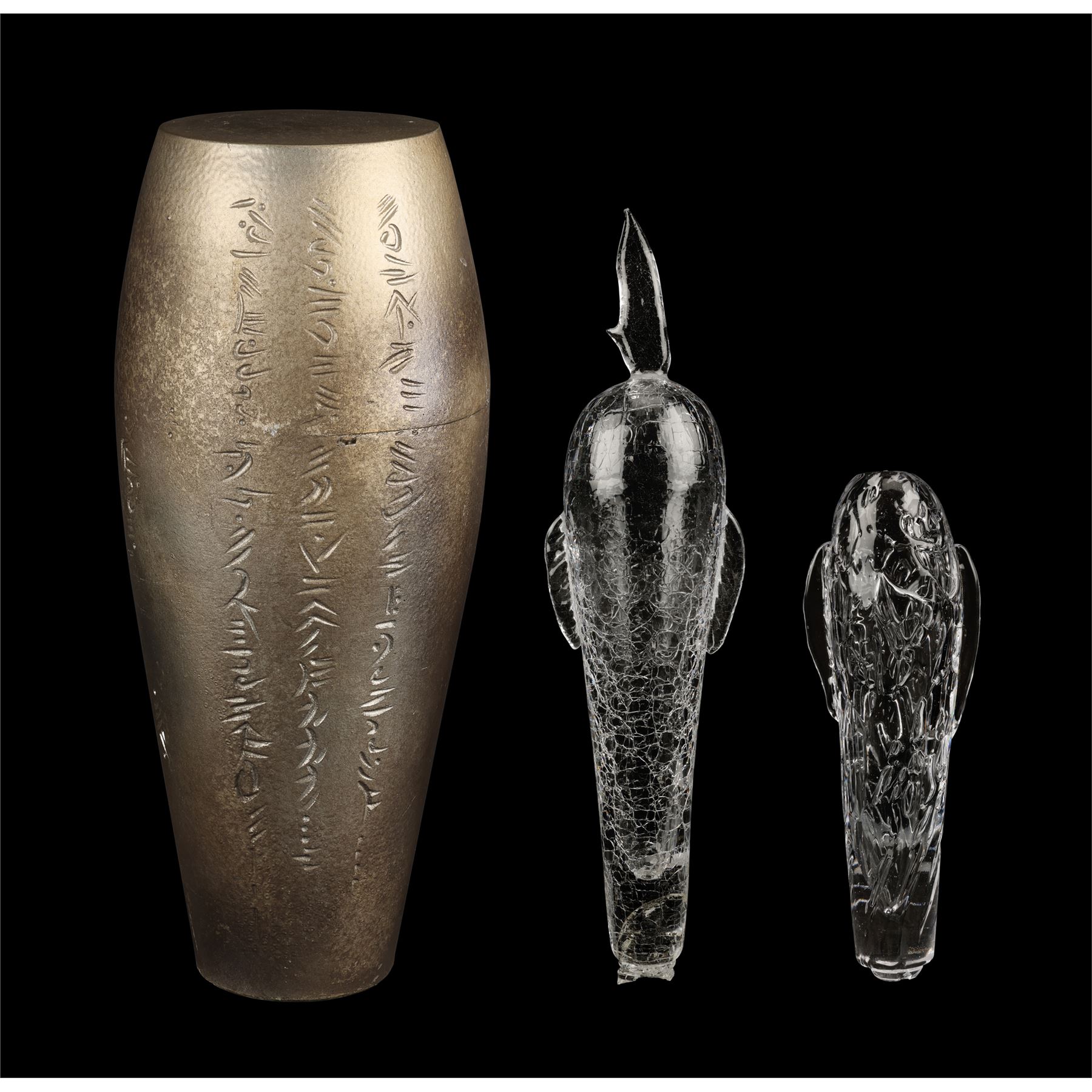 The two prototype vials were created as part of the process of developing the final onscreen aesthetic. They are made from transparent glass and feature detailed engravings to appear extra-terrestrial. Each ampule exhibits intentional distressing. Dimensions (ampule): 17.50" x 6.50" x 6.50" (44.25 cm x 16.50 cm x 16.50)