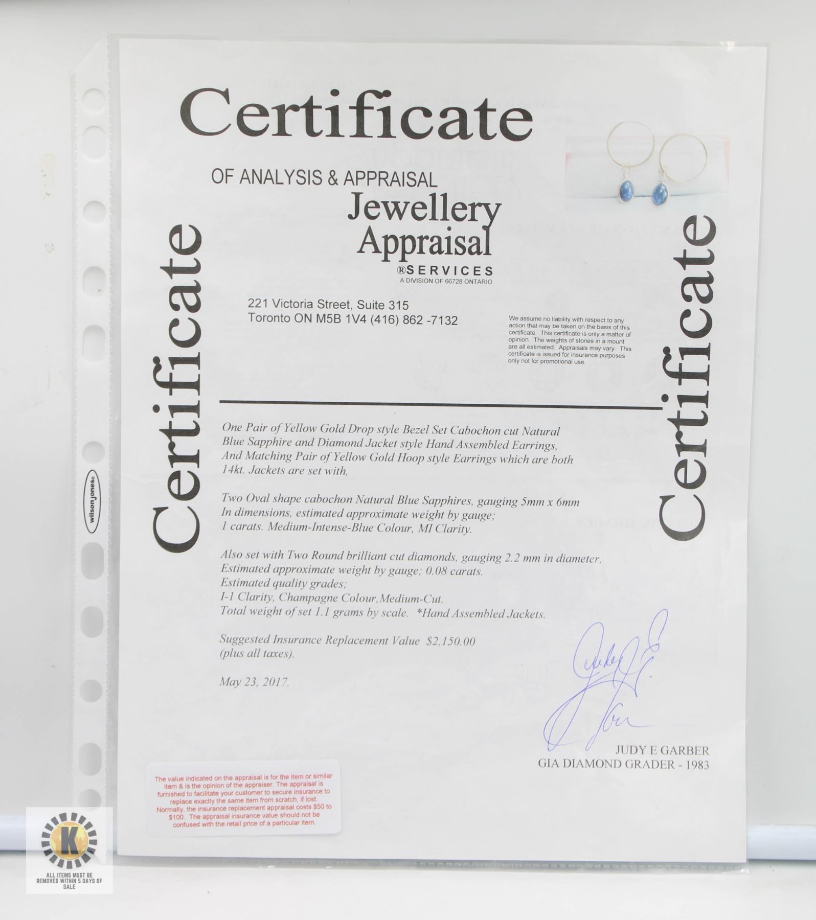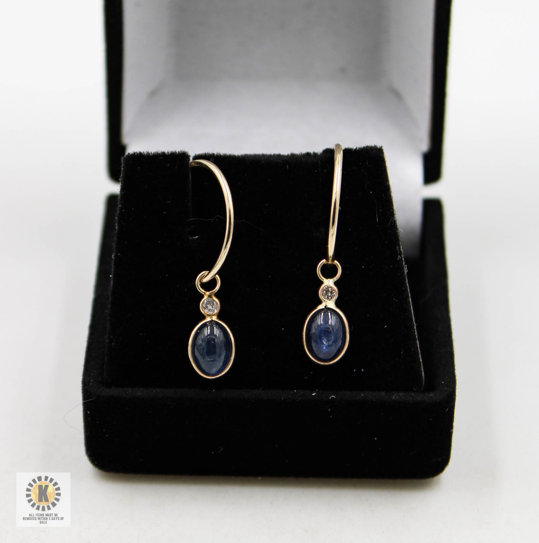 5 X 6 MM OVAL SHAPED CABOCHON WEIGHING 1 CT WITH 2 NATURAL ROUND BRILLIANT CUT DIAMONDS WEIGHING 0.08 CTS 1-2 WITH THE EARRINGS BEING HAND ASSEMBLED IN 14 KT YELLOW GOLD REPLACEMENT VALUE $2,150.00