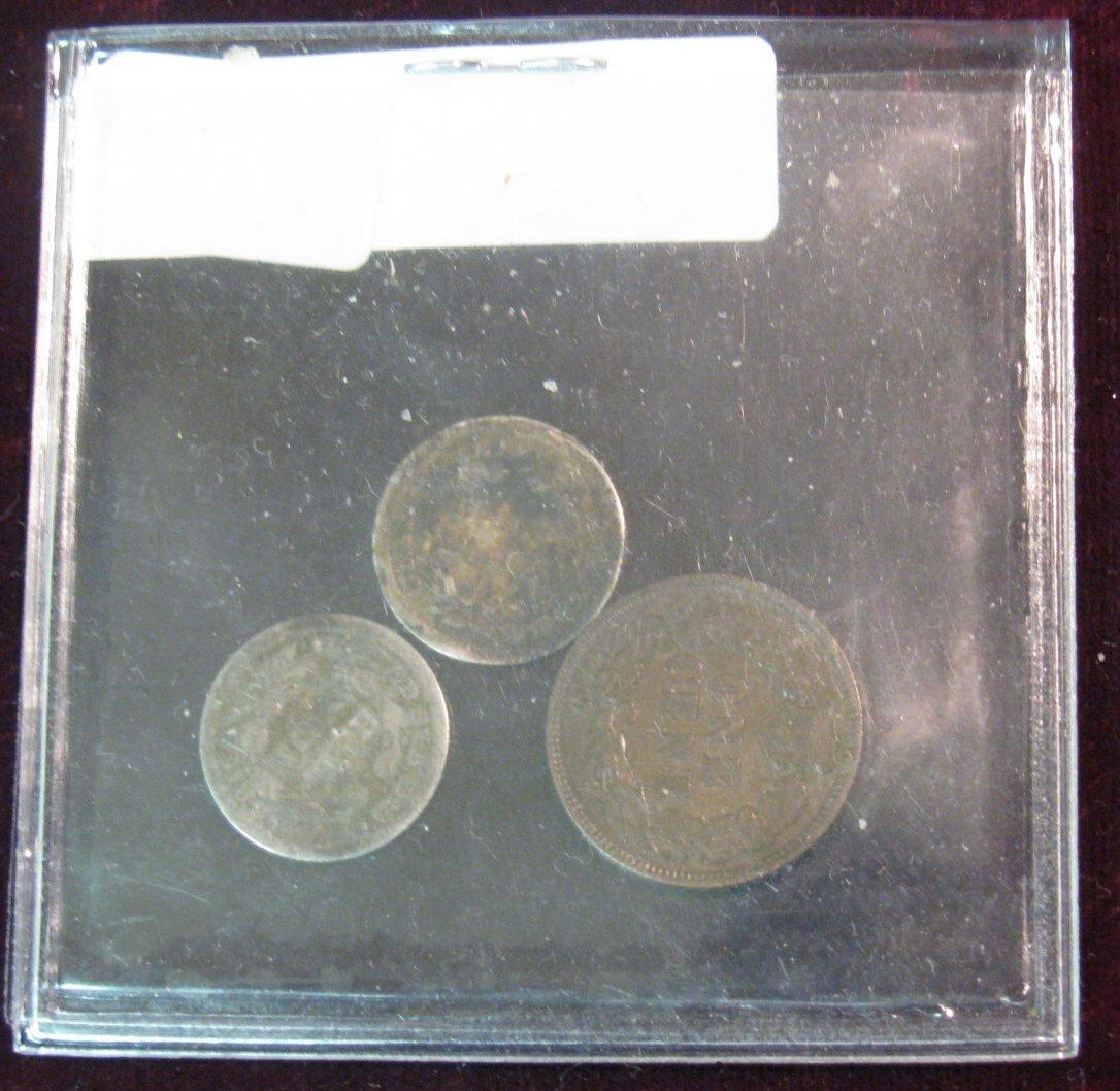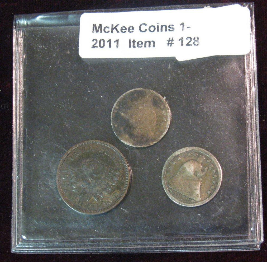 128. 1901 Indian Cent VF; 1853 & 1859 Seated Liberty Half Dimes (low grade).